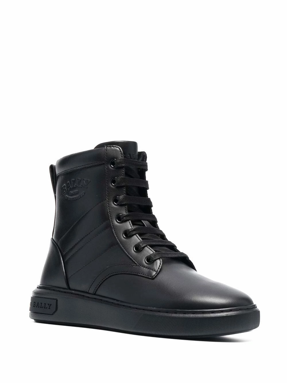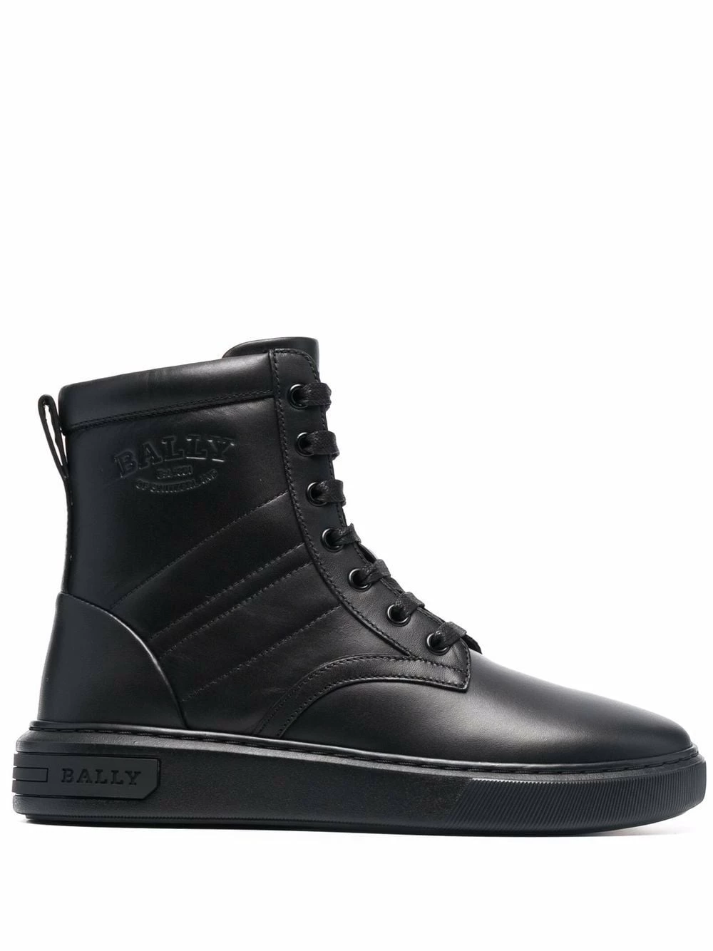 Bout rond, fermeture à lacer sur le devant, fermeture zippée sur le côté, logo embossé sur le côté, semelle plate en caoutchouc. Couleur : noir. Matière : cuir de veau.