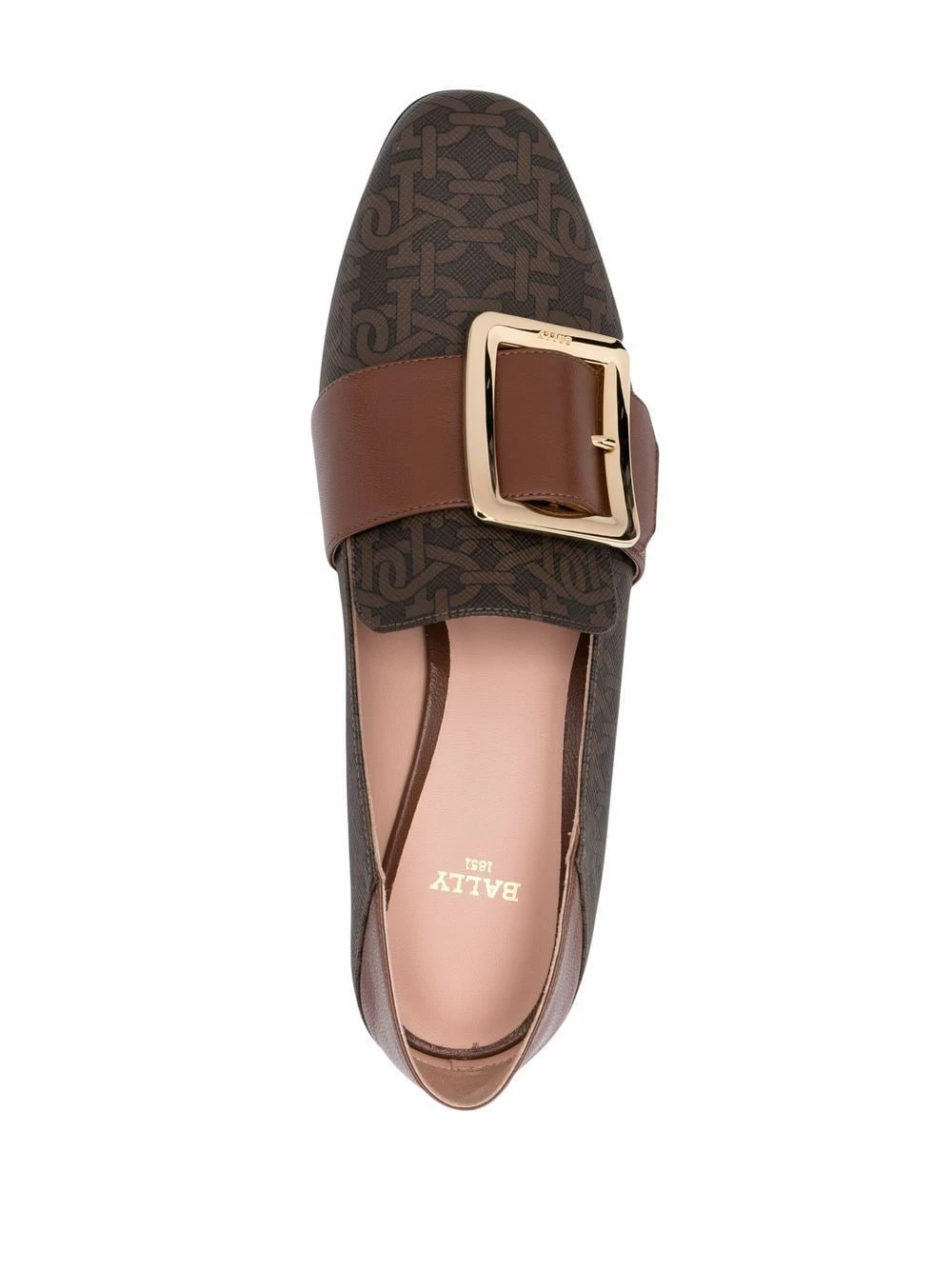 Imprimé monogrammé, bout en amande, fermeture à boucle, contrefort contrastant, talon mi-haut épais. Matière : cuir.