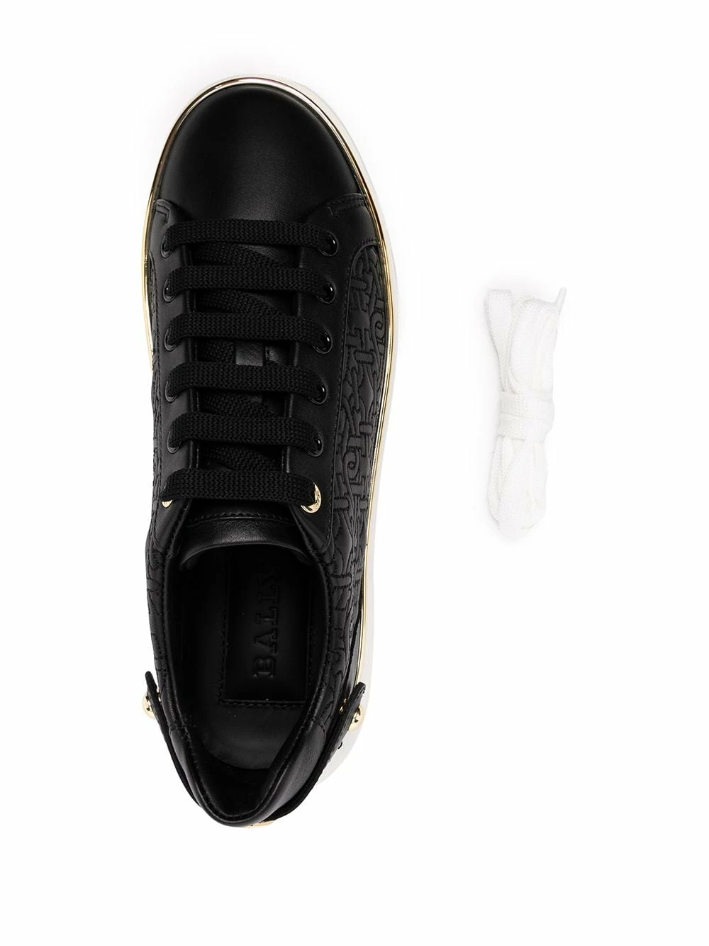 Plaque logo dorée, motif monogrammé brodé, languette à logo embossé, bout rond, fermeture à lacer sur le devant, semelle intérieure à logo, semelle plate en caoutchouc. Couleur : noir. Matière : cuir.