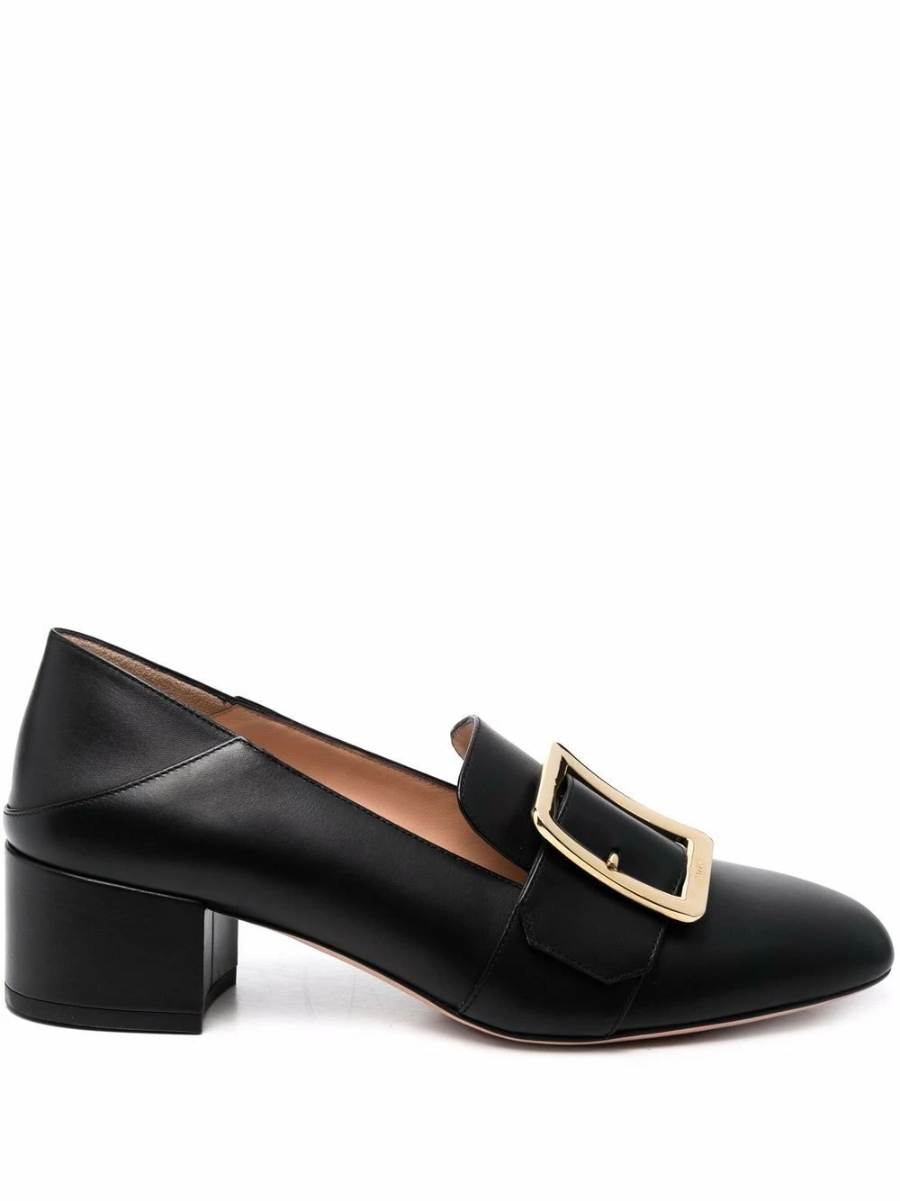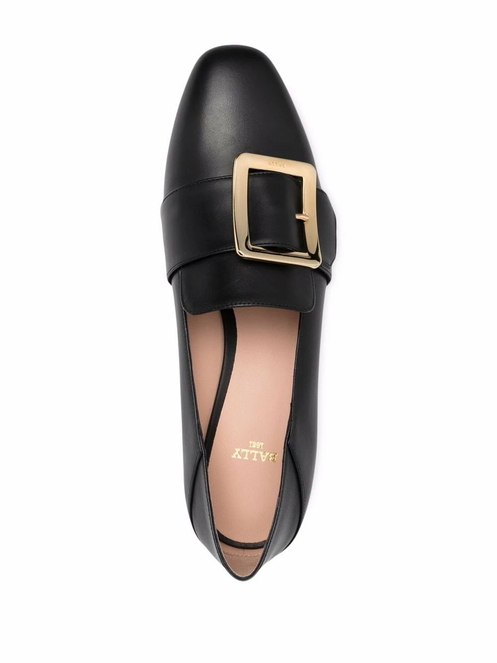 Détail de boucle décorative, talon repliable, design à enfiler, bout en amande, semelle intérieure griffée. Couleur : noir. Matière : cuir.