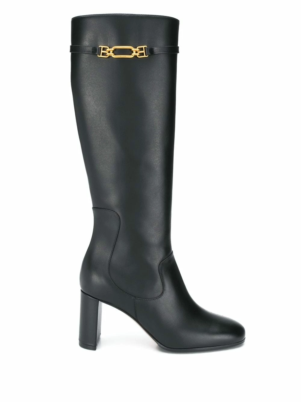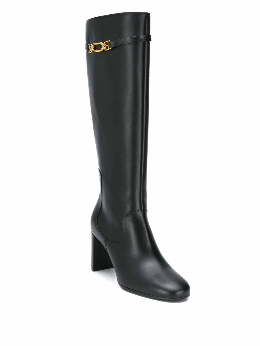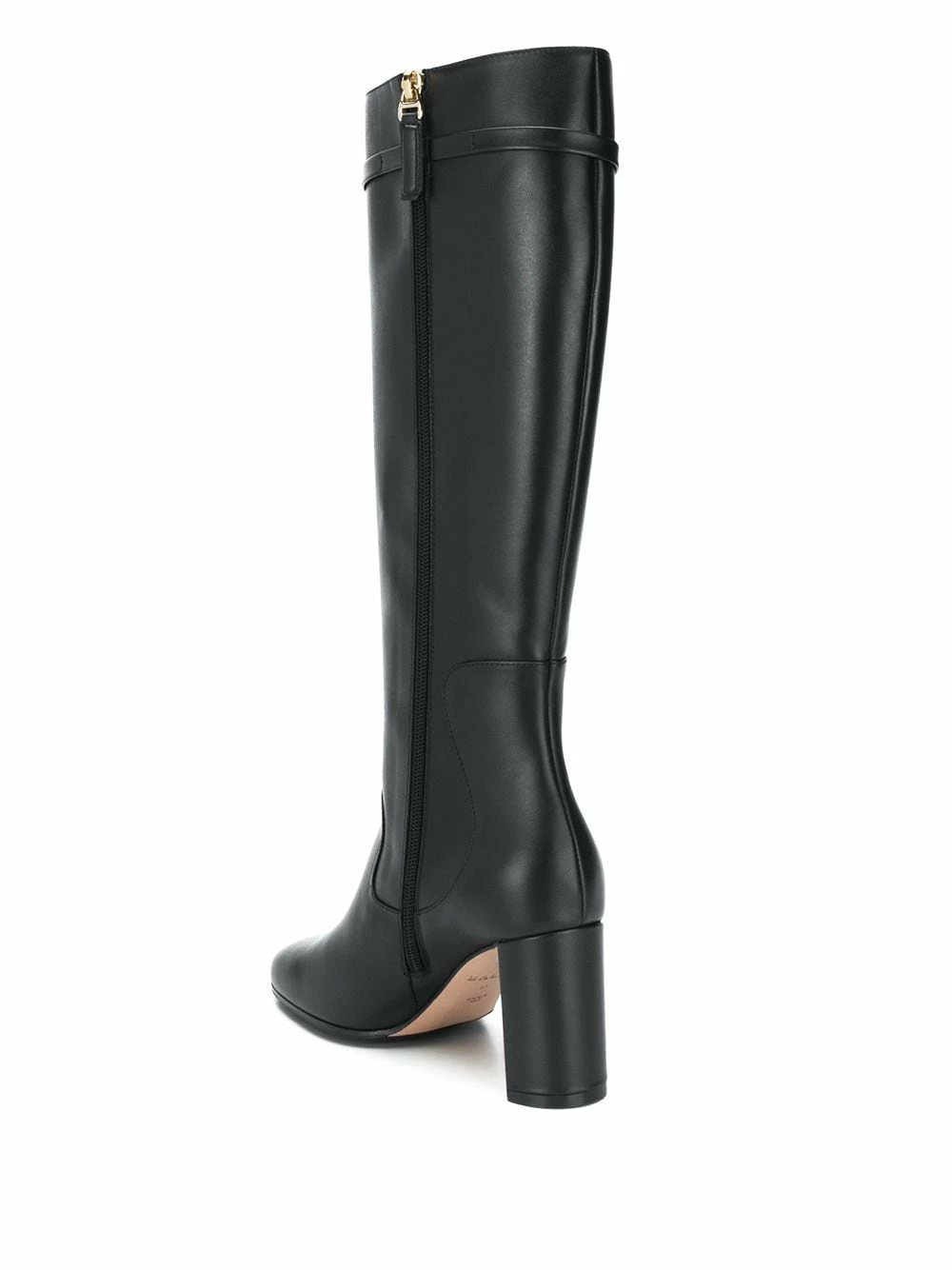 Longueur genou, fermeture zippée sur le côté, bout rond, talon haut épais. Couleur : noir.