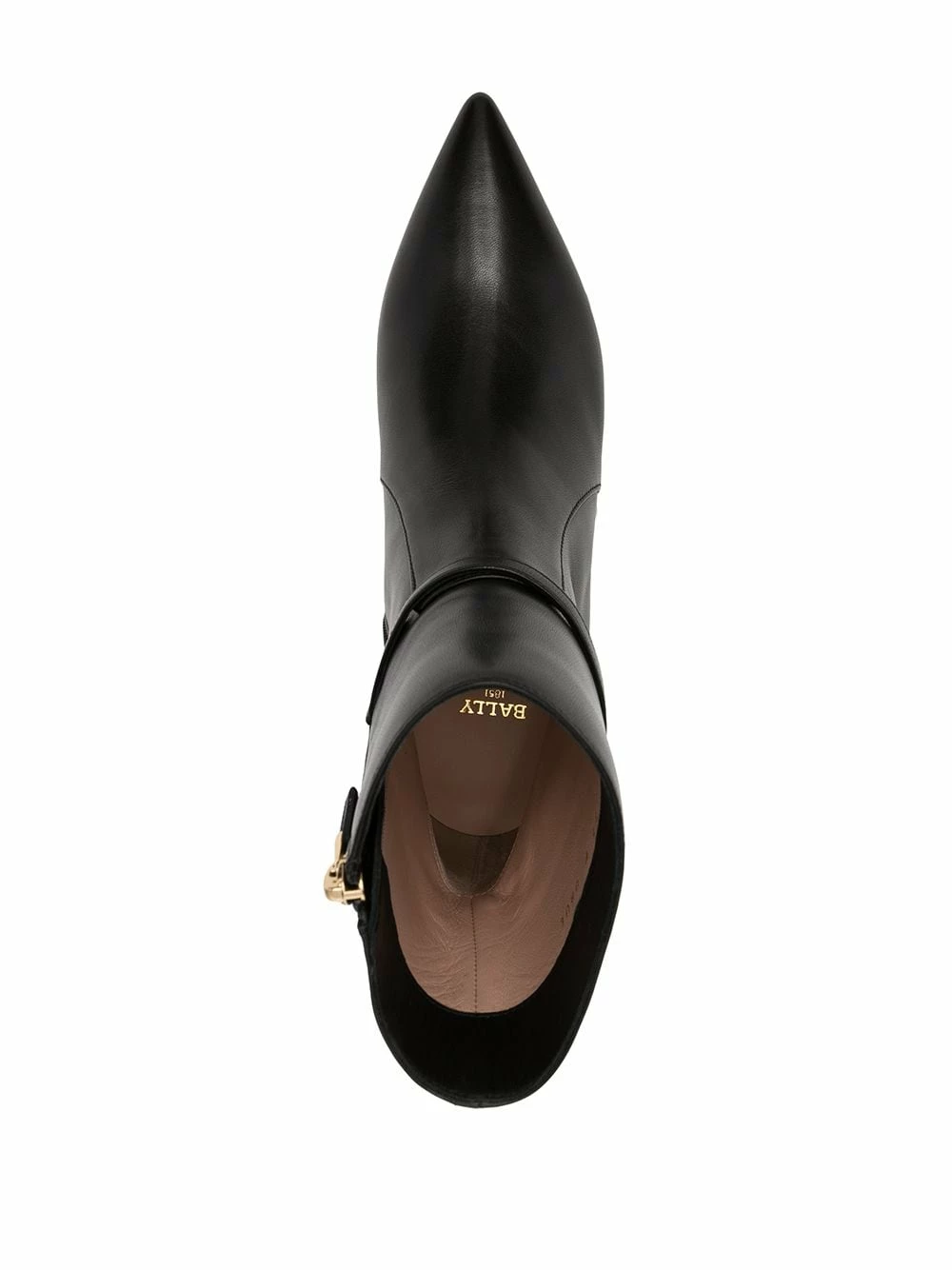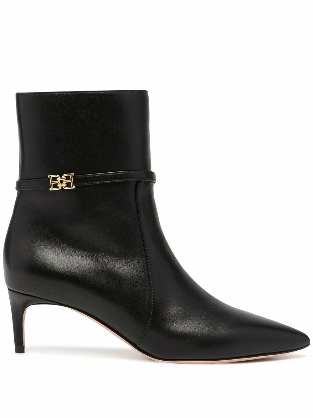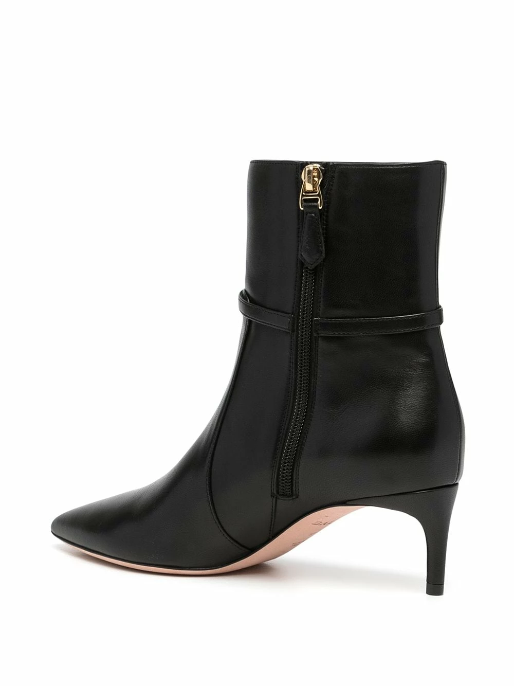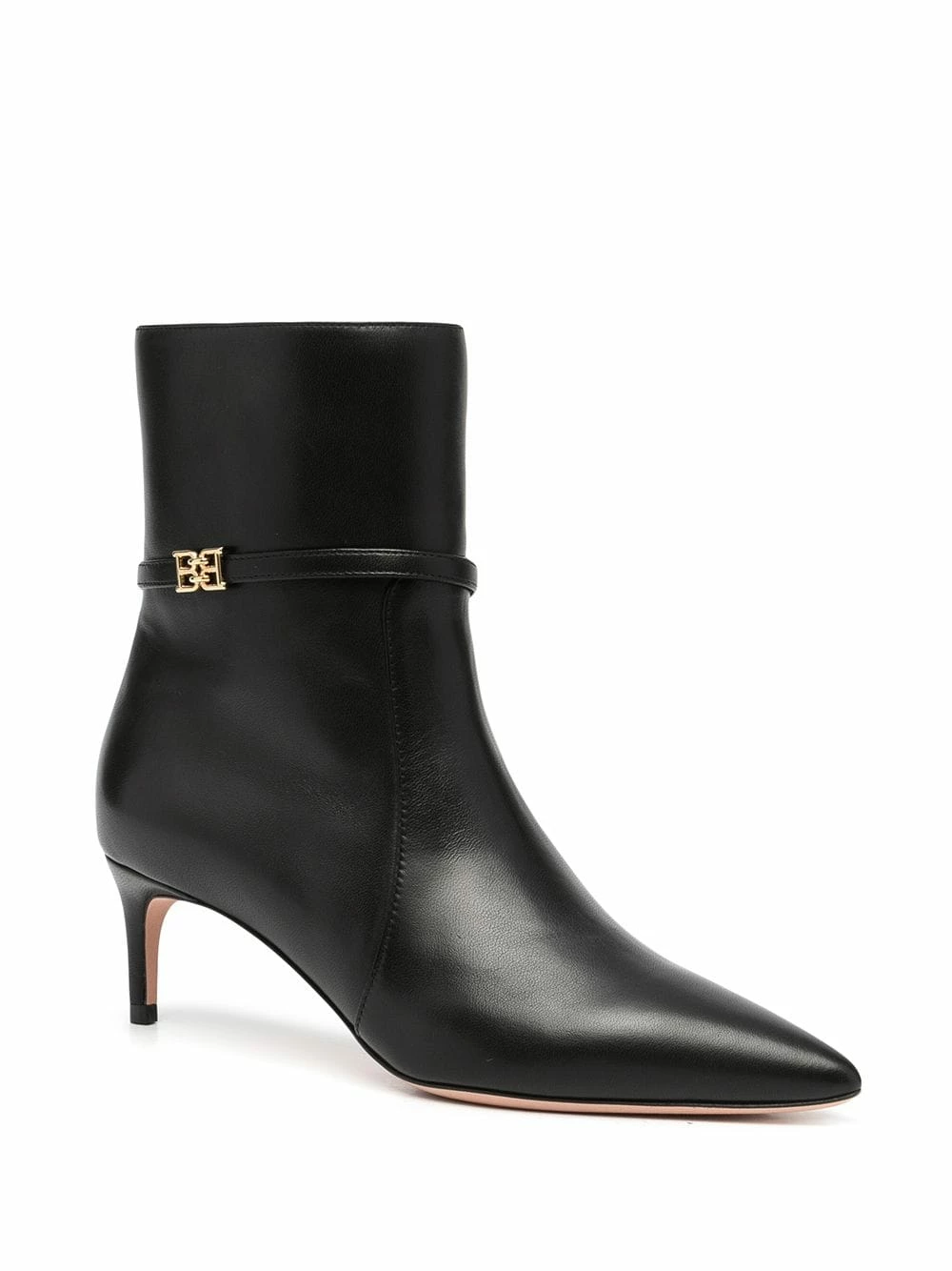 Noir, cuir, fermeture zippée sur les côtés, plaque logo dorée, bout pointu, petit talon.