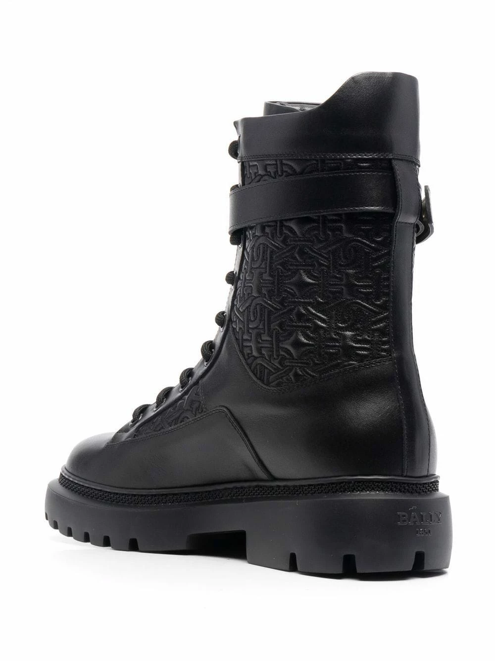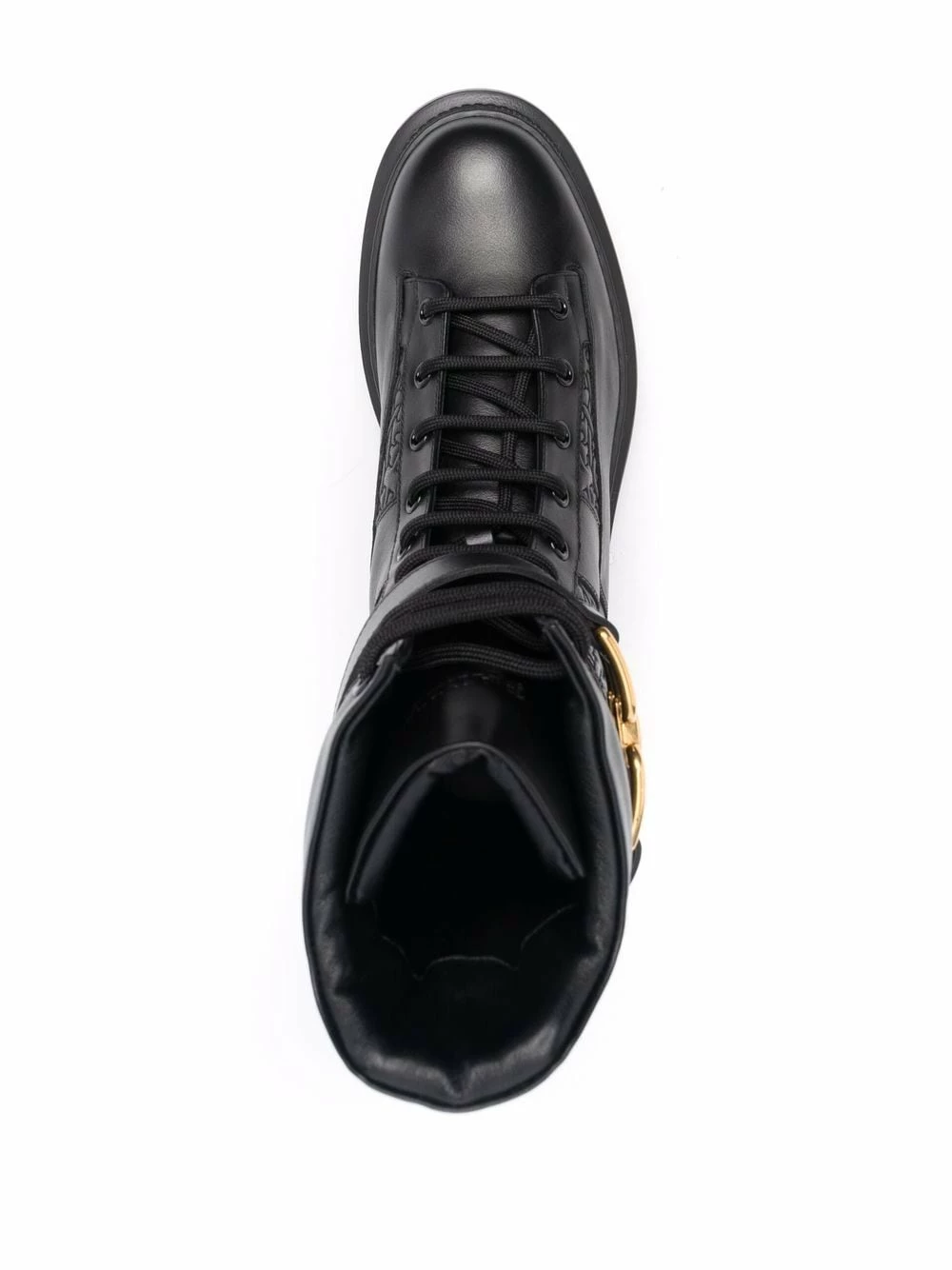 Fermeture à boucle logo, bout rond, fermeture à lacer sur le devant, hauteur cheville, semelle crantée en caoutchouc. Couleur : noir. Matière : cuir.