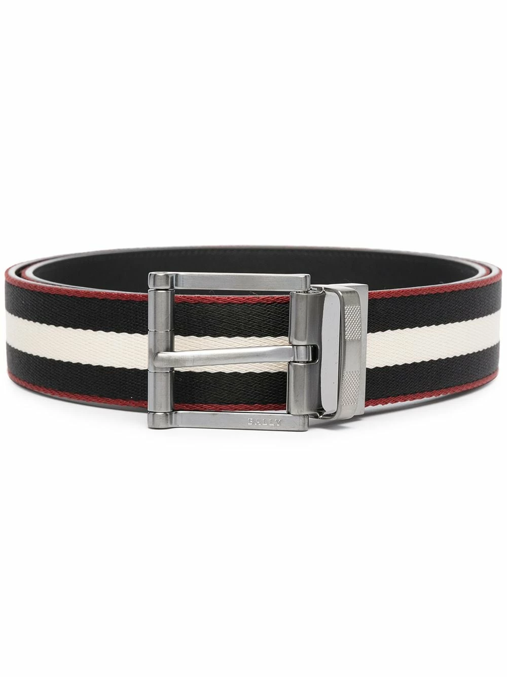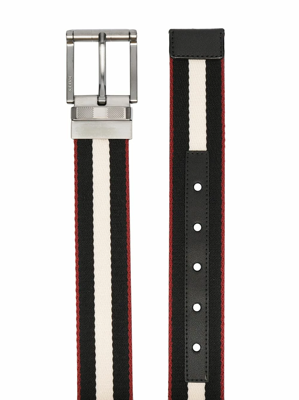 Détails rayés, design réversible, fermeture à boucle argentée, détails de perforation, taille ajustable. Matière : cuir.
