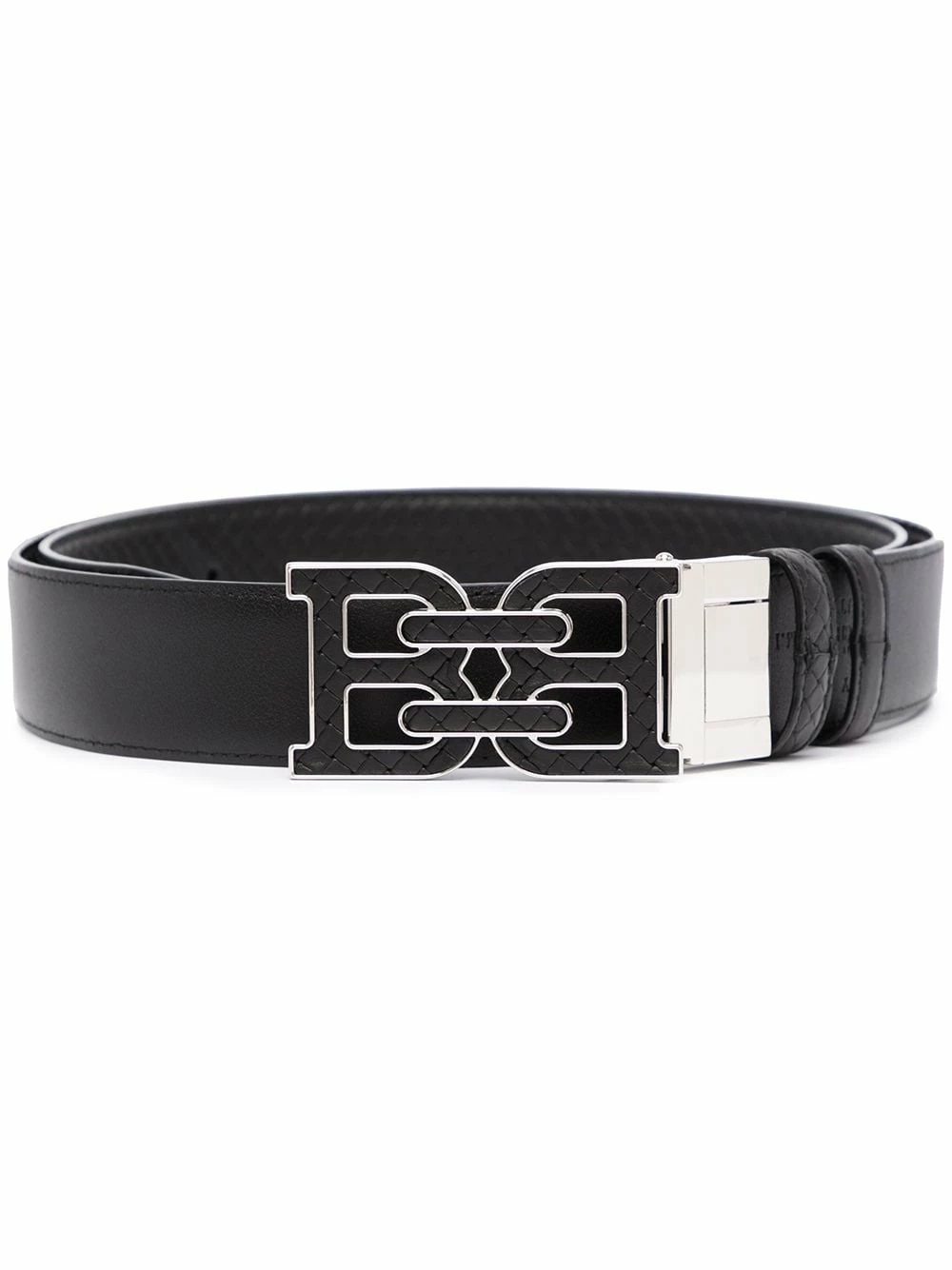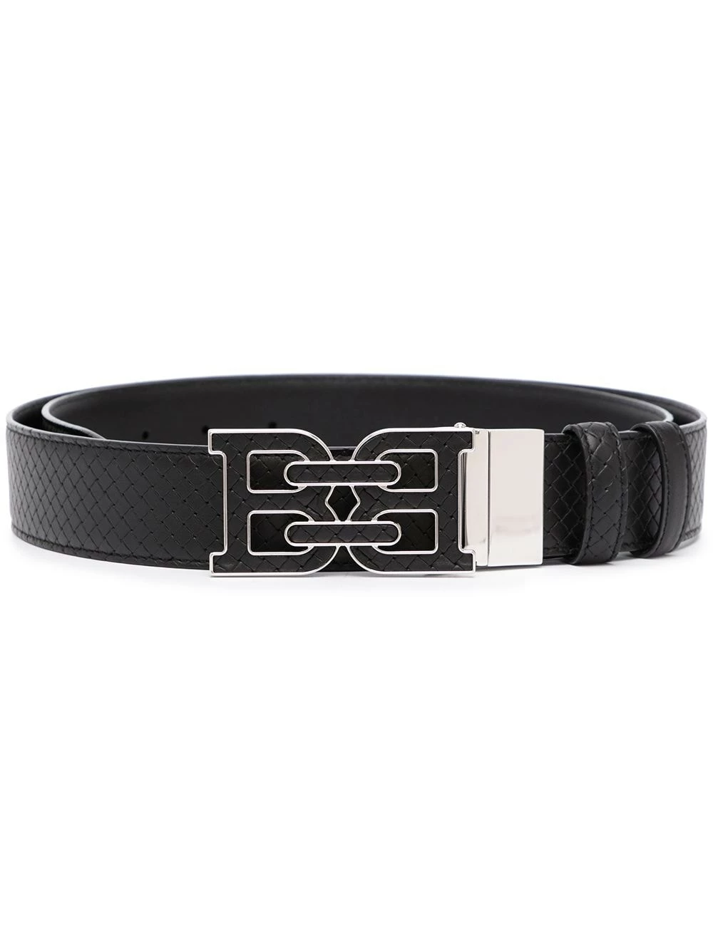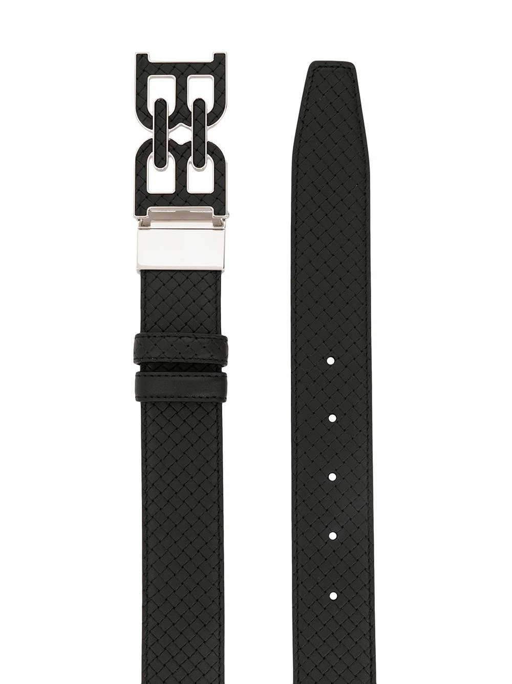 Détail de boucle à logo, taille ajustable, fini texturé. Couleur : noir. Matière : cuir.