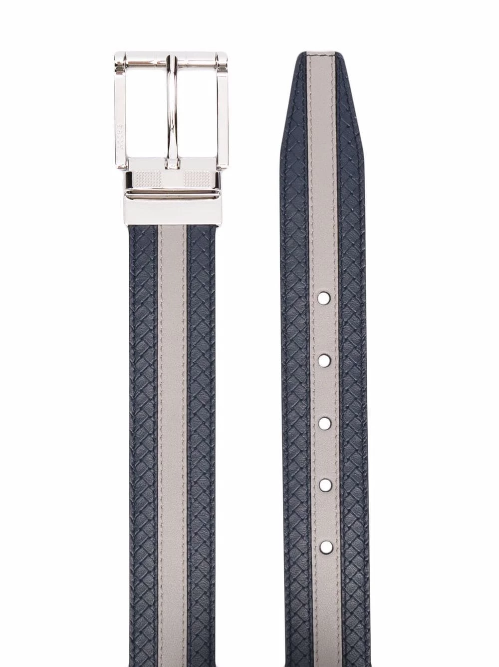 Fermeture à boucle sur le devant, bordure rayée, taille ajustable, détails de perforation. Couleur : bleu. Matière : cuir.