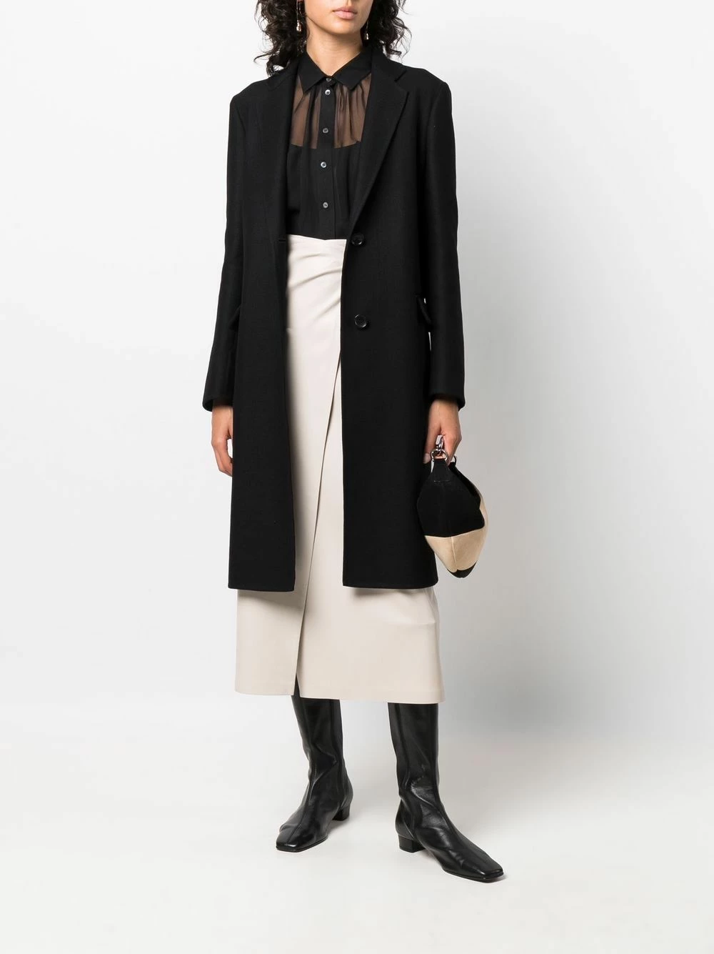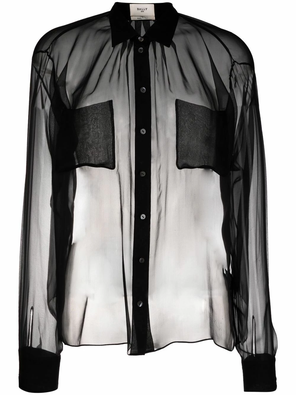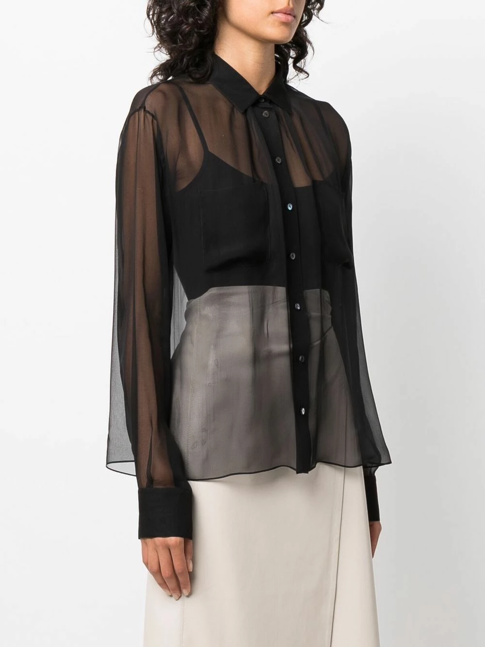 Effet de transparence, col classique, boutonnière sur le devant, manches longues. Couleur : noir. Matière : soie.