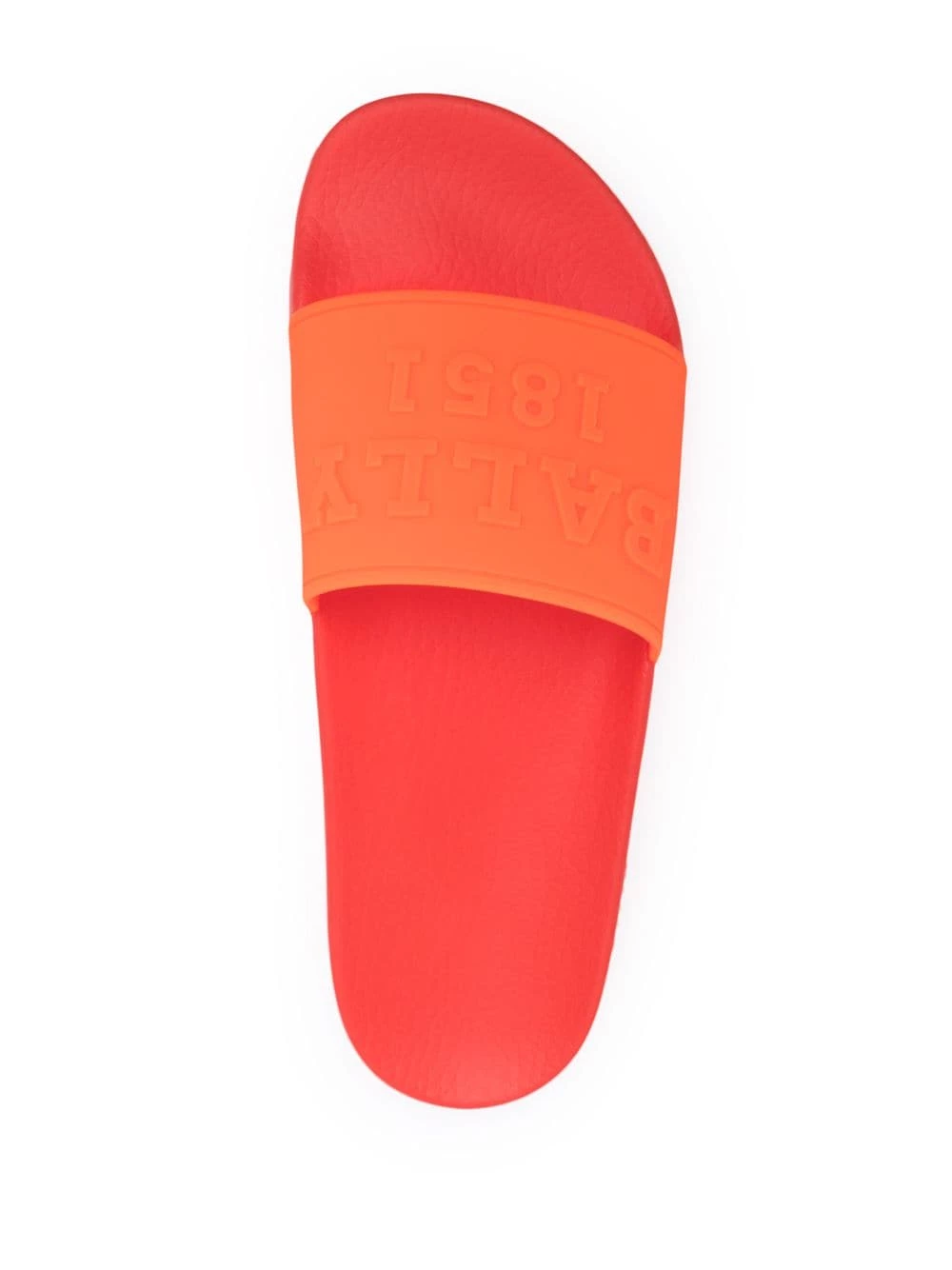 Bride à logo embossé, bout ouvert, bout asymétrique, design à enfiler, semelle en caoutchouc. Couleur : orange.