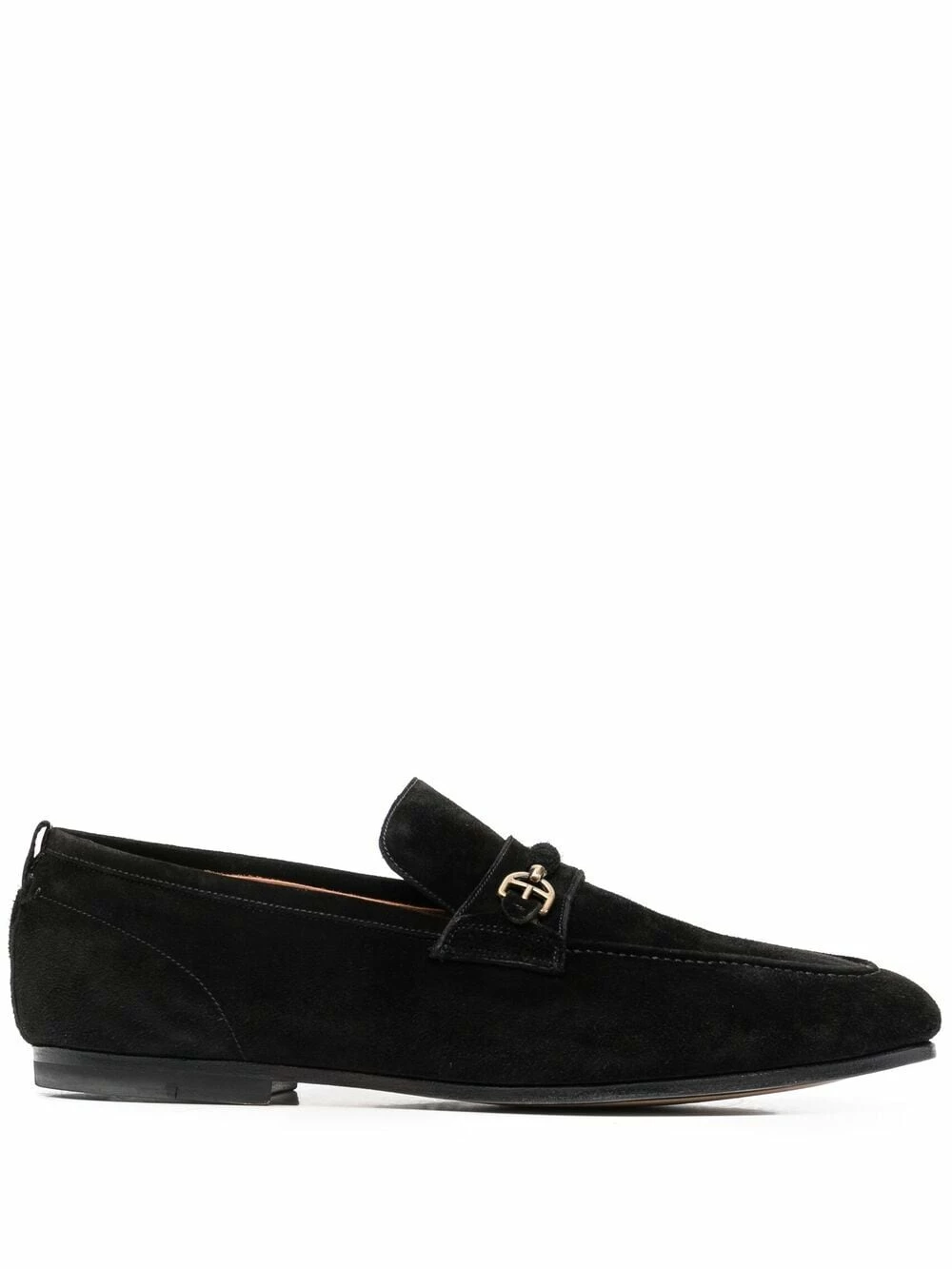 Semelle plate en caoutchouc, bout en amande, finitions en métal doré. Couleur : noir.