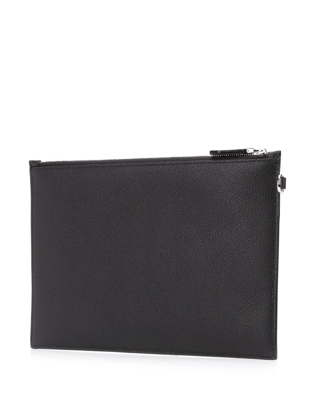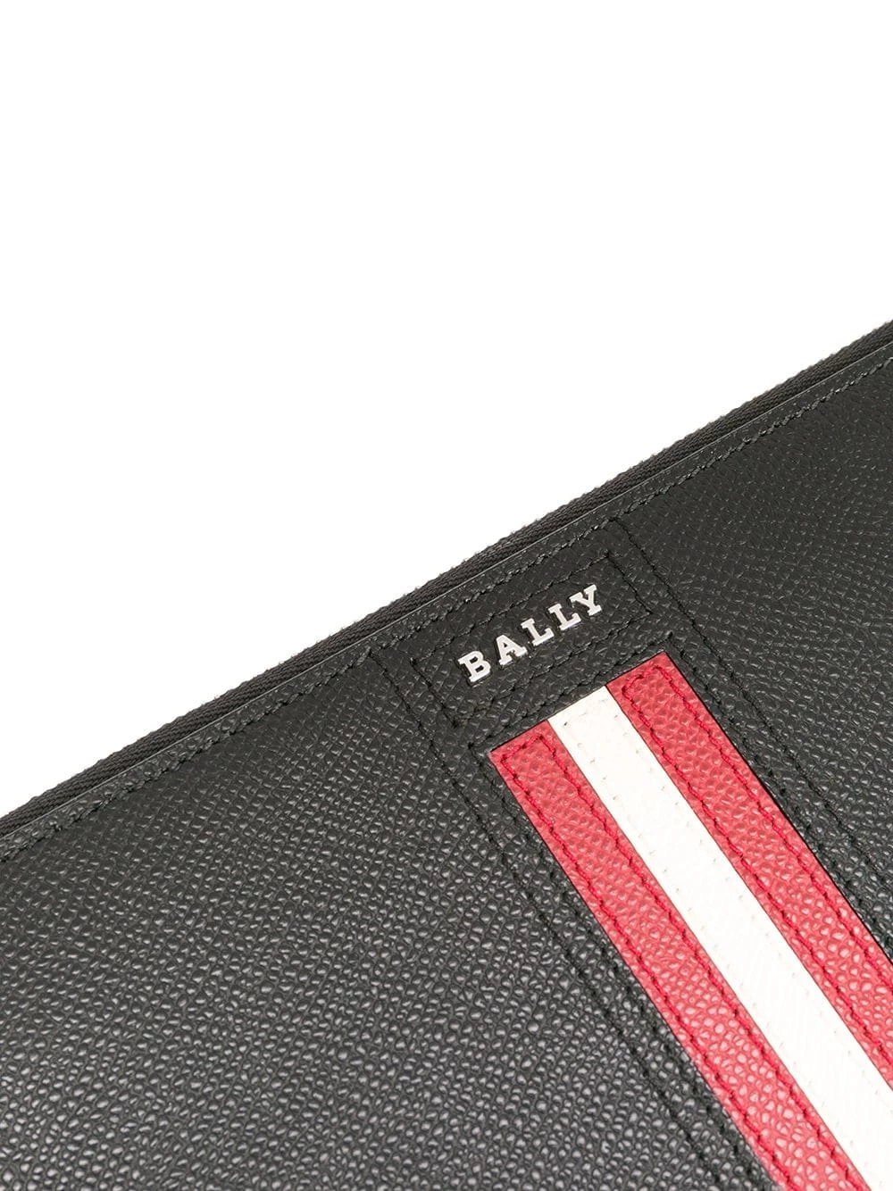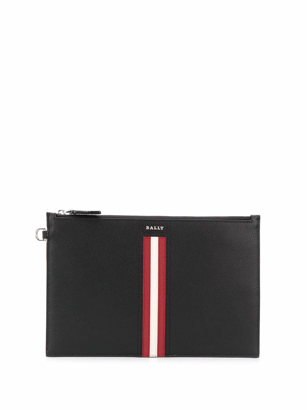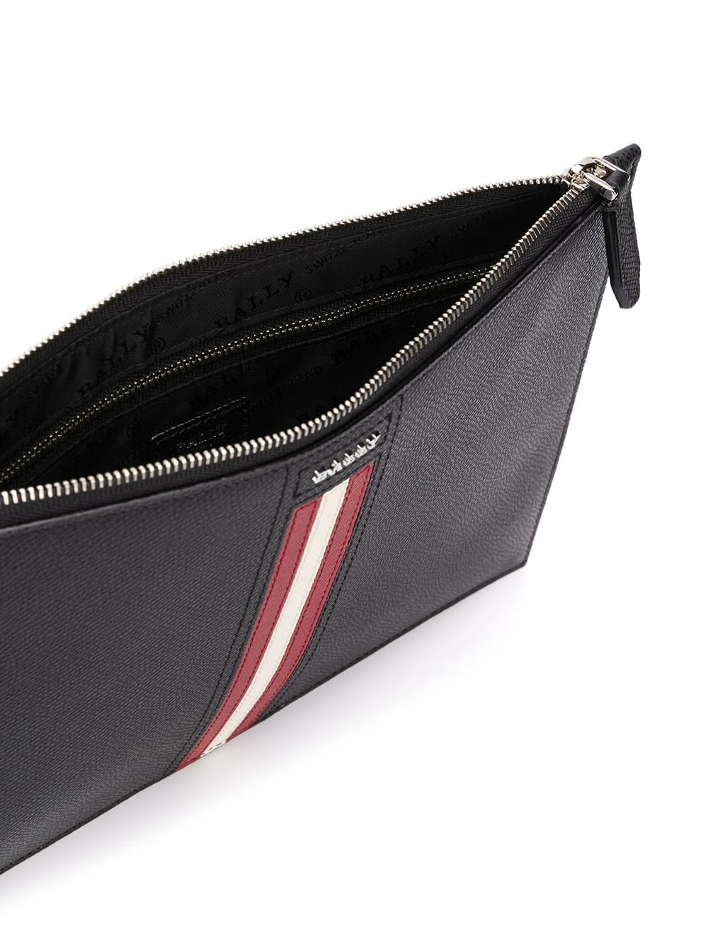 Pochette à détail rayé en cuir Bally avec compartiment intérieur, poche intérieure zippée et fermeture zippée sur le dessus. Couleur : noir.
