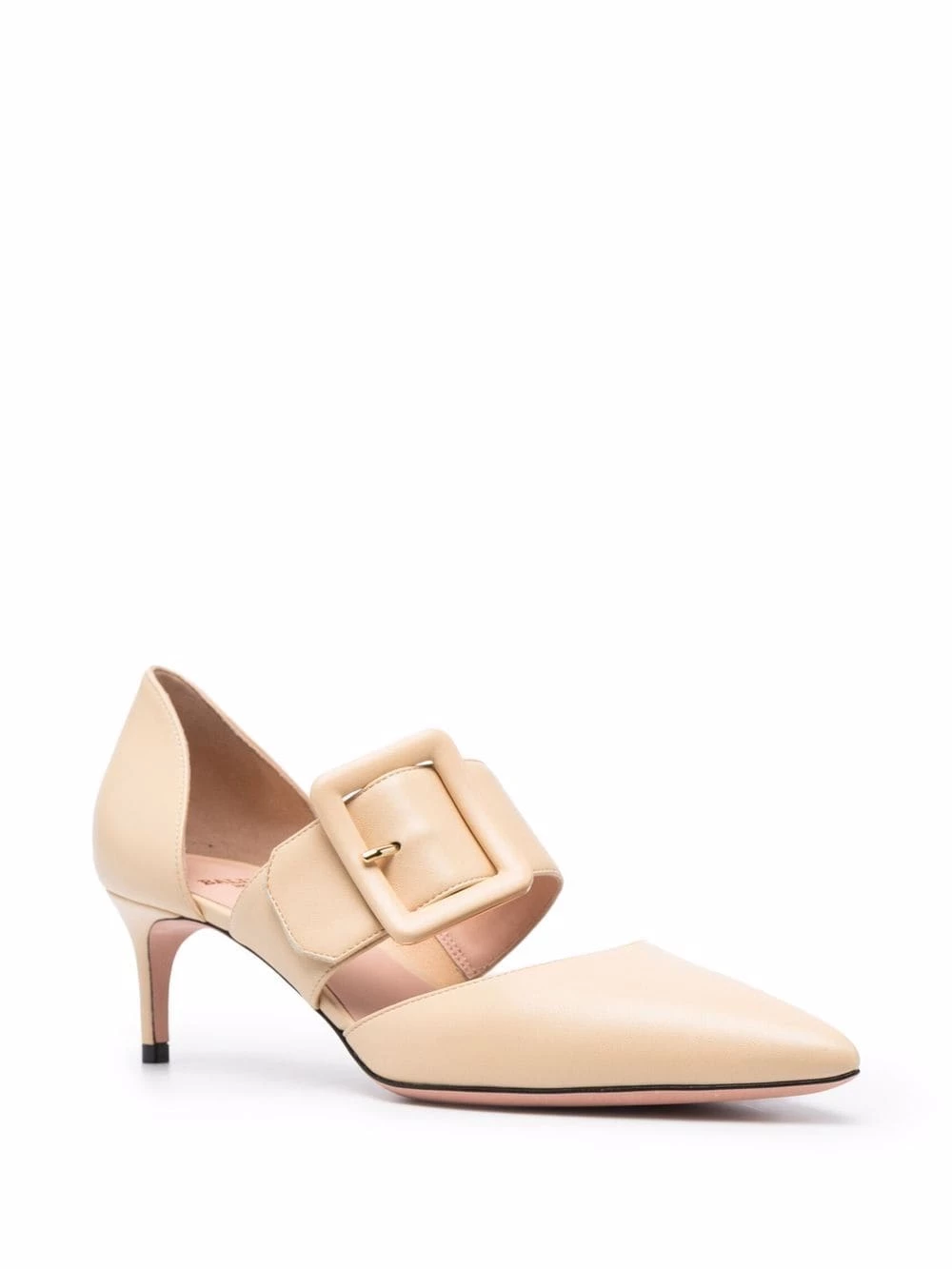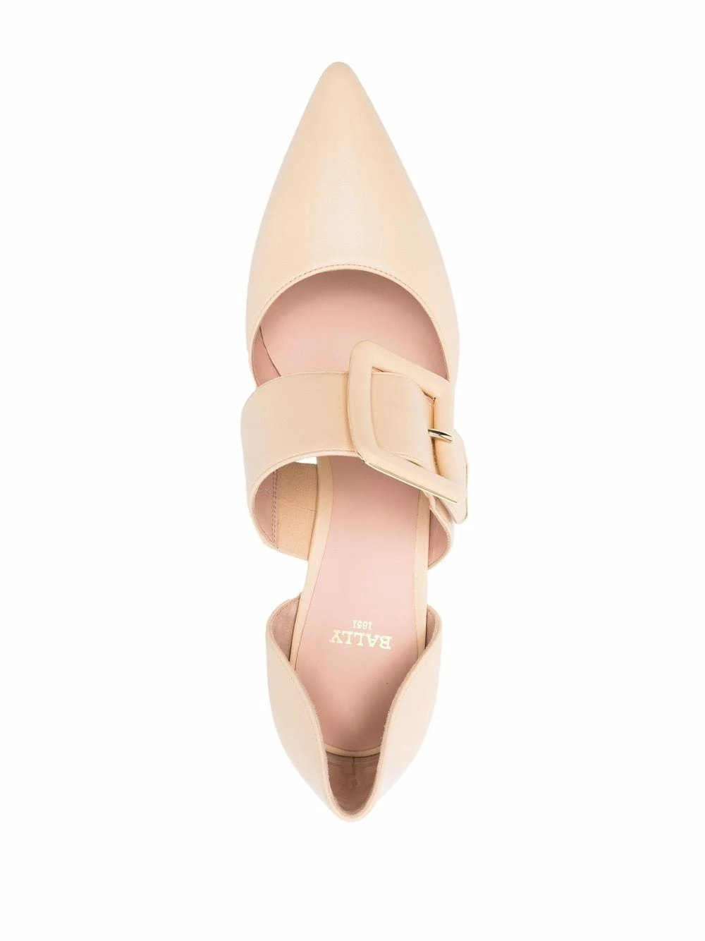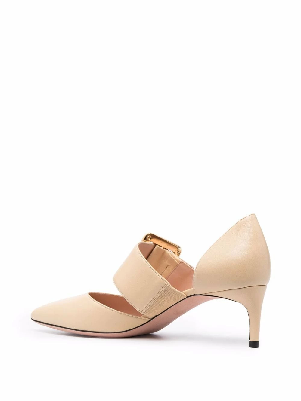 Fermeture à boucles sur les côtés, bout pointu, petit talon. Matière : cuir.