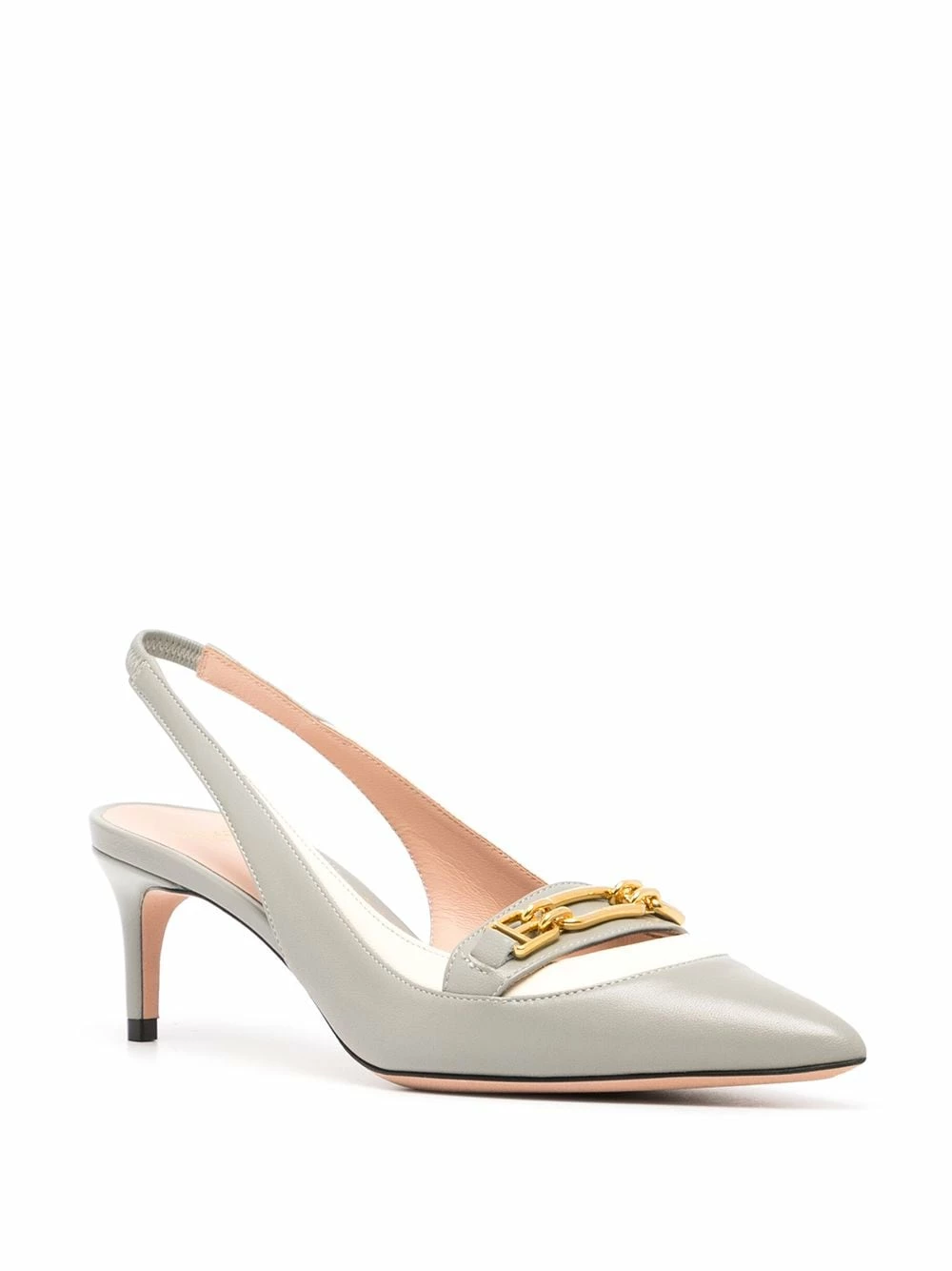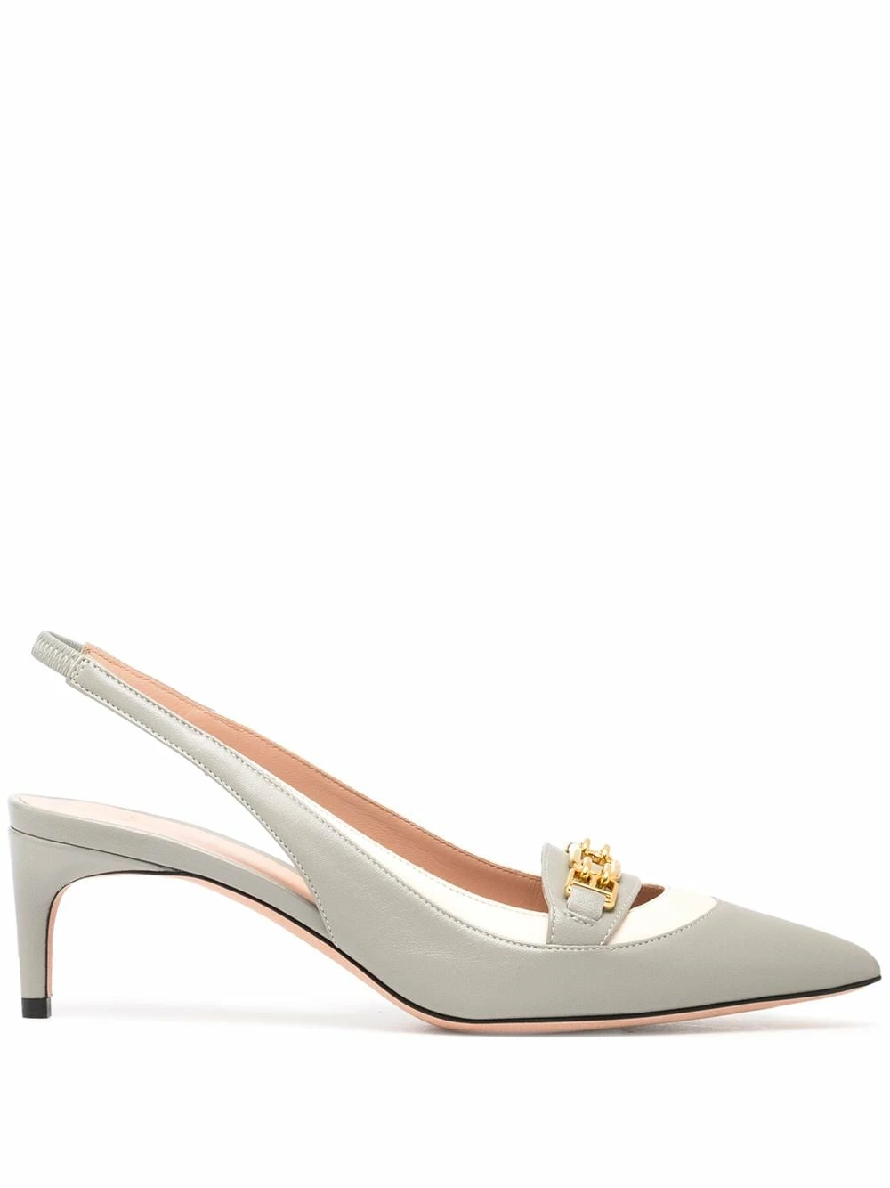 Détail de mors, bout pointu, bride arrière, petit talon, semelle intérieure à logo. Couleur : gris. Matière : cuir.