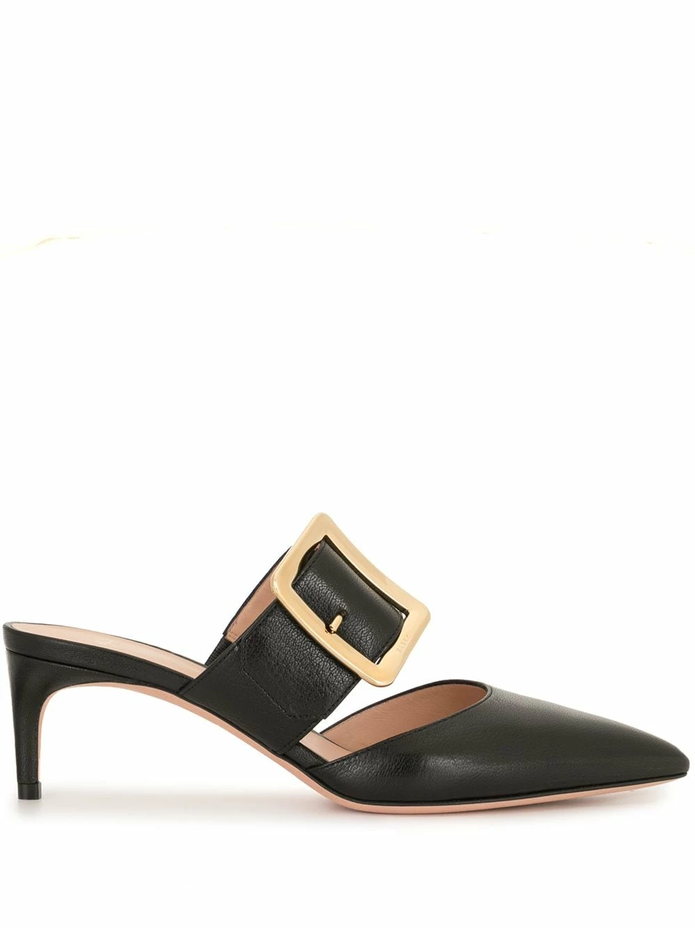 Fermeture à boucle dorée, bout pointu, semelle intérieure à logo, talon ouvert, petit talon. Couleur : noir.