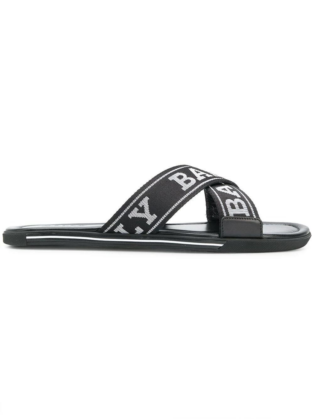 Sandales Bonks en cuir noir et blanc Bally avec semelle plate en caoutchouc, doubles bretelles et logo.
