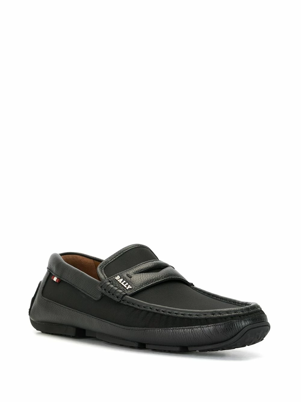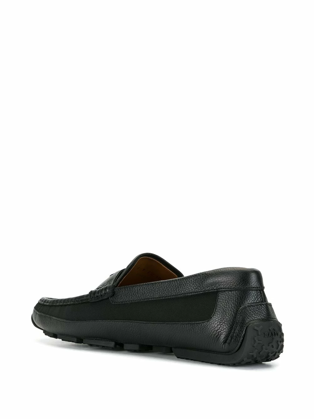 Mocassins à bords en cuir Bally avec empiècements en cuir, détail de découpe, plaque logo sur le devant, détail de coutures visibles, bout rond, semelle intérieure à logo et semelle crantée en caoutchouc. Couleur : noir.
