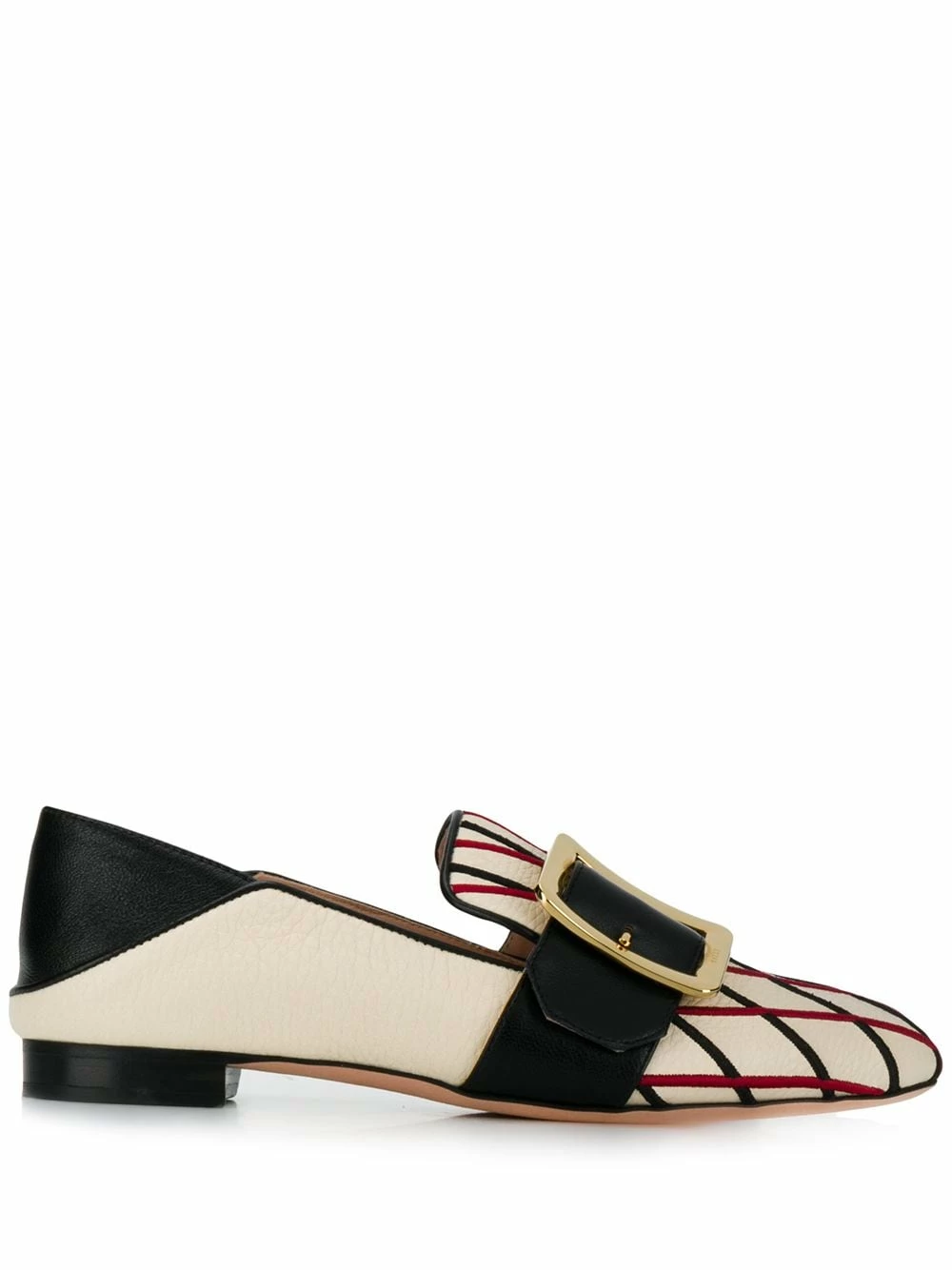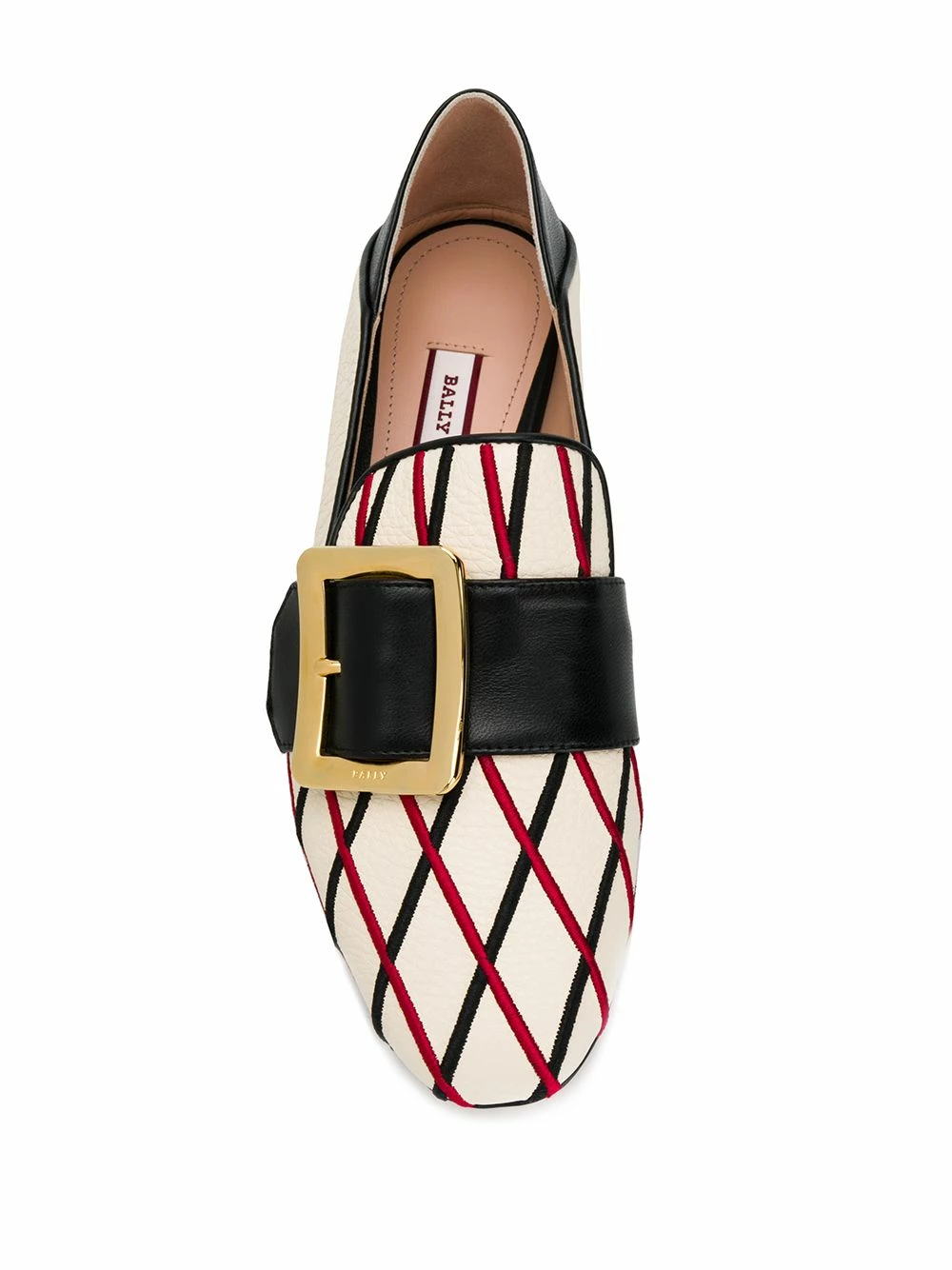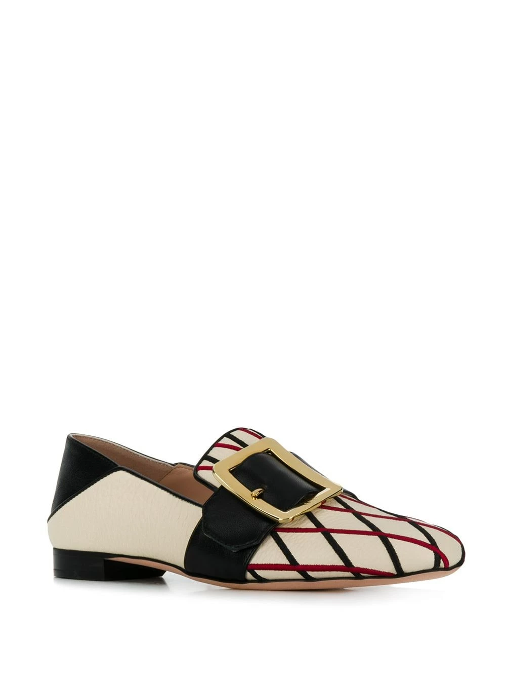 Mocassins à broderies en cuirs Bally avec bout rond, design à enfiler, boucle dorée et design à empiècements colour block. Couleur : blanc.