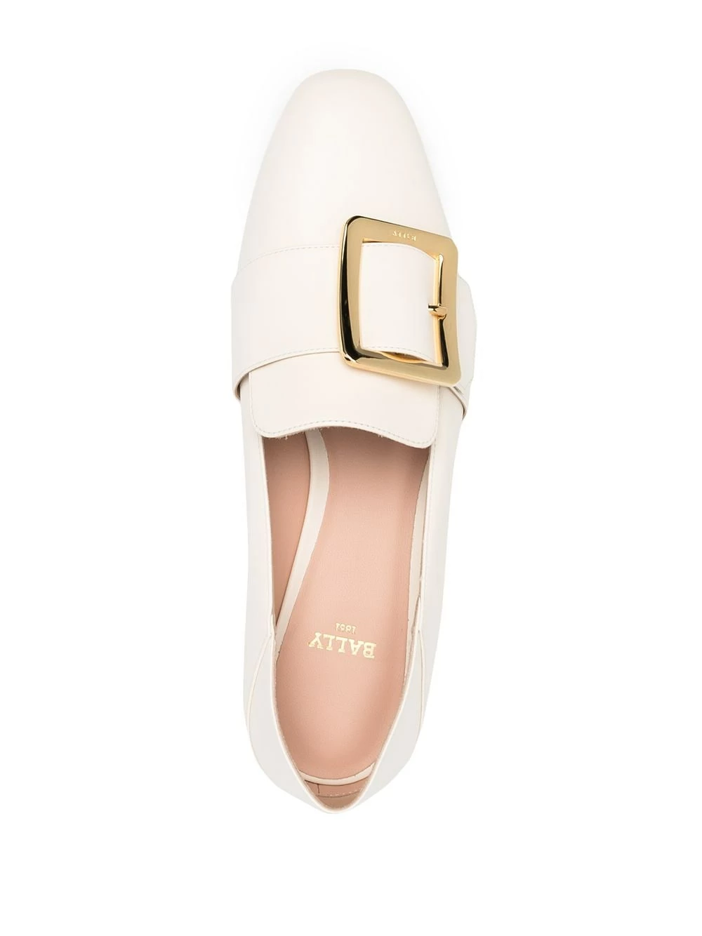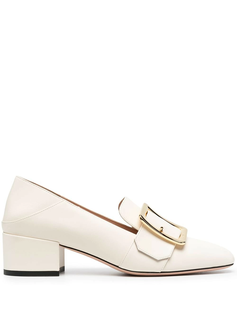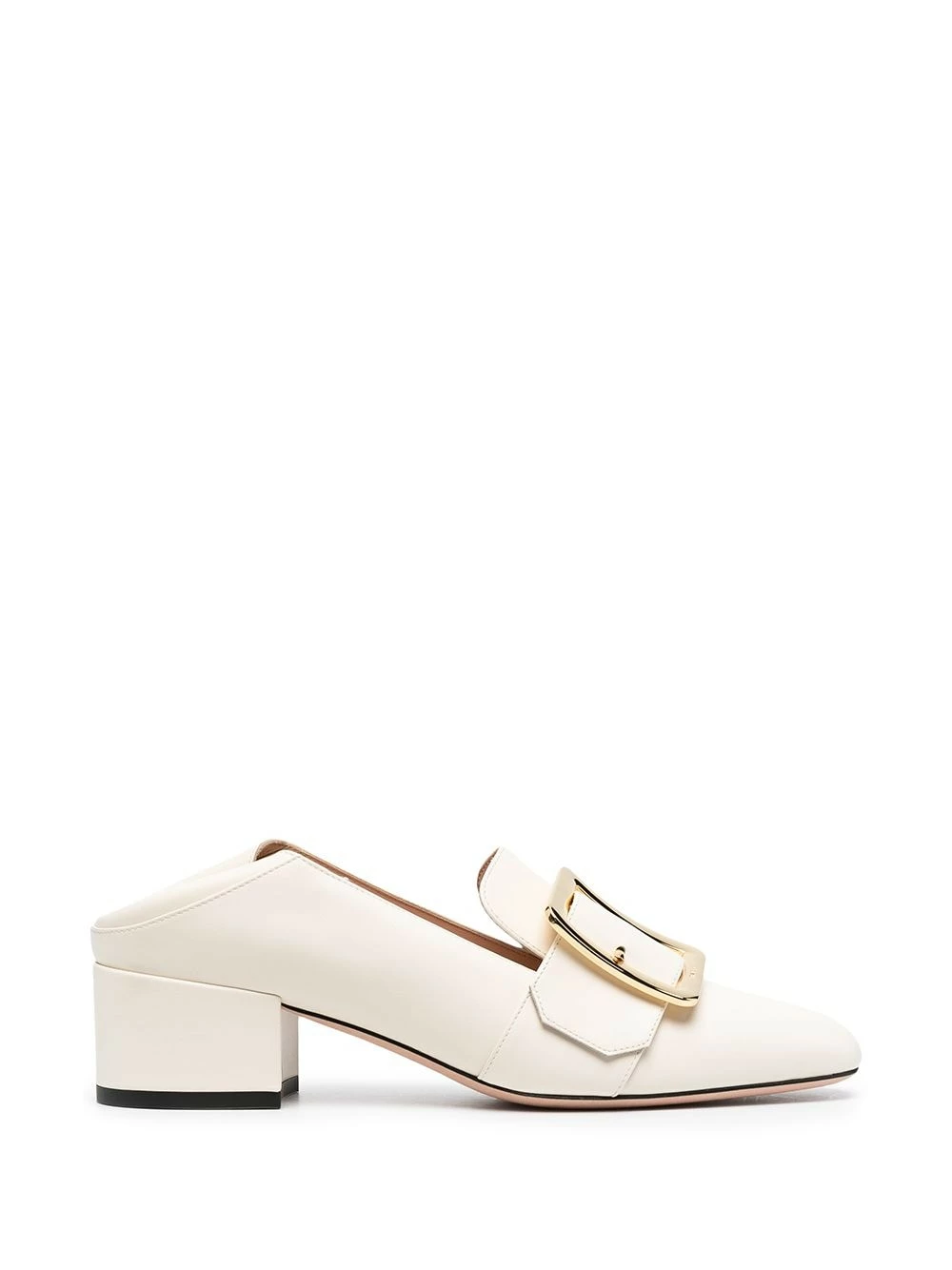 Fermeture à boucle dorée, bout rond, semelle intérieure à logo, design à enfiler, petit talon épais. Matière : cuir.