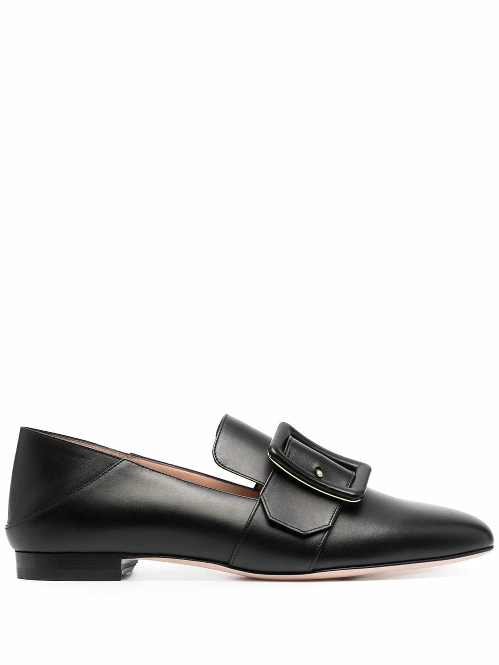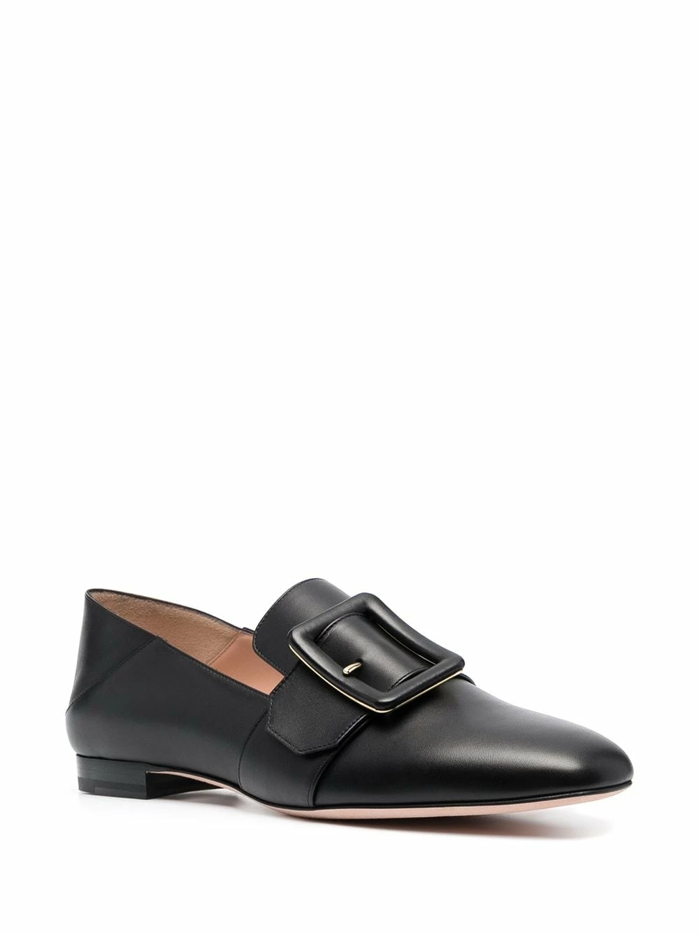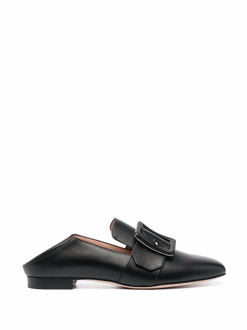 Détail de boucle décorative, semelle intérieure griffée, talon repliable, petit talon bottier, bout en amande. Couleur : Noir. Matière : cuir.