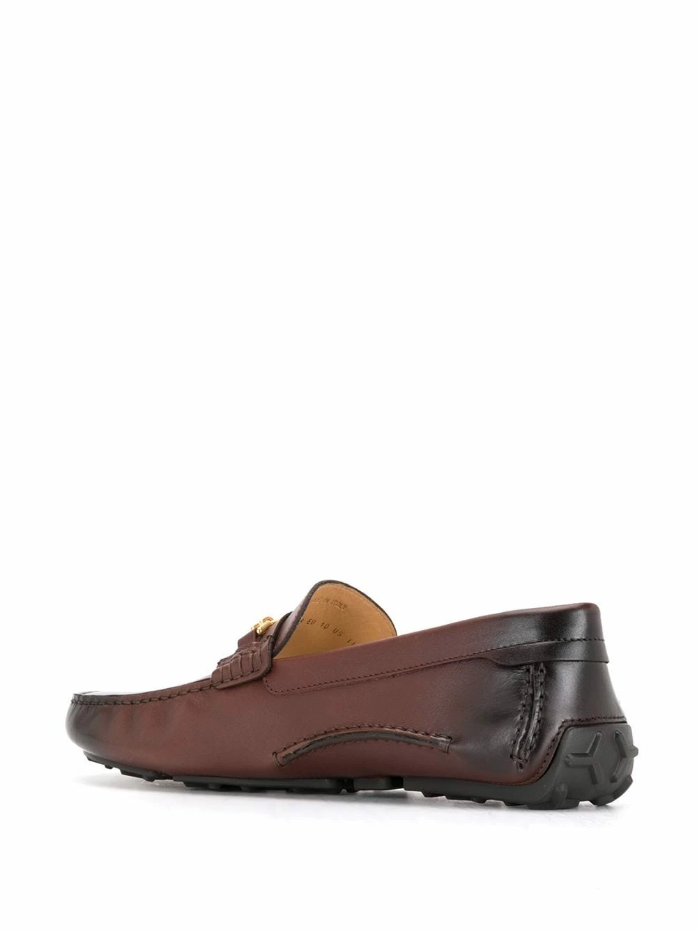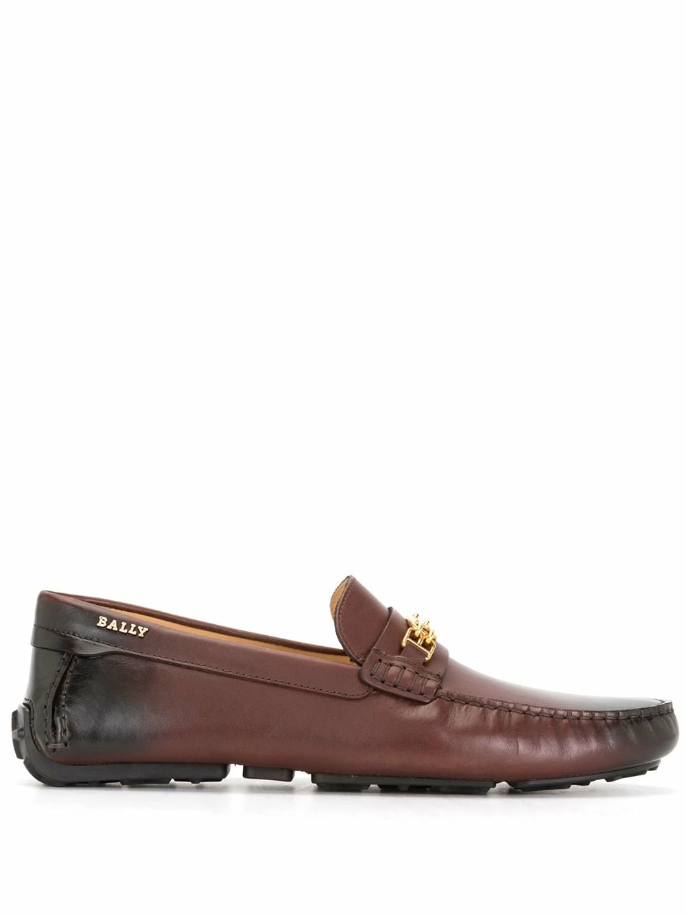 Design à enfiler, finitions en métal doré, plaque logo, bout rond. Matière : cuir.