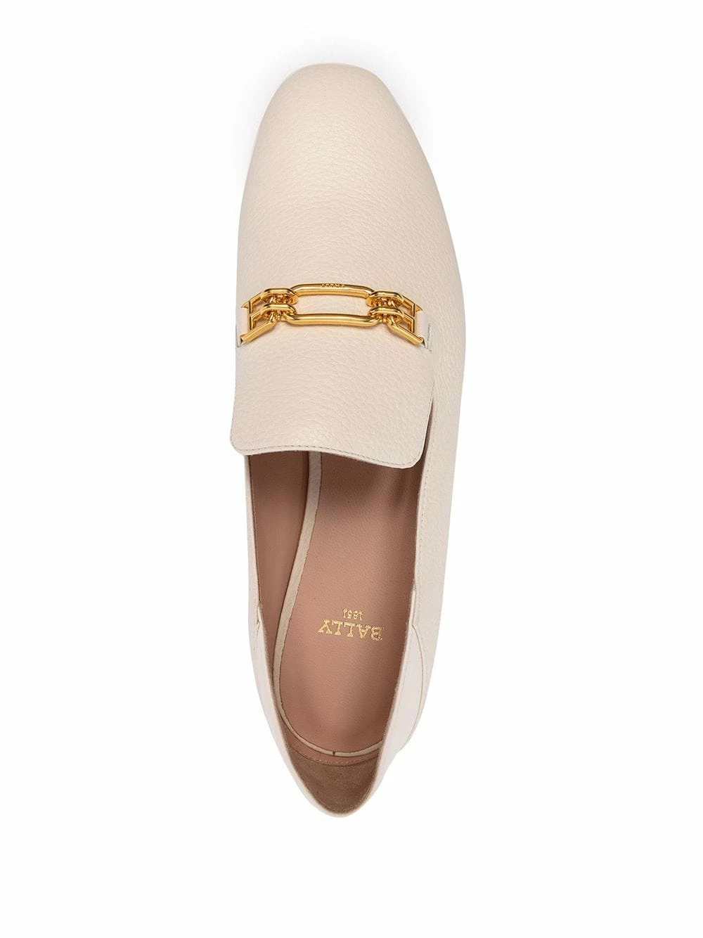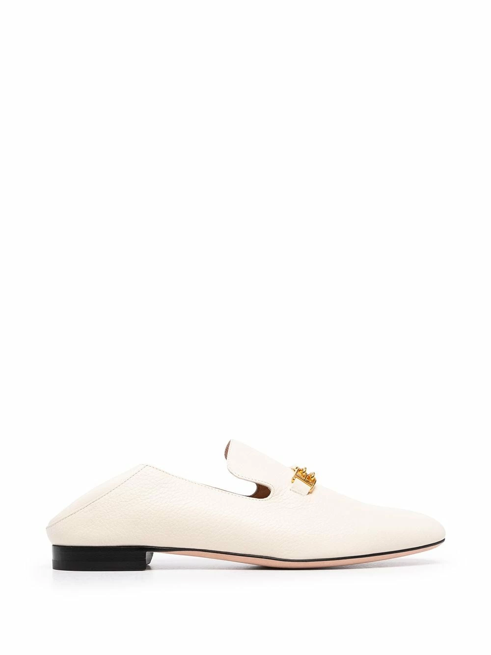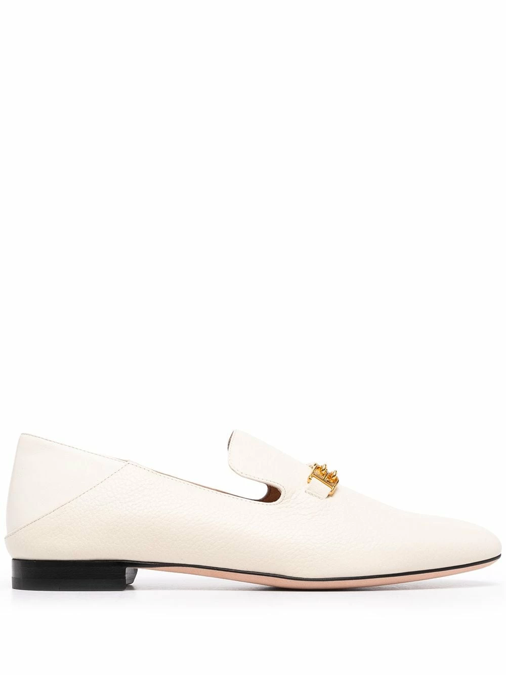 Design à enfiler, texture grainée, plaque logo dorée, bout rond, semelle intérieure à logo, semelle plate. Couleur : blanc. Matière : cuir.