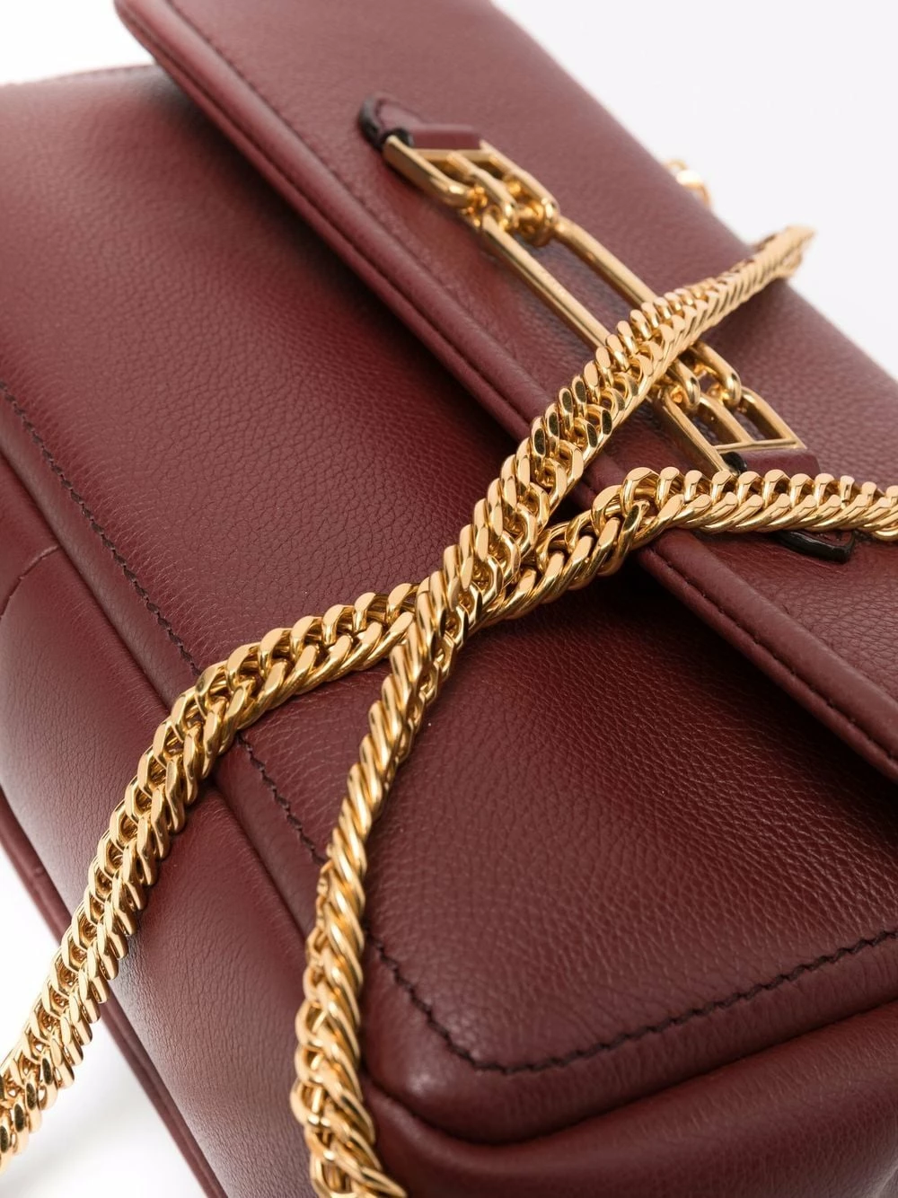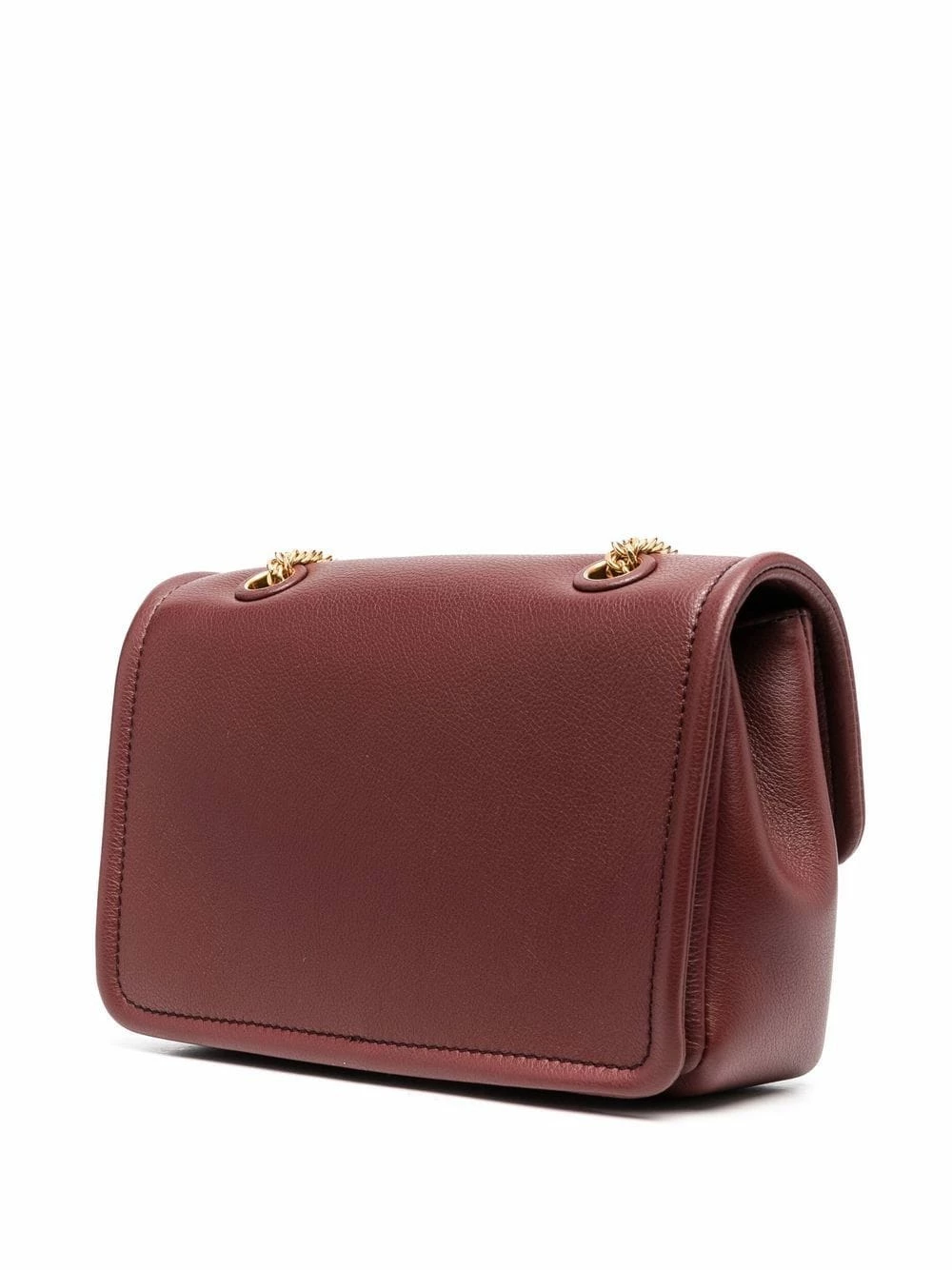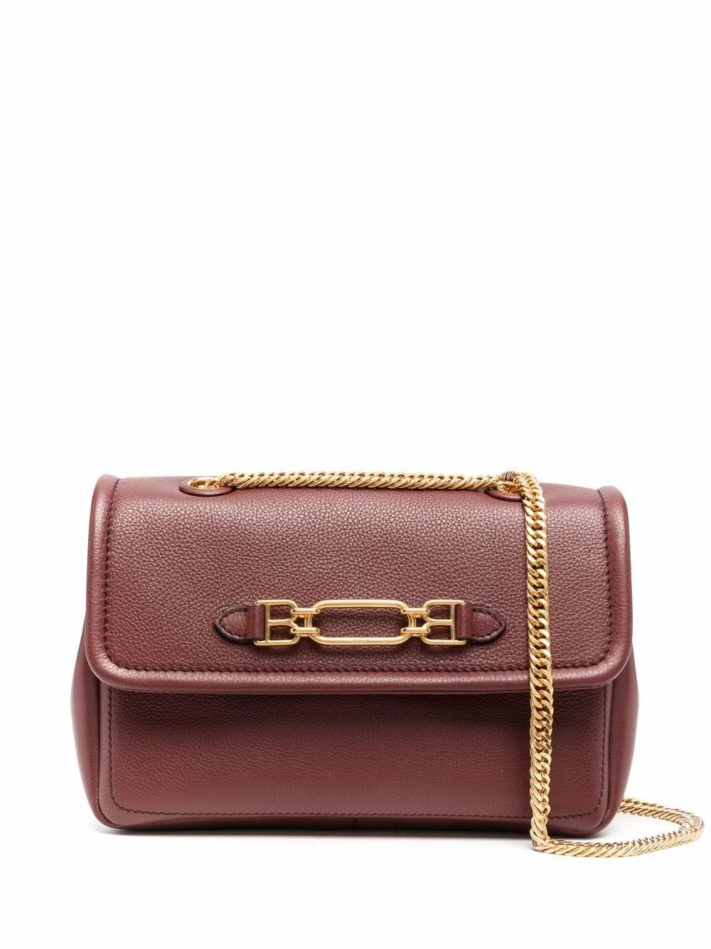Bride porté épaule en chaîne, plaque logo dorée, rabat sur le dessus à fermeture magnétique, poche intérieure zippée. Couleur : marron. Matière : cuir.