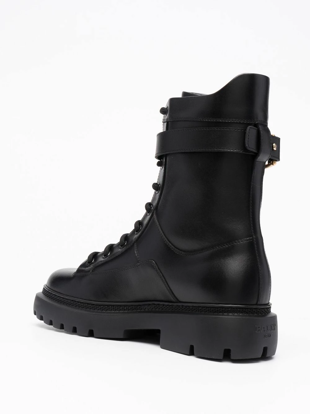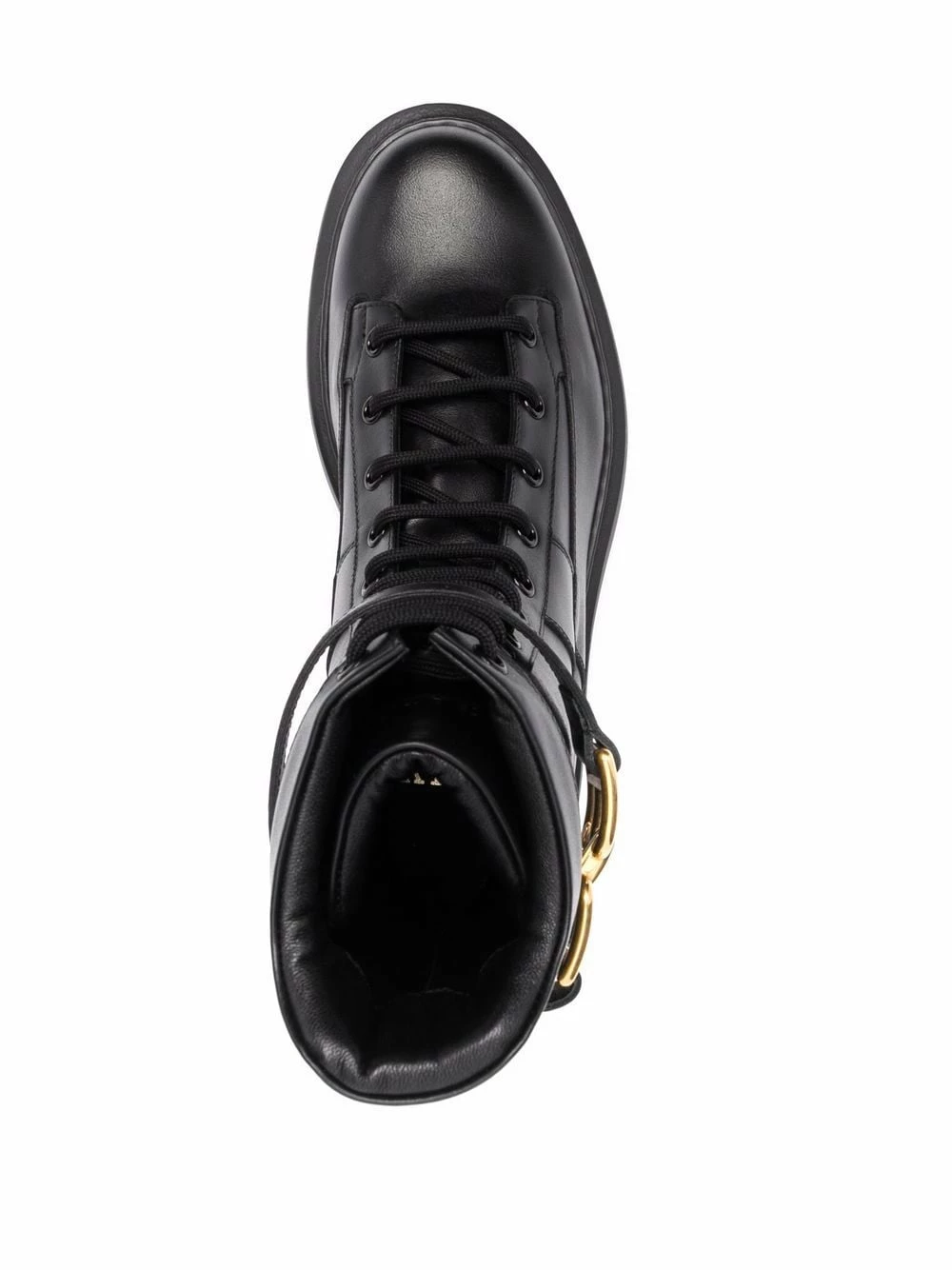 Plaque logo dorée, fermeture à boucles sur les côtés, fermeture à lacer sur le devant, bout rond, semelle plate en caoutchouc. Matière : cuir.