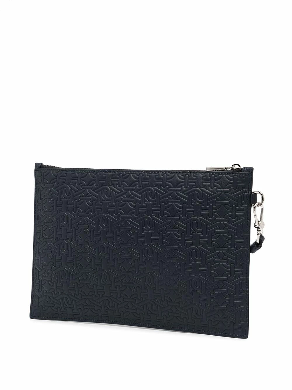 Motif monogrammé embossé, fermeture zippée sur le dessus, logo argenté, ornements argentés. Matière : cuir.
