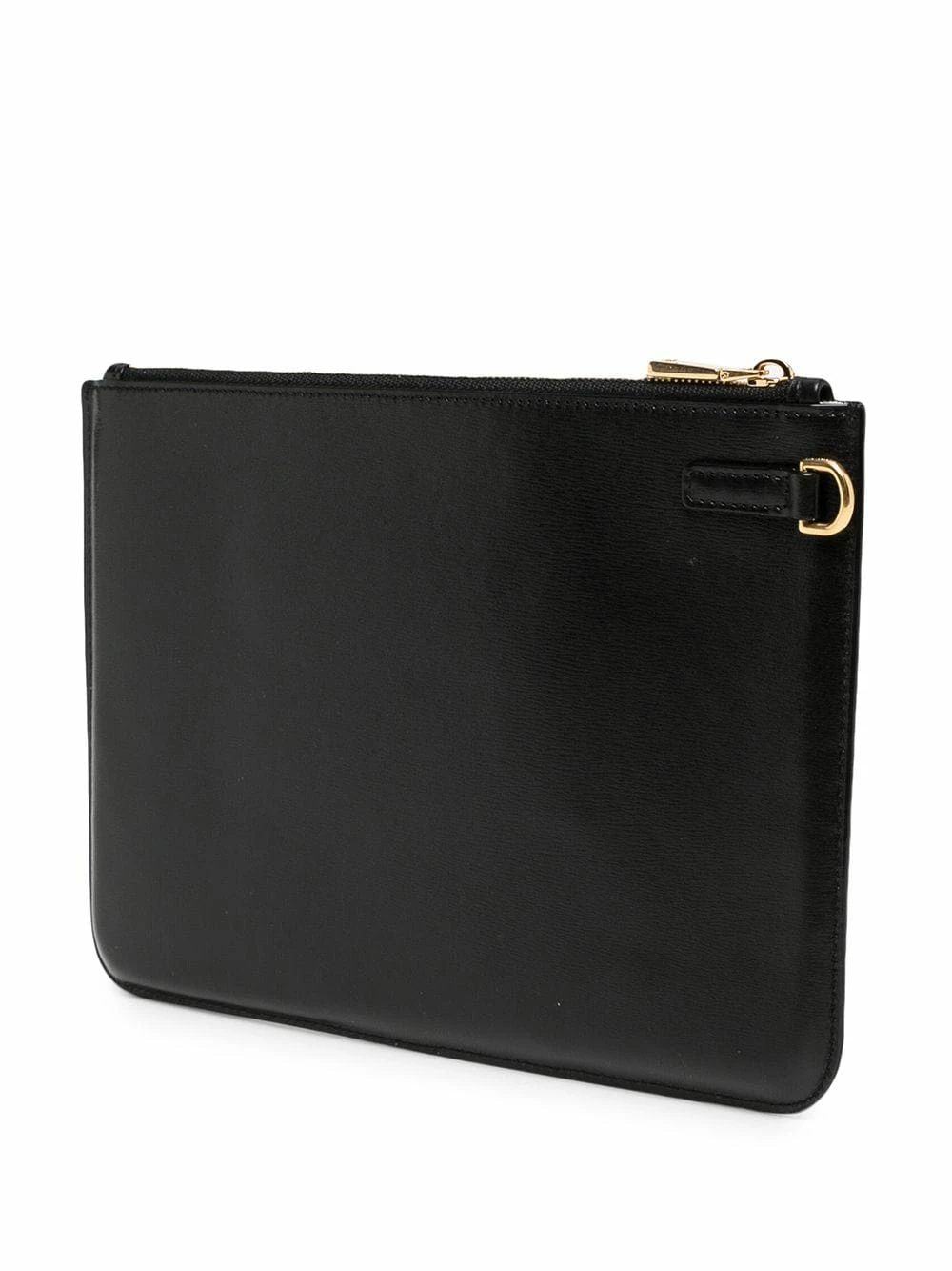 Plaque logo dorée, anse-dragonne détachable, fermeture zippée sur le dessus, compartiments intérieurs pour carte. Couleur : noir. Matière : cuir.