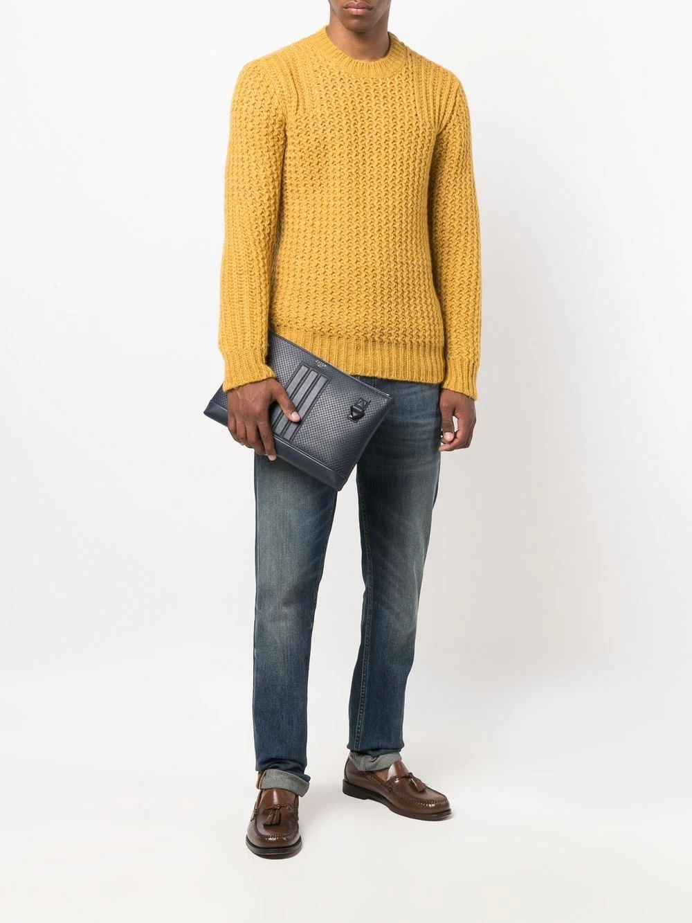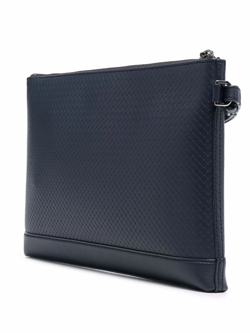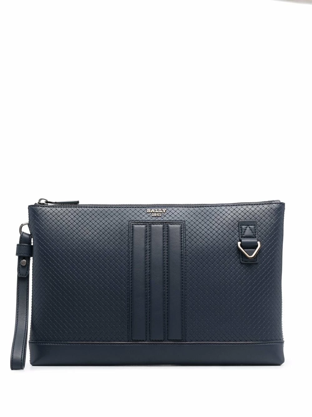 Détails rayés, logo lettre, fermeture zippée sur le dessus, bride porté poignet. Matière : cuir.