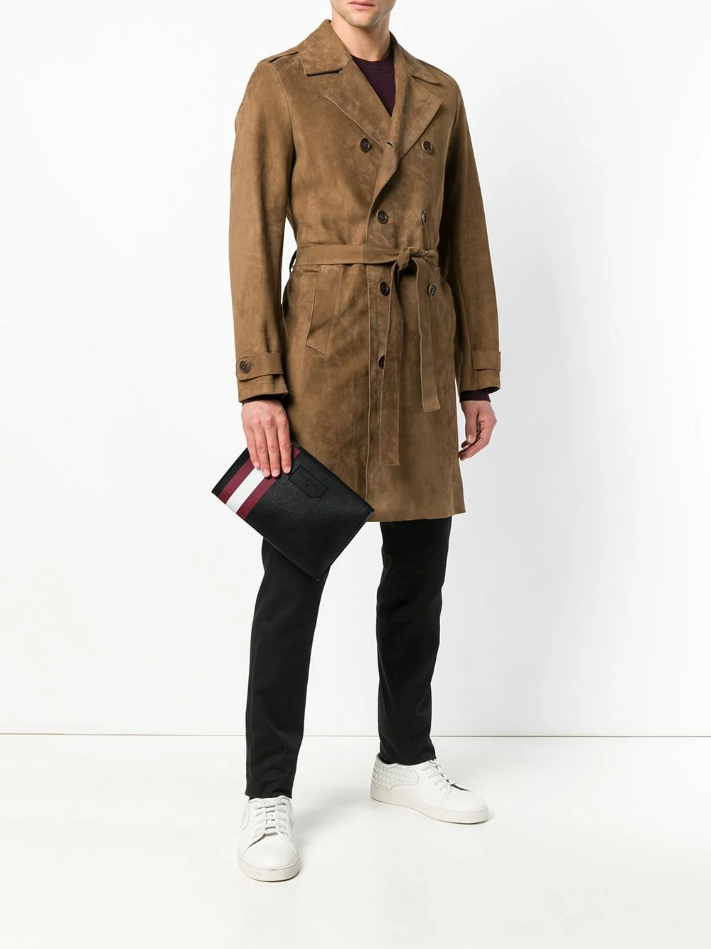 Pochette Skid noir Bally avec fermeture zippée sur le dessus, rayures verticales, logo embossé sur le devant et compartiment intérieur.