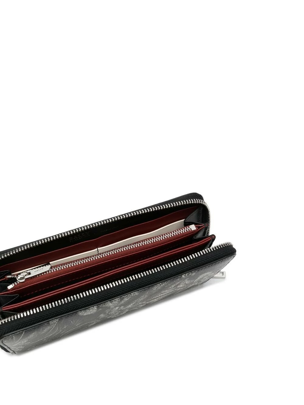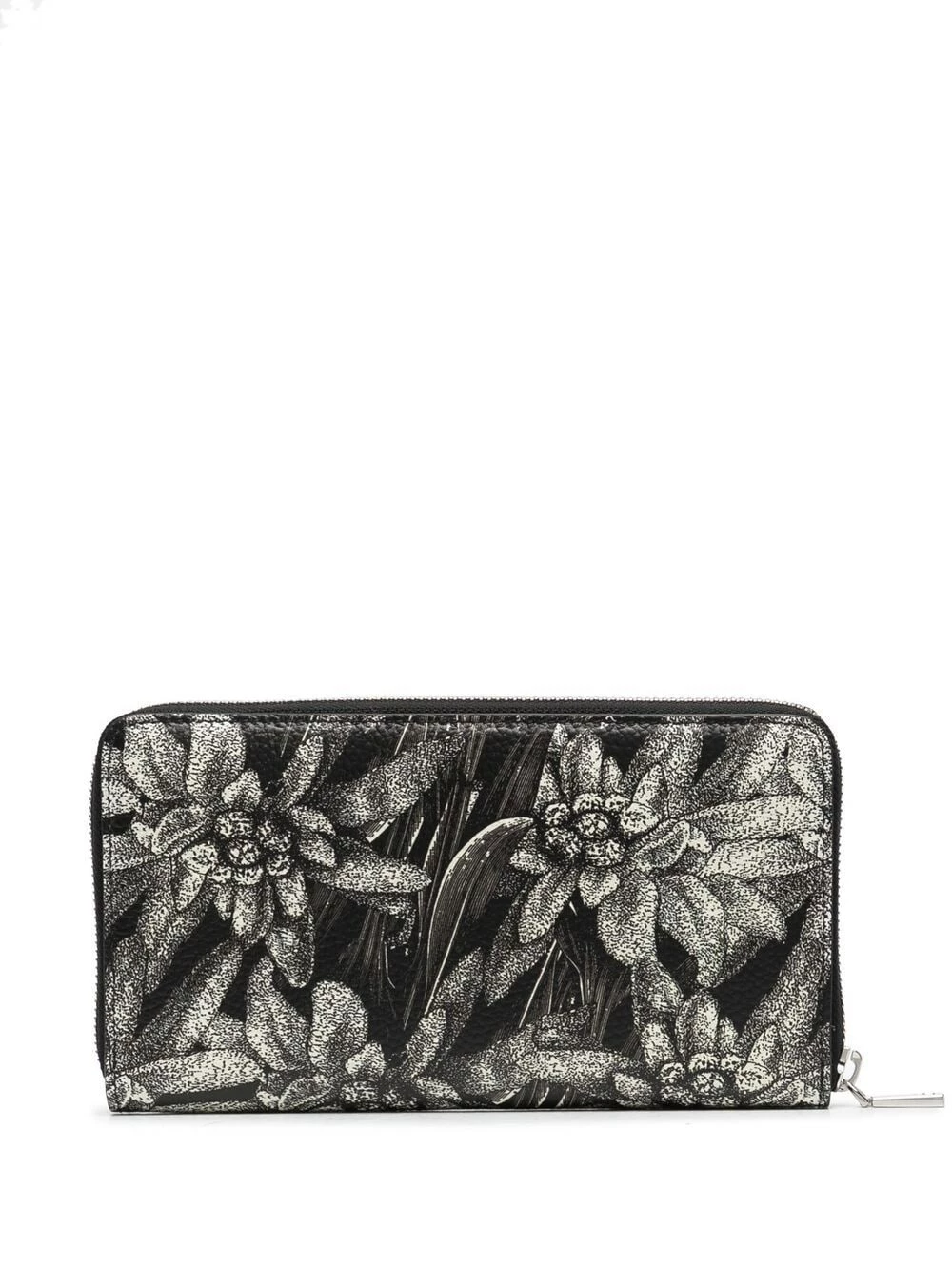 Motif de fleurs, fermeture zippée sur le dessus, compartiments intérieurs pour carte, compartiment à billets intérieur, poche intérieure zippée. Matière : cuir.