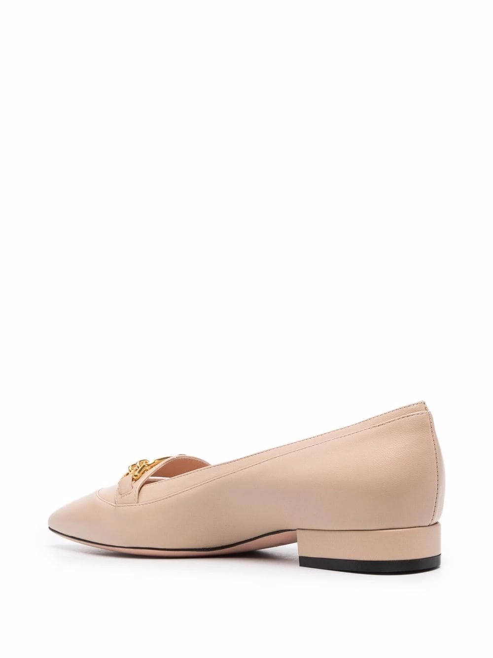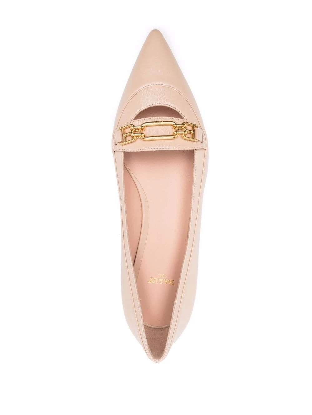 Beige, peau d’agneau, bout pointu, plaque logo dorée.