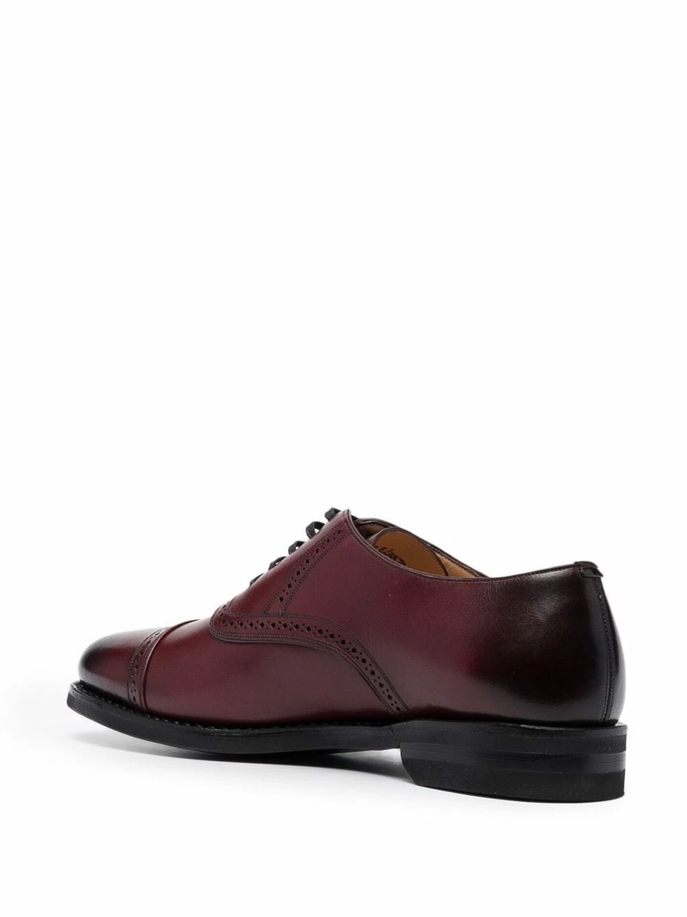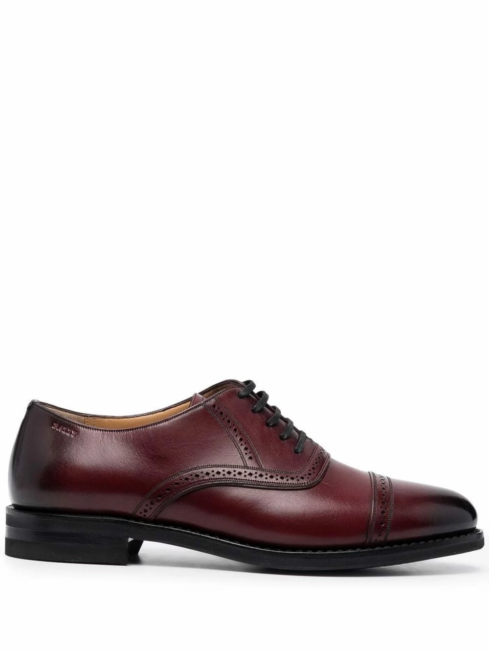 Carmin, cuir de veau, détails de perforations, fermeture à lacer sur le devant, bout rond, semelle plate en caoutchouc.