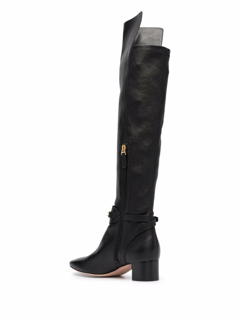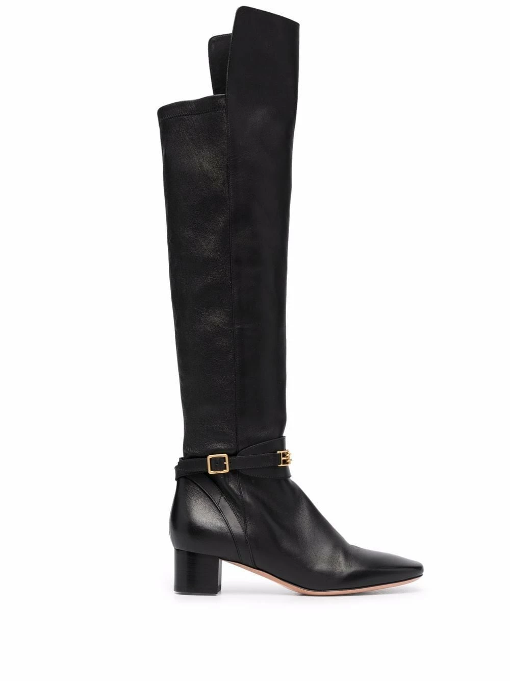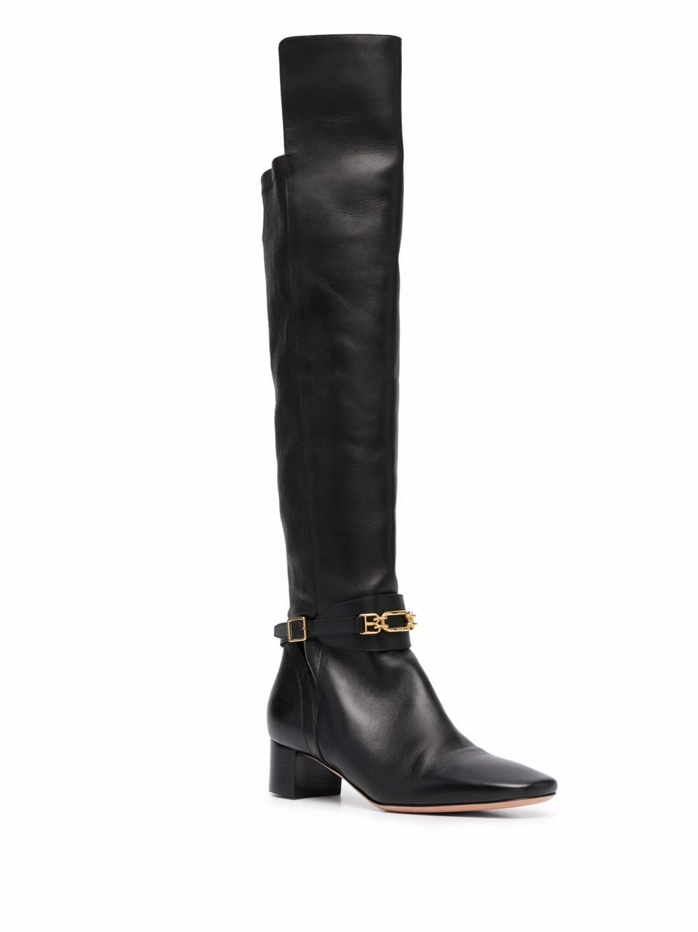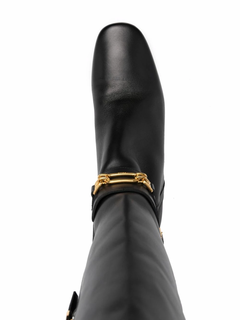 Finitions en métal doré, détails de chaînes, bout en amande, fermeture zippée sur le côté, semelle intérieure à logo, petit talon épais. Couleur : noir. Matière : cuir.