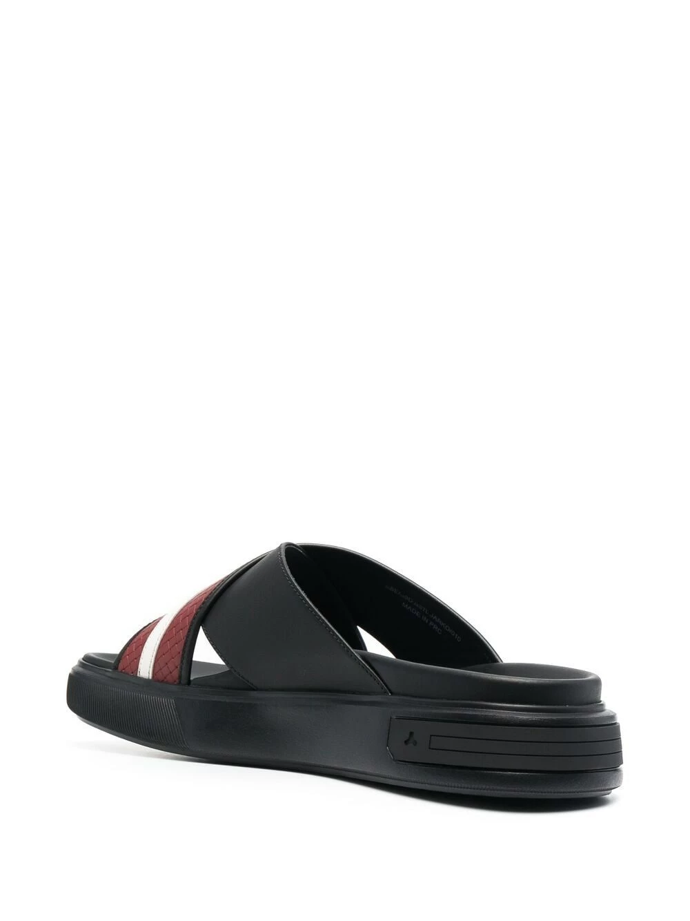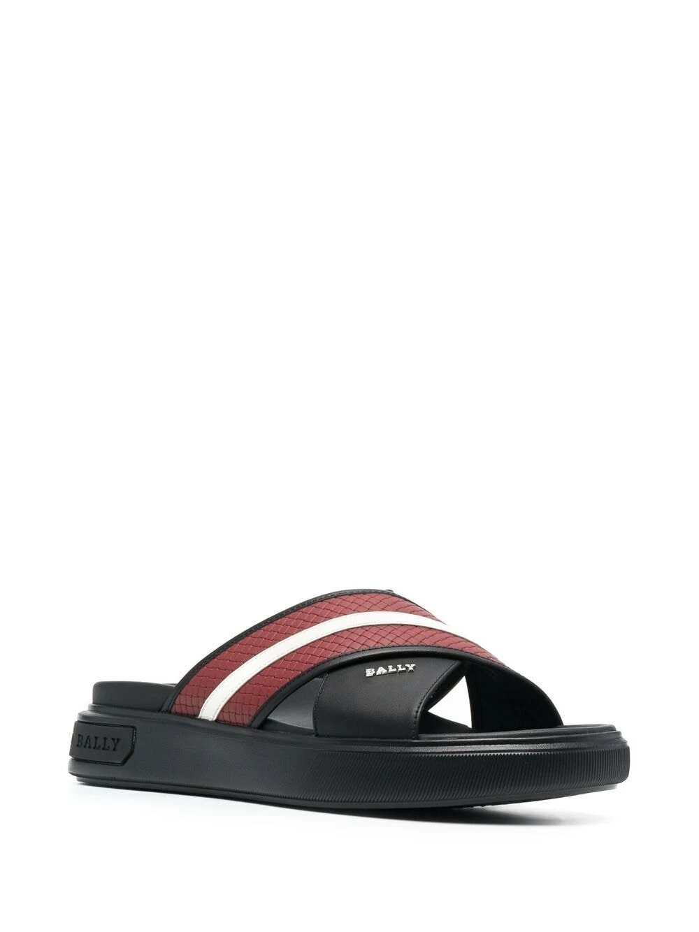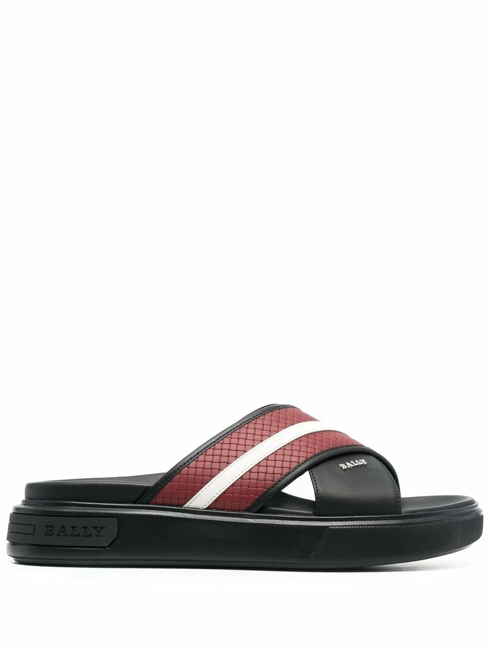 Imprimé à rayures, bout ouvert, brides croisées aux orteils, design à enfiler, semelle intérieure à logo, semelle plate en caoutchouc. Matière : cuir.