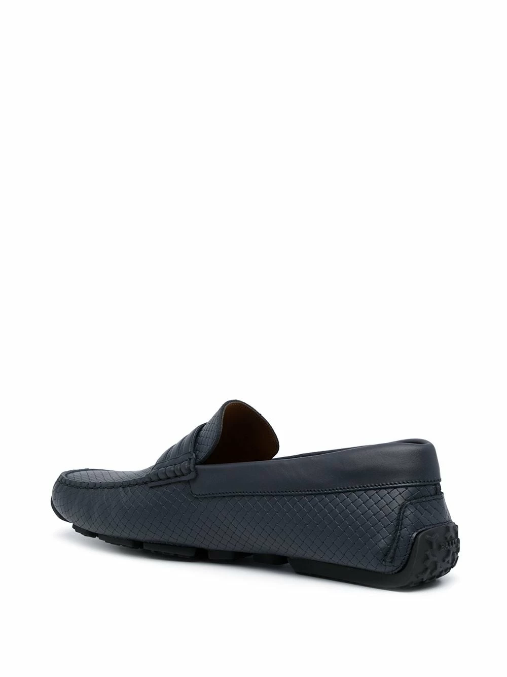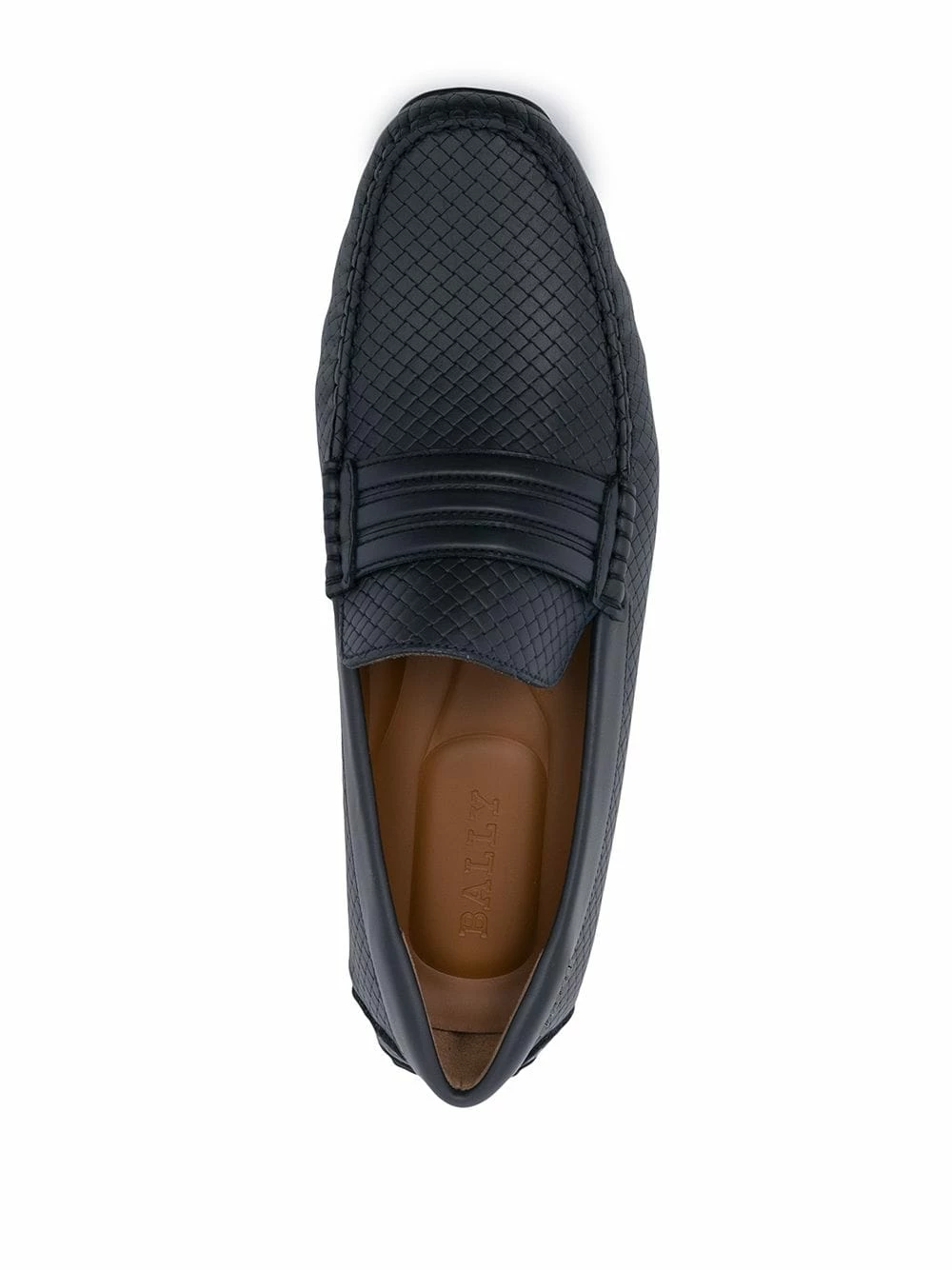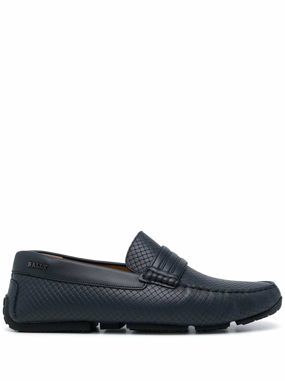 Bleu marine, cuir, design tissé, plaque logo, design à enfiler, semelle plate en caoutchouc, semelle intérieure à logo.