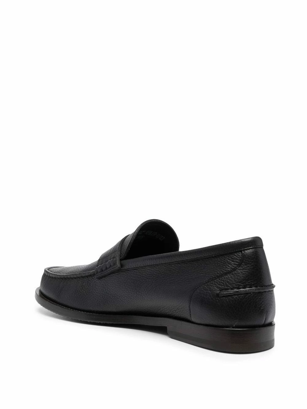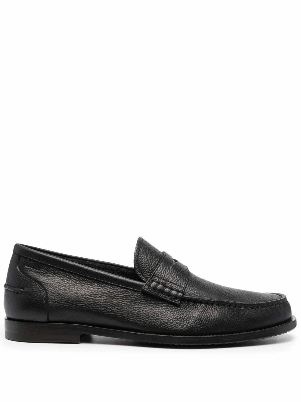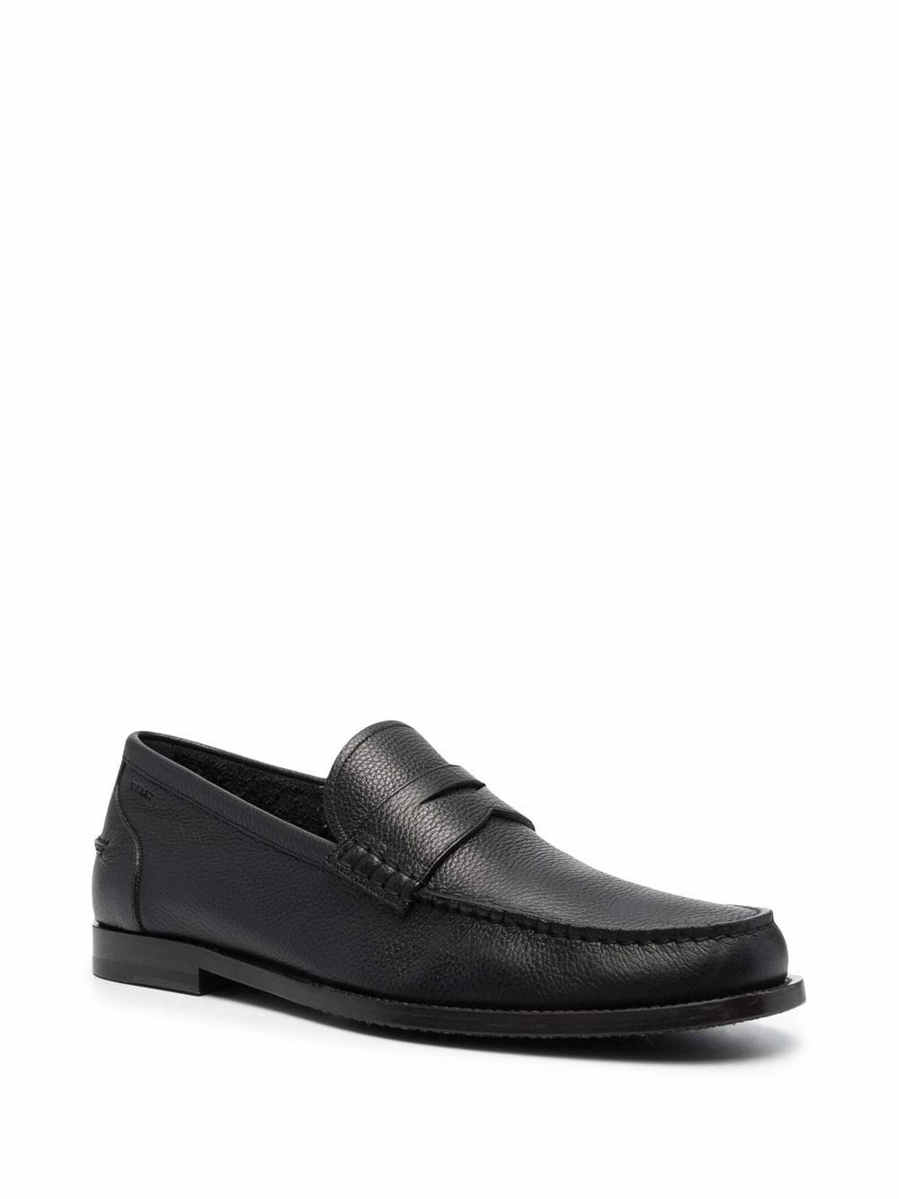 Texture grainée, bout en amande, entaille penny, design à enfiler, semelle à épaisseurs superposées. Matière : cuir.
