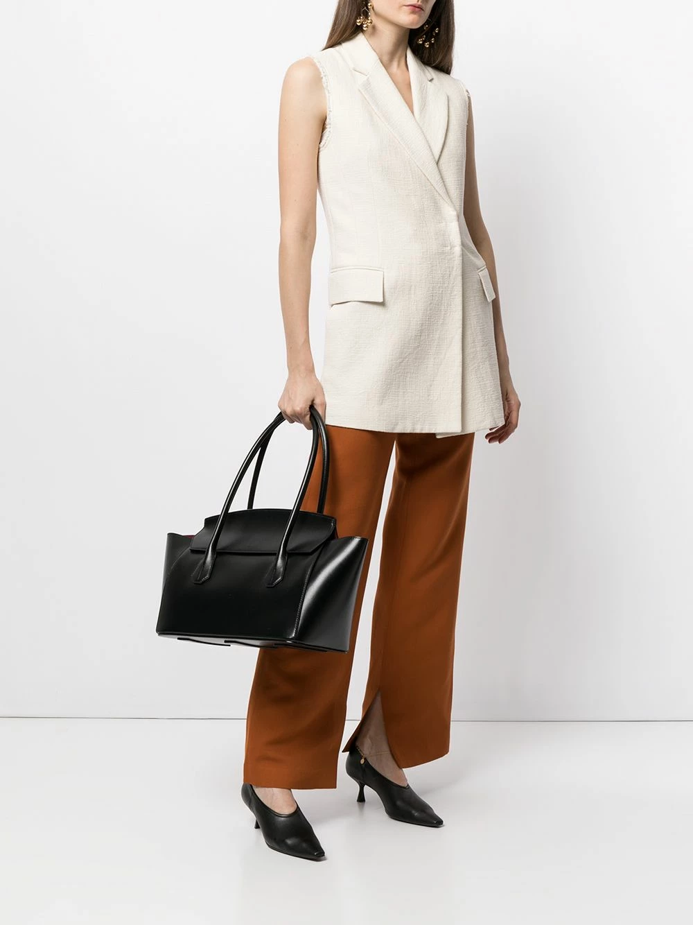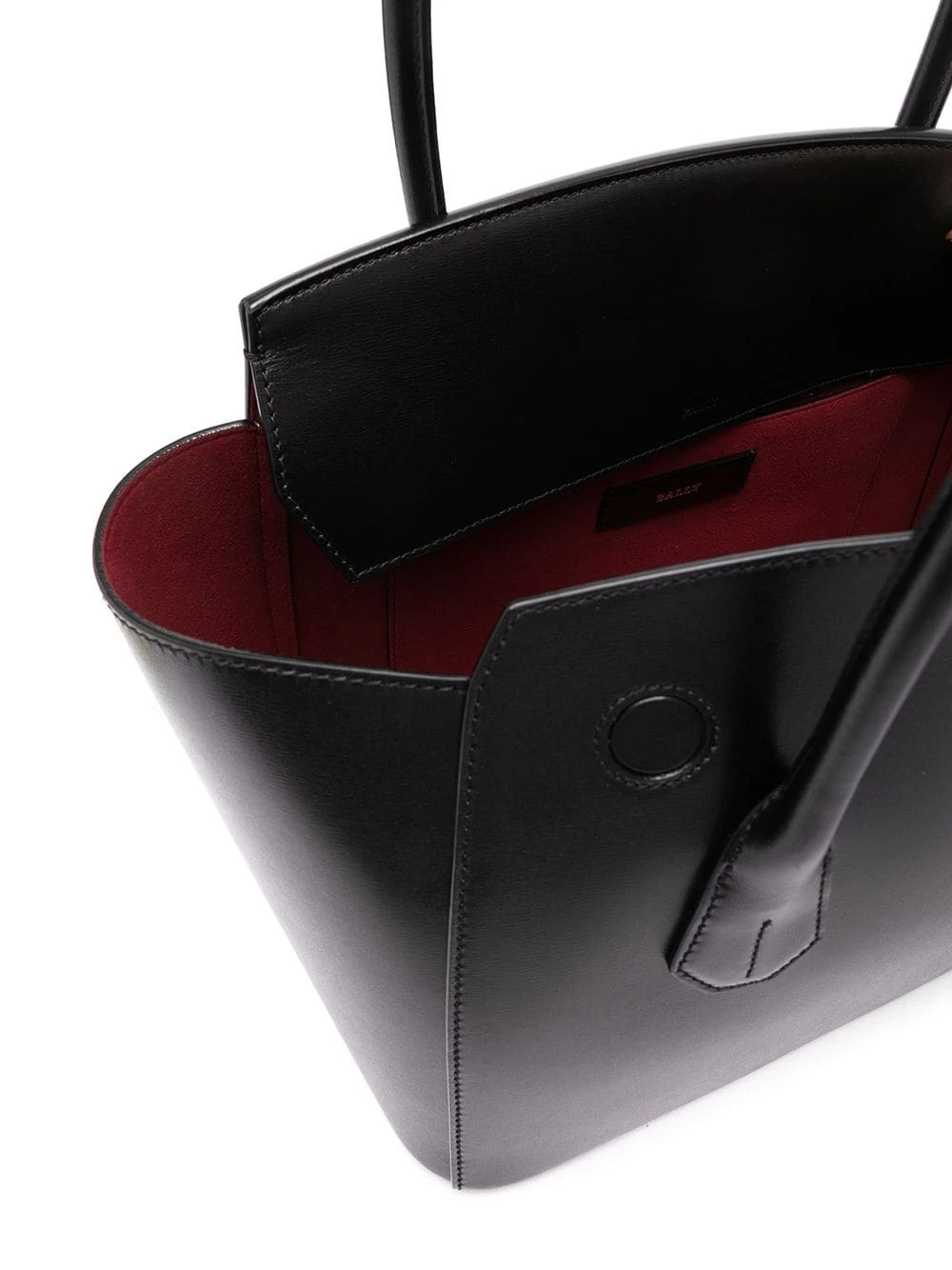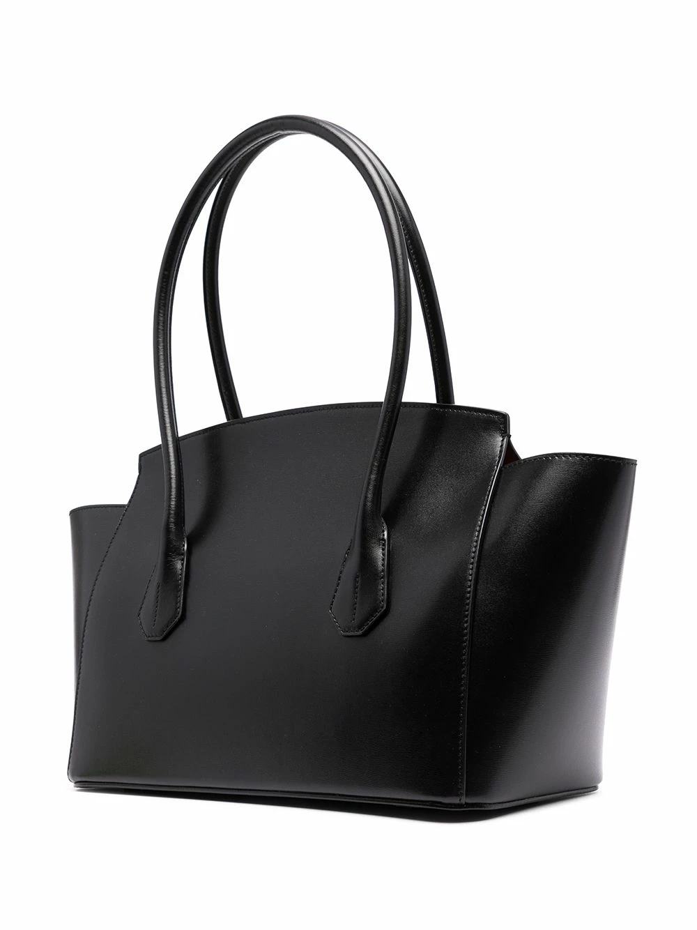Logo embossé, anses arrondies, rabat sur le dessus à fermeture magnétique, compartiment principal, poche intérieure plaquée. Couleur : noir. Matière : cuir.