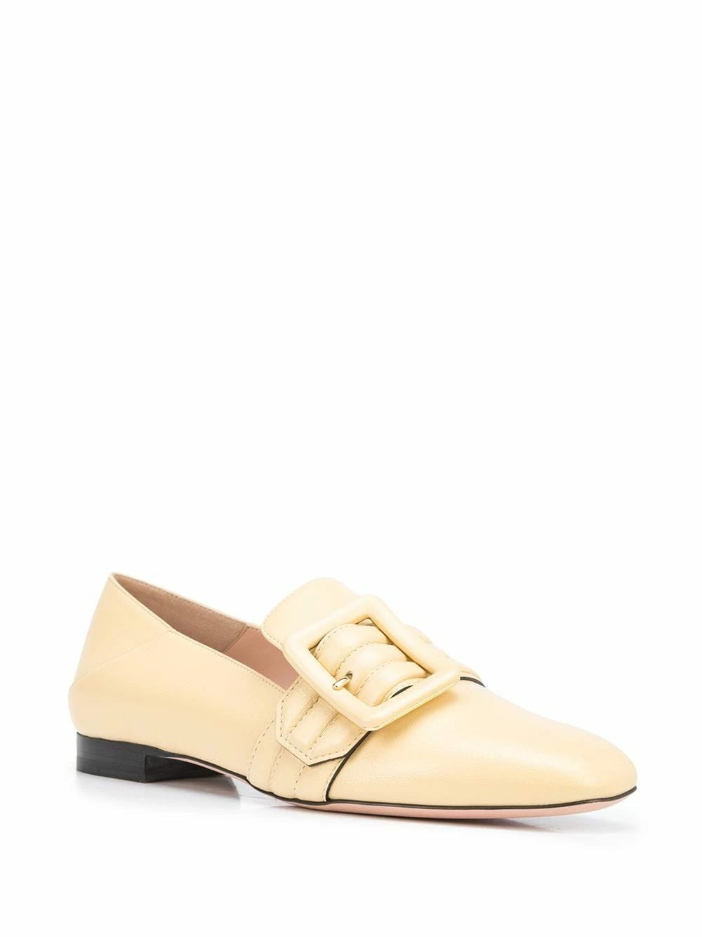 Texture grainée, bout en amande, fermeture à boucle, semelle intérieure griffée, design à enfiler, petit talon. Couleur : jaune. Matière : cuir.