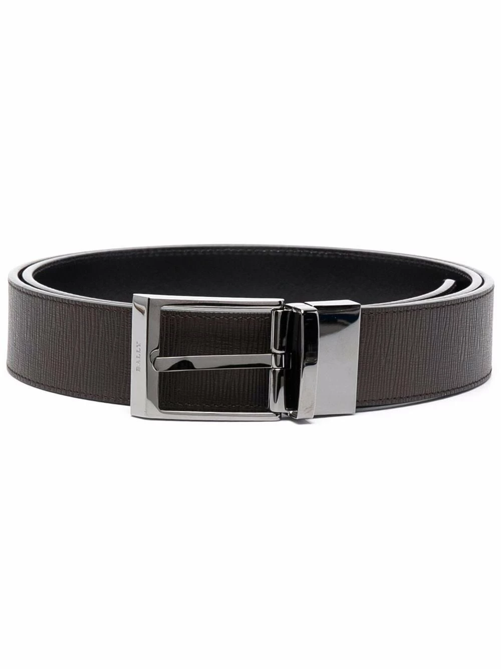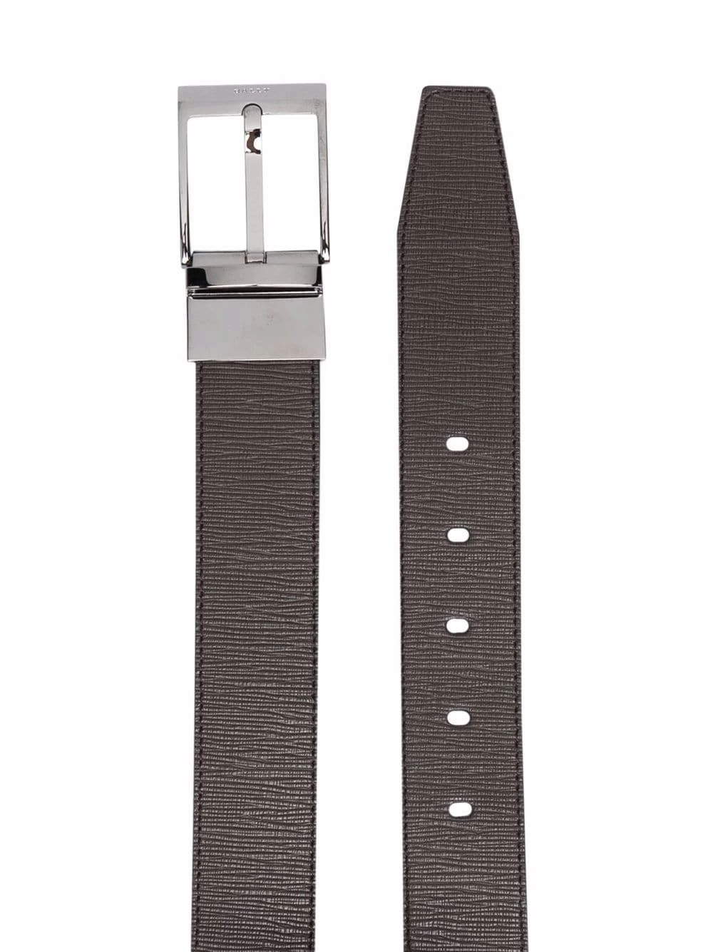 Détails de perforation, fermeture à boucle argentée, texture grainée, design réversible. Couleur : marron.