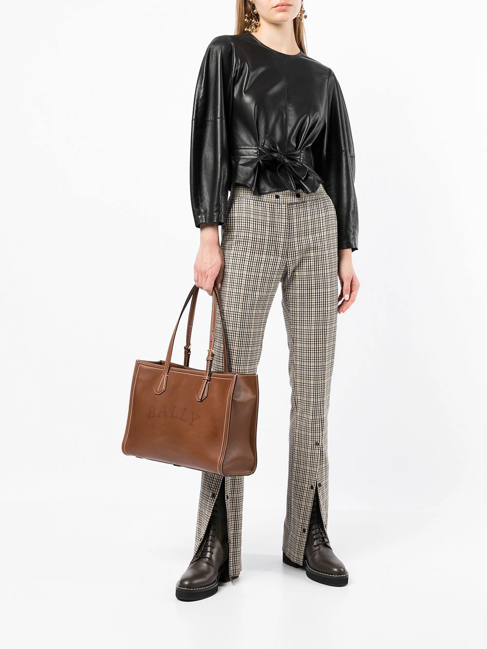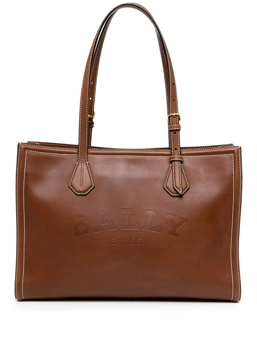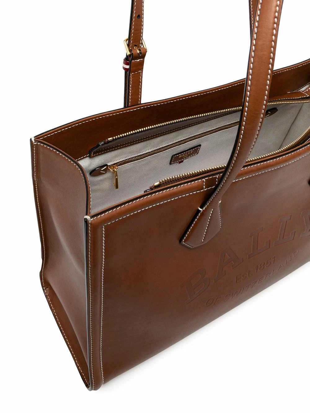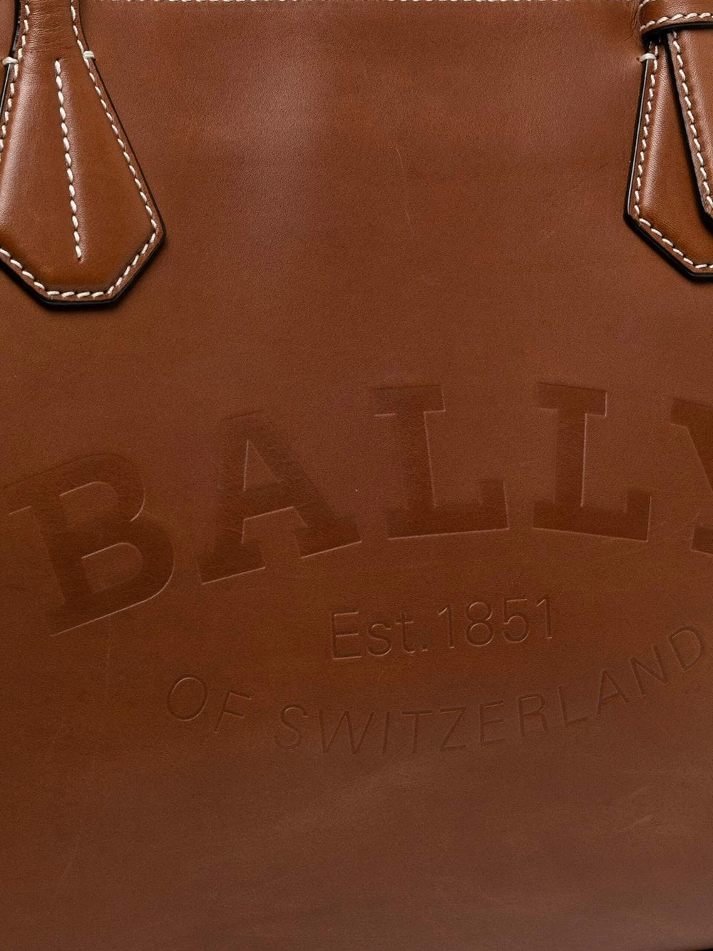 Logo embossé sur le devant, anses sur le dessus, coutures contrastantes, fermeture zippée sur le dessus, compartiment principal, poche intérieure zippée. Couleur : marron. Matière : cuir.