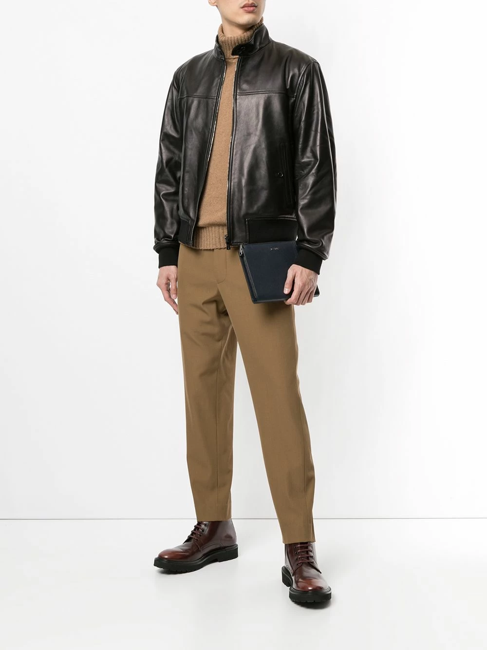 Logo doré, fermeture zippée sur le dessus, poche intérieure zippée. Couleur : bleu. Matière : cuir.