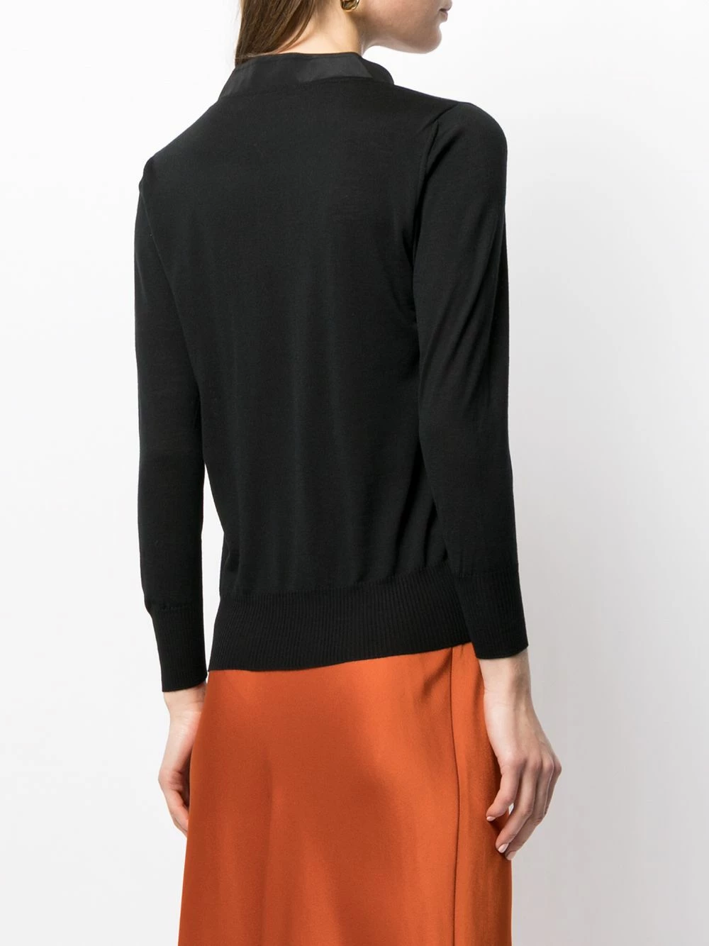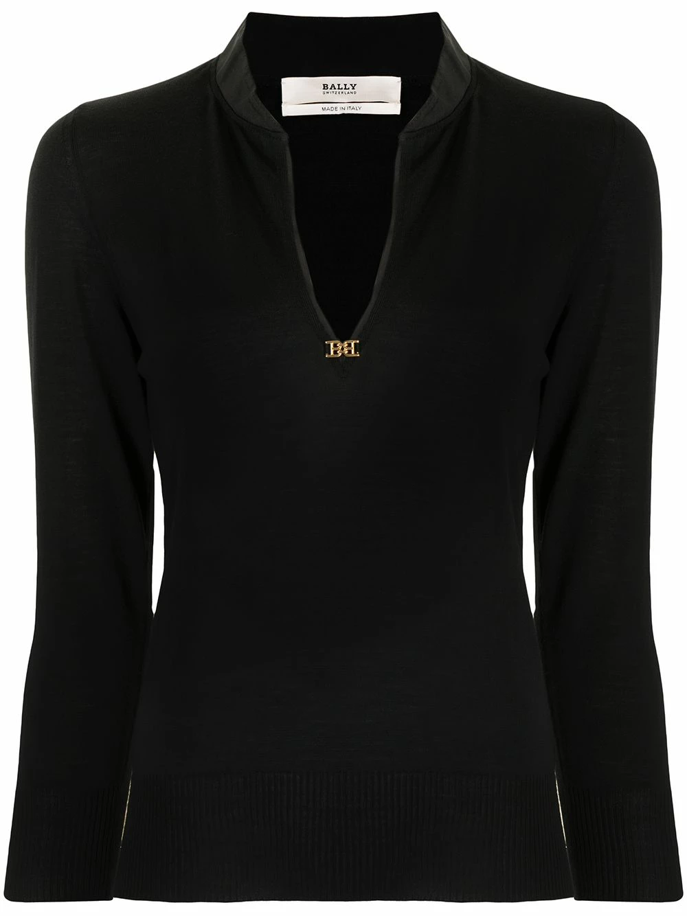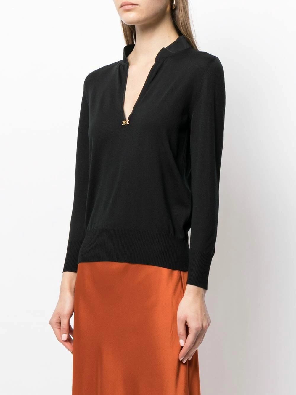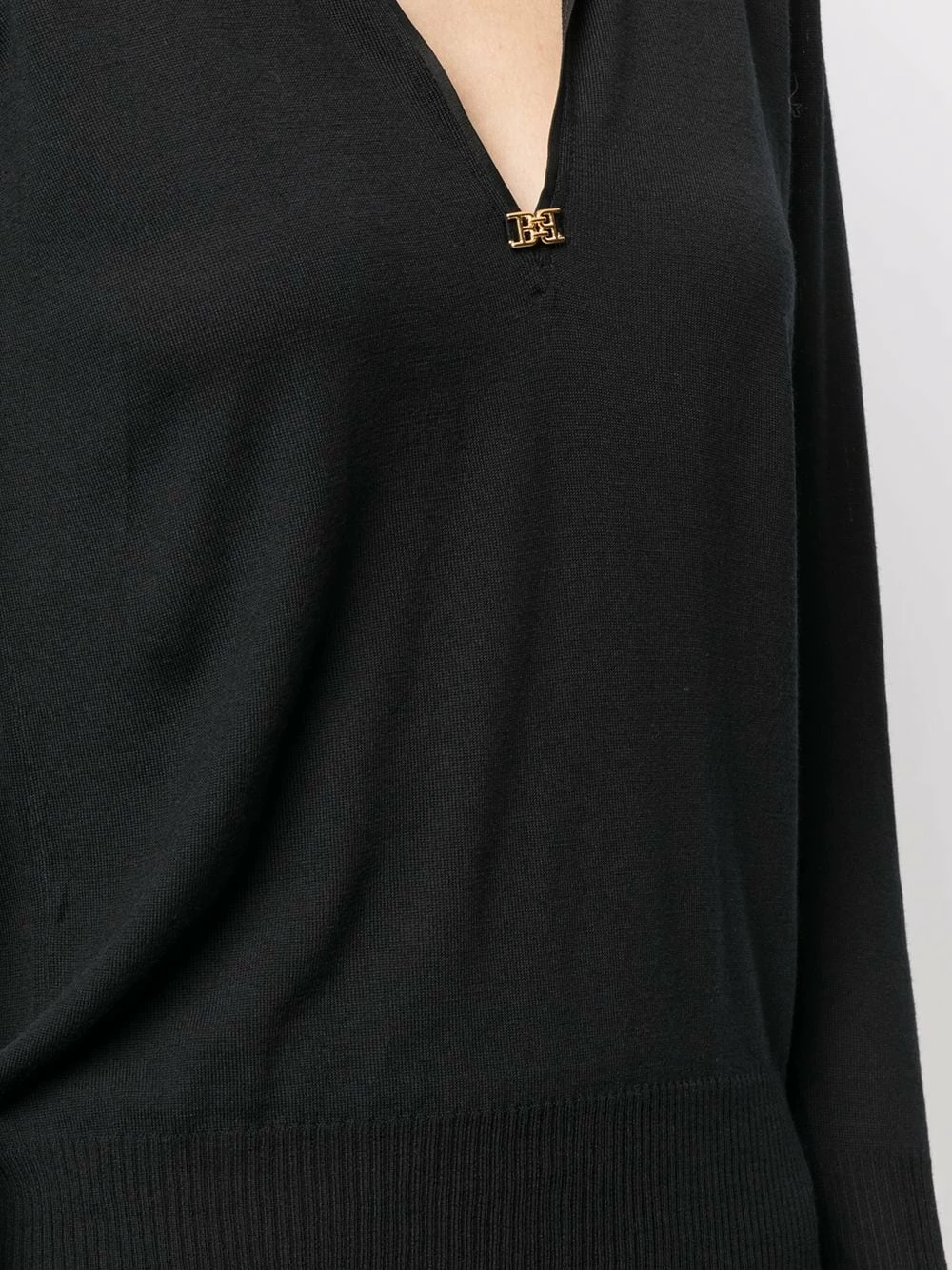 Plaque logo dorée, bord en maille côtelée, manches longues. Couleur : Noir. Matière : laine.