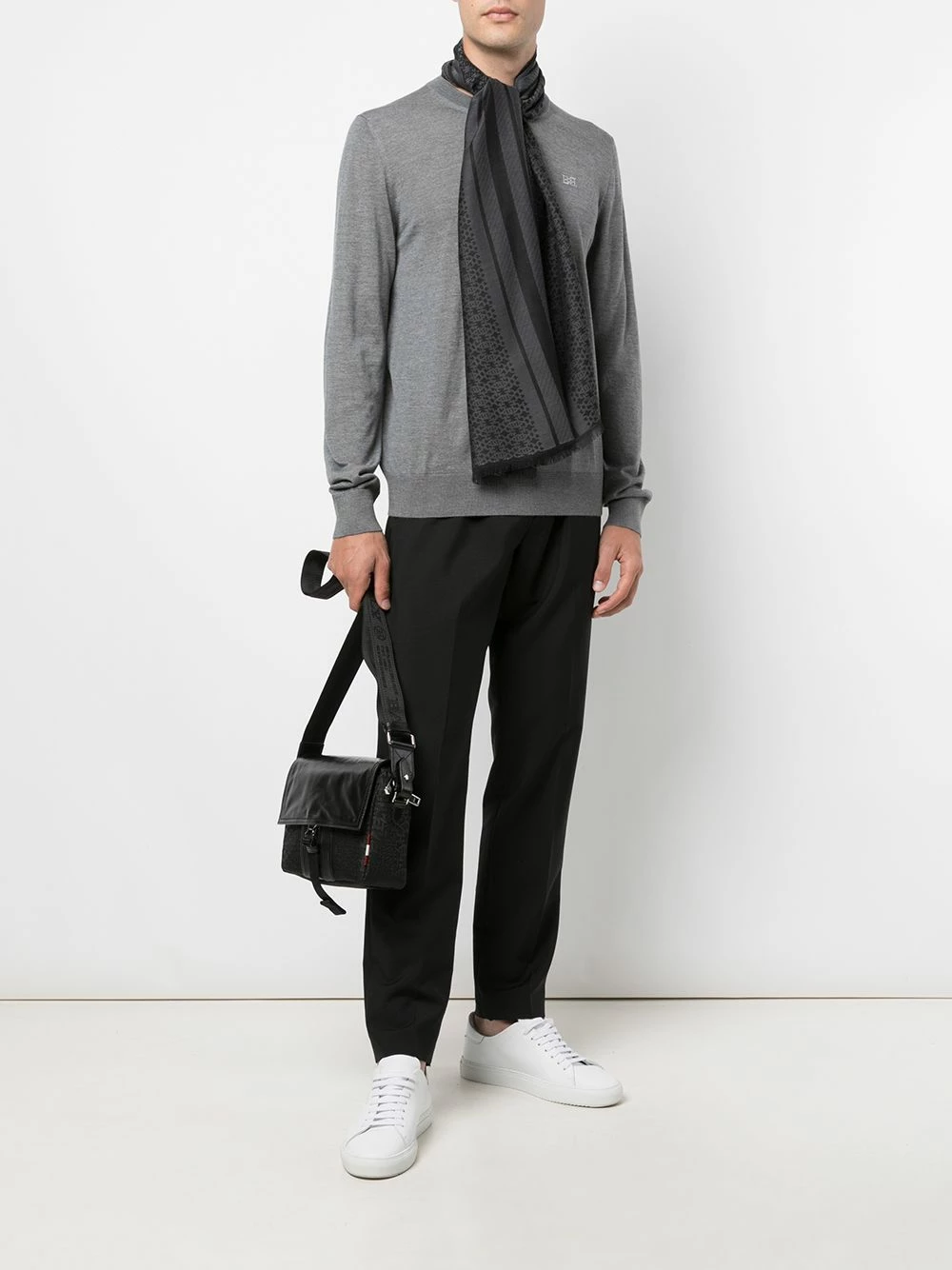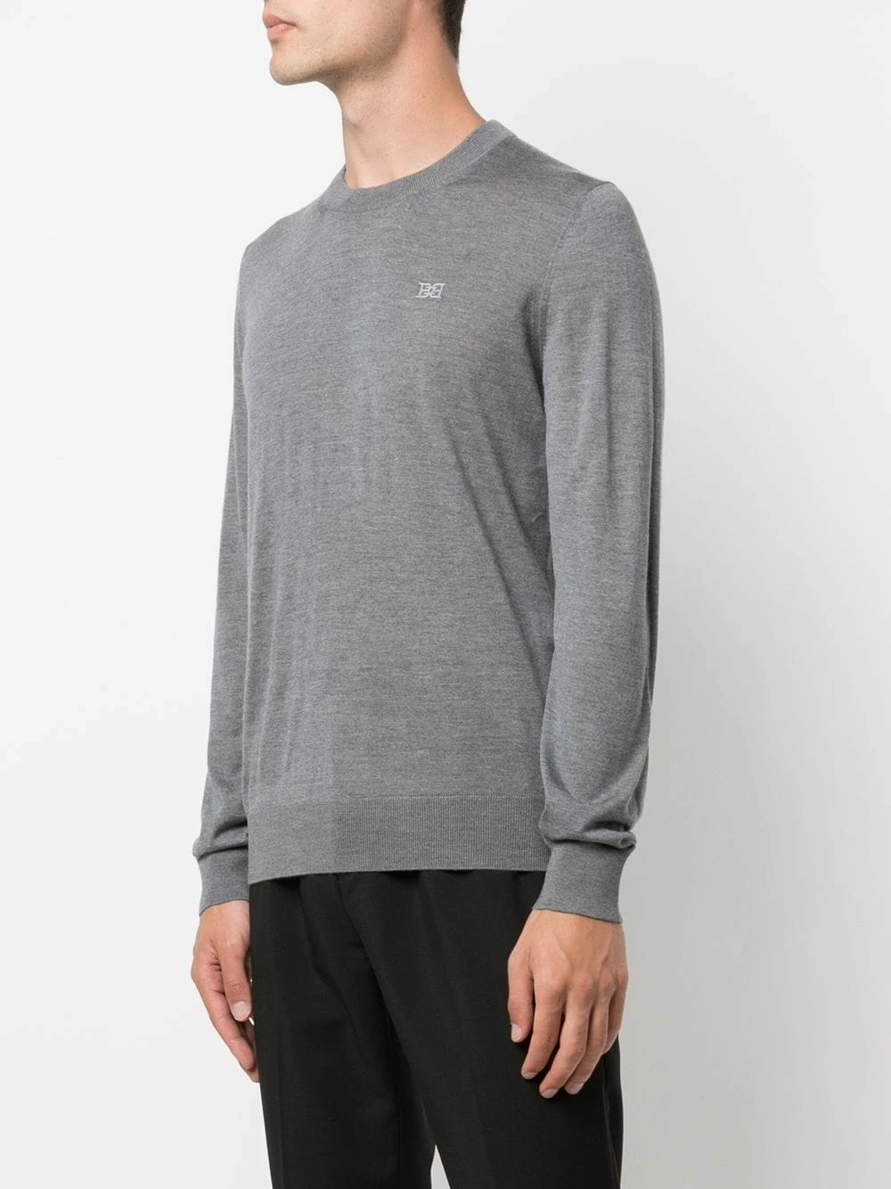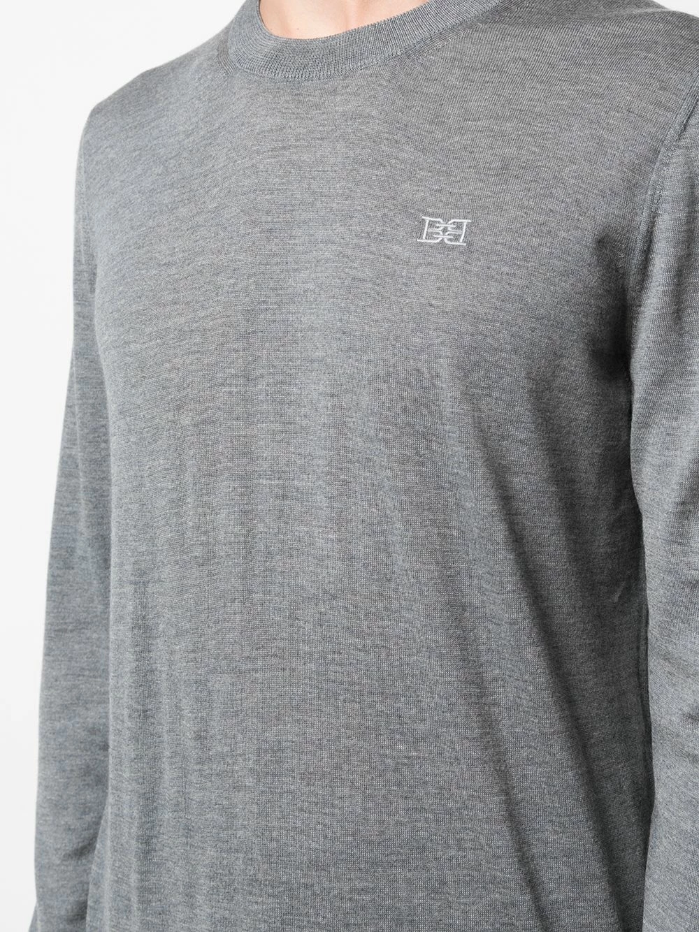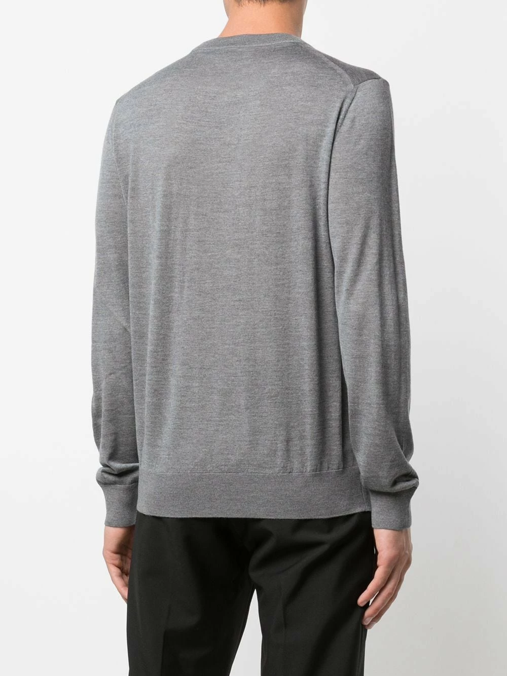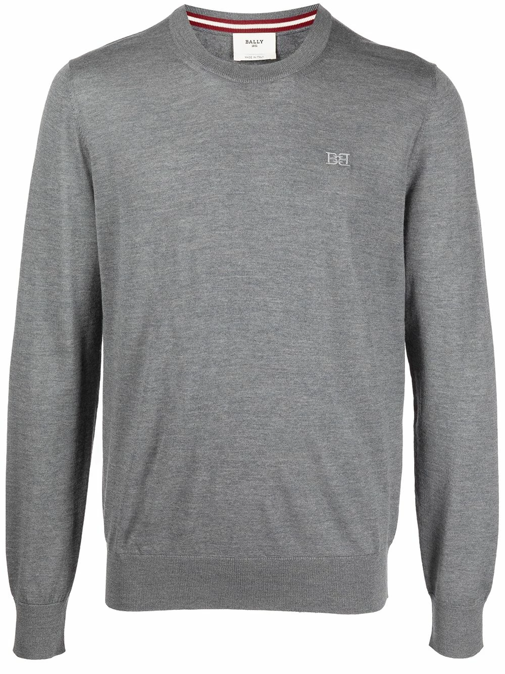 Logo brodé sur la poitrine, encolure ras du cou, manches longues, manches à poignets resserrés. Couleur : gris. Matière : laine mérinos.
