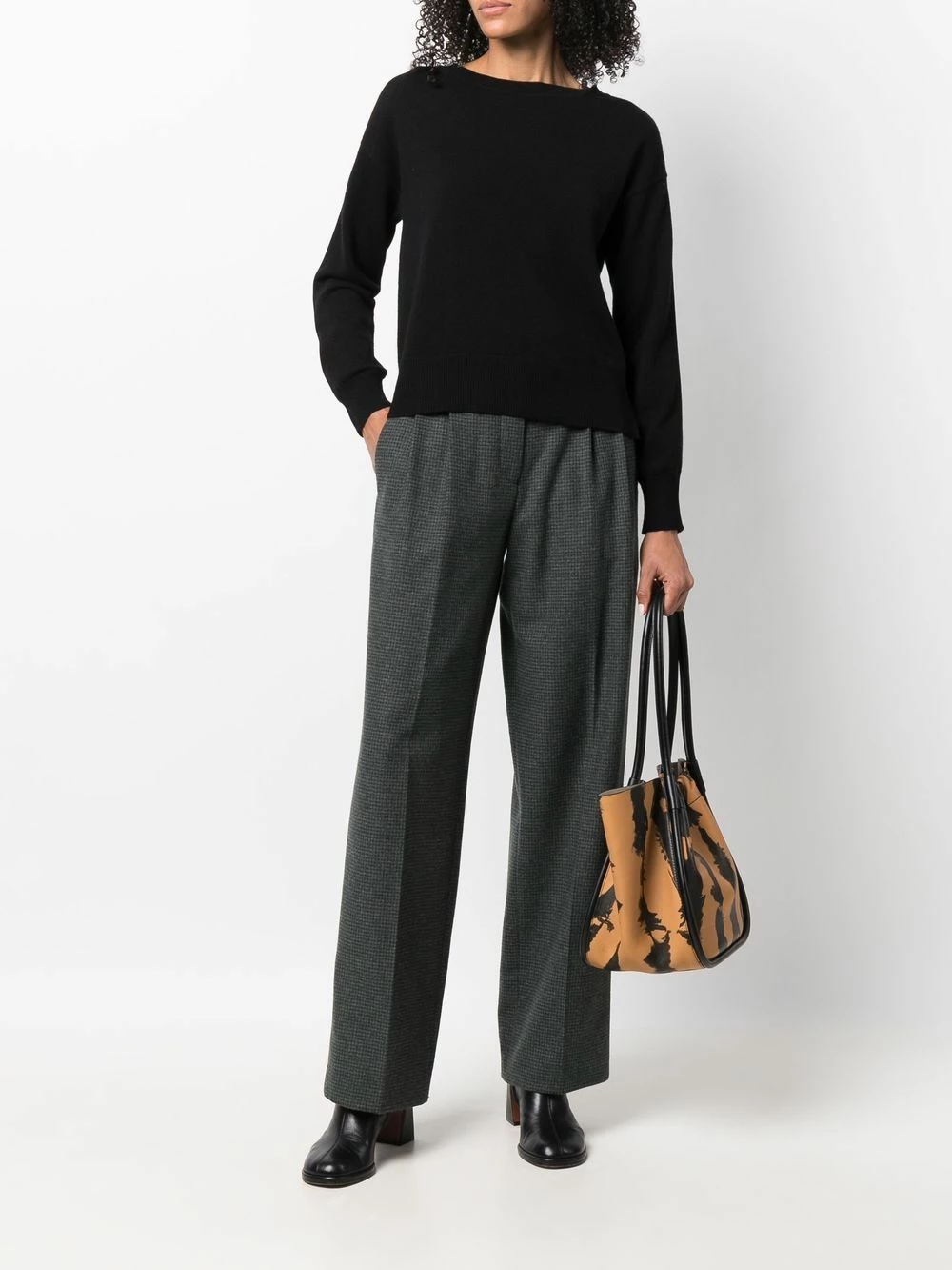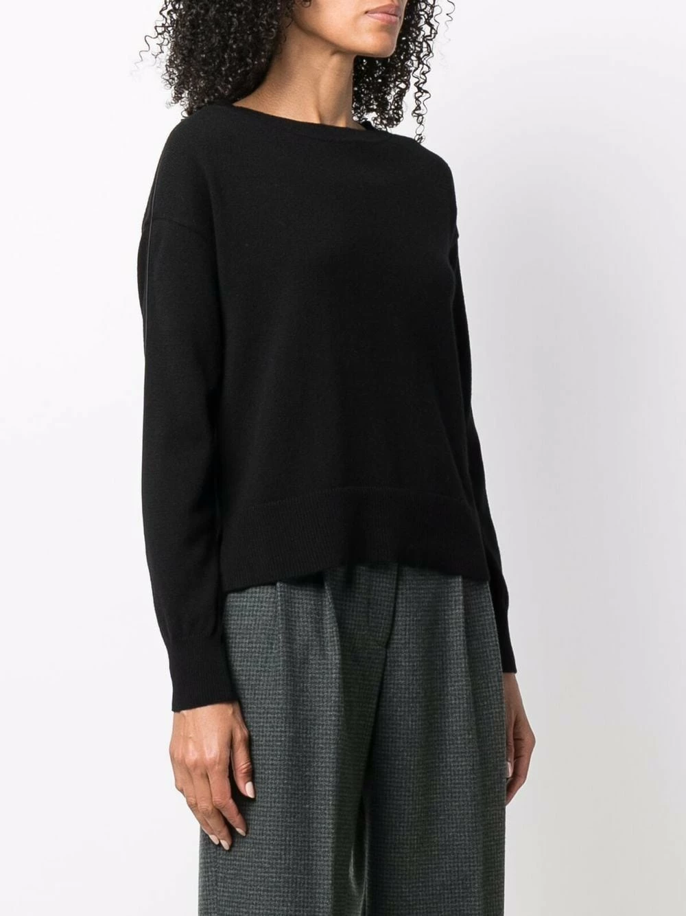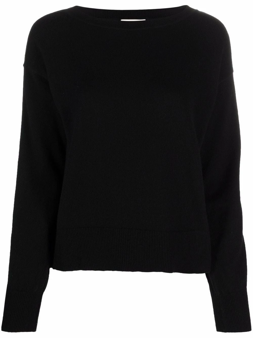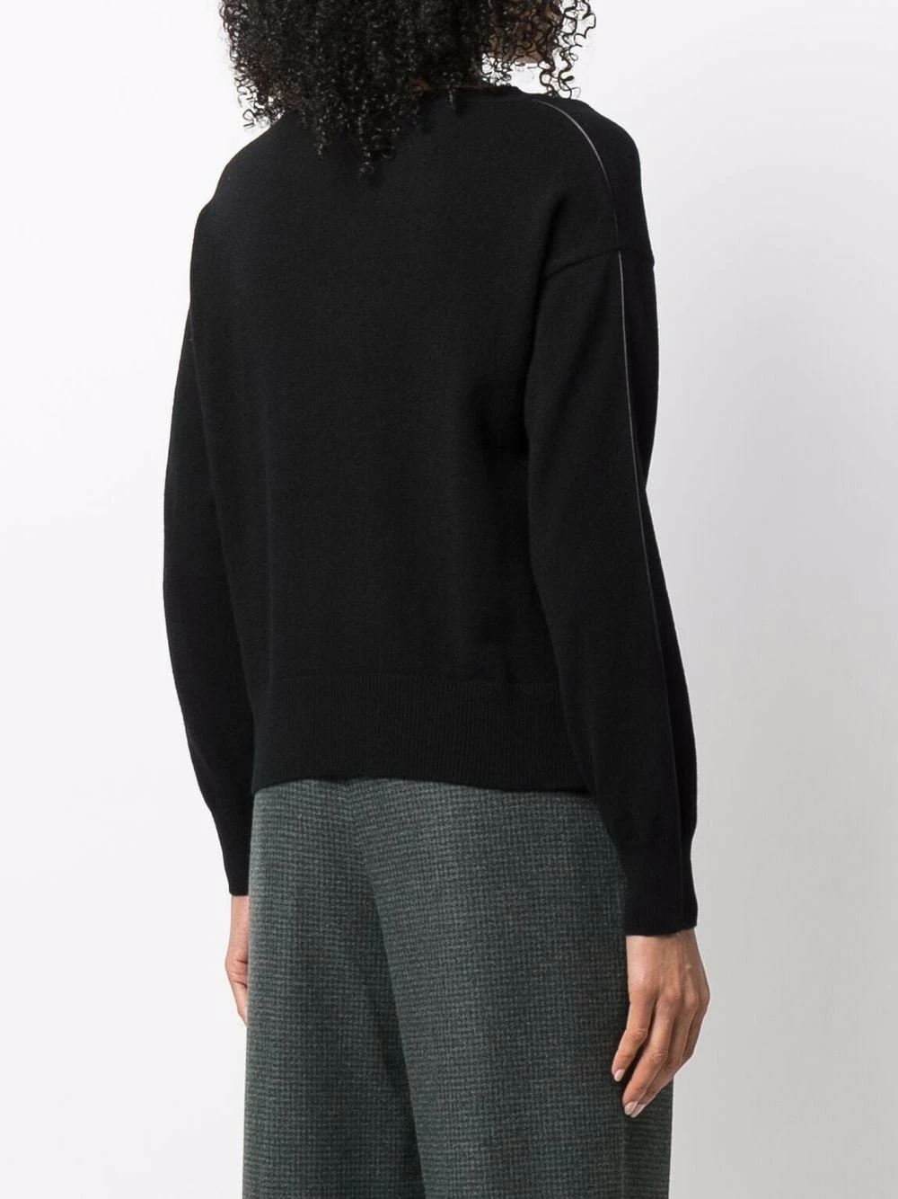 Maille fine, liseré en cuir, encolure bateau, manches longues, ourlet droit. Couleur : noir.