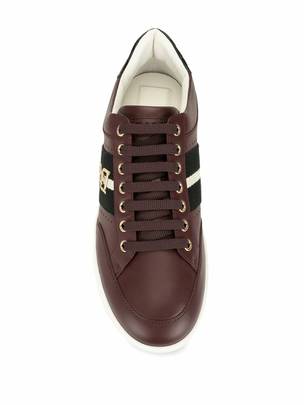 Bout rond, modèle bicolore, plaque logo dorée, rayures diagonales brodées, effet peau de crocodile, coutures ton sur ton, fermeture à lacer sur le devant, semelle plate en caoutchouc. Matière : cuir.