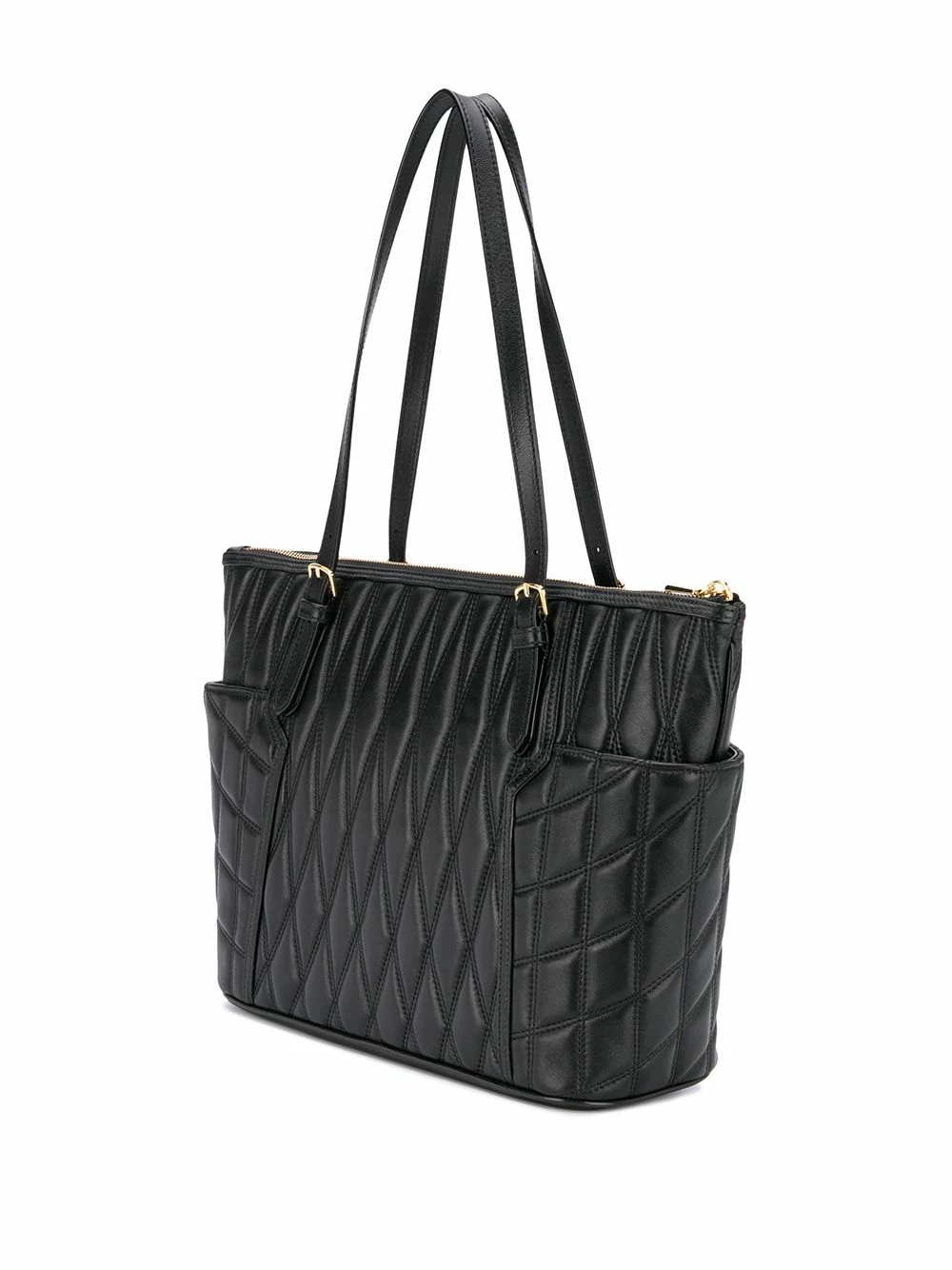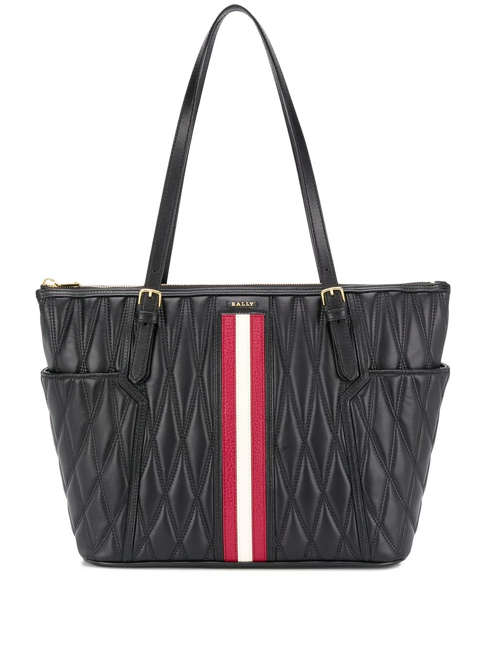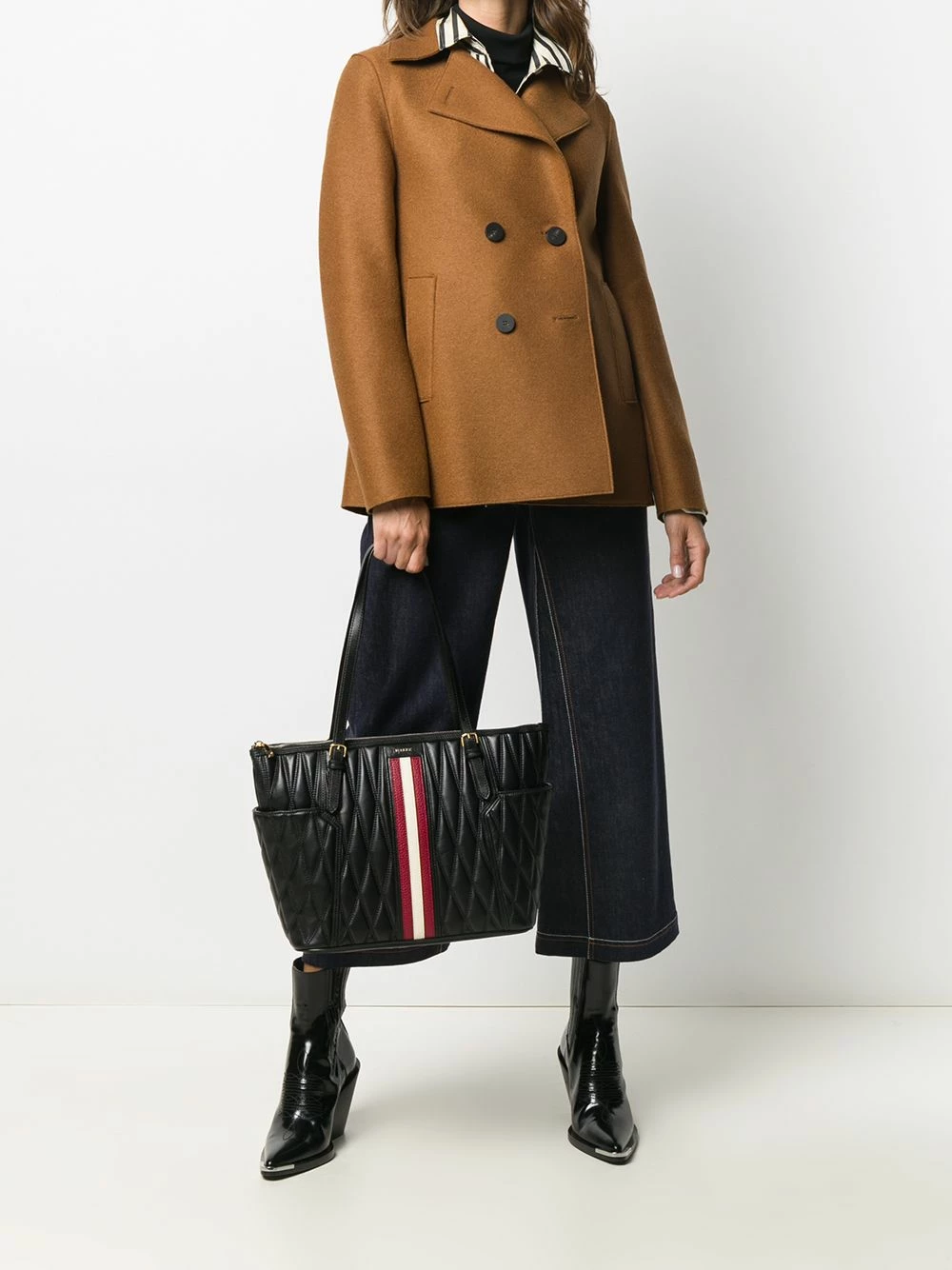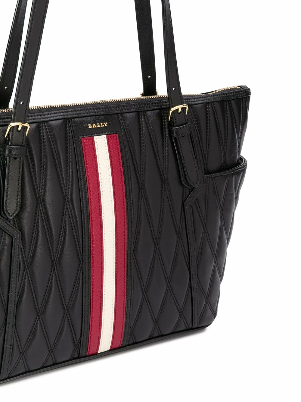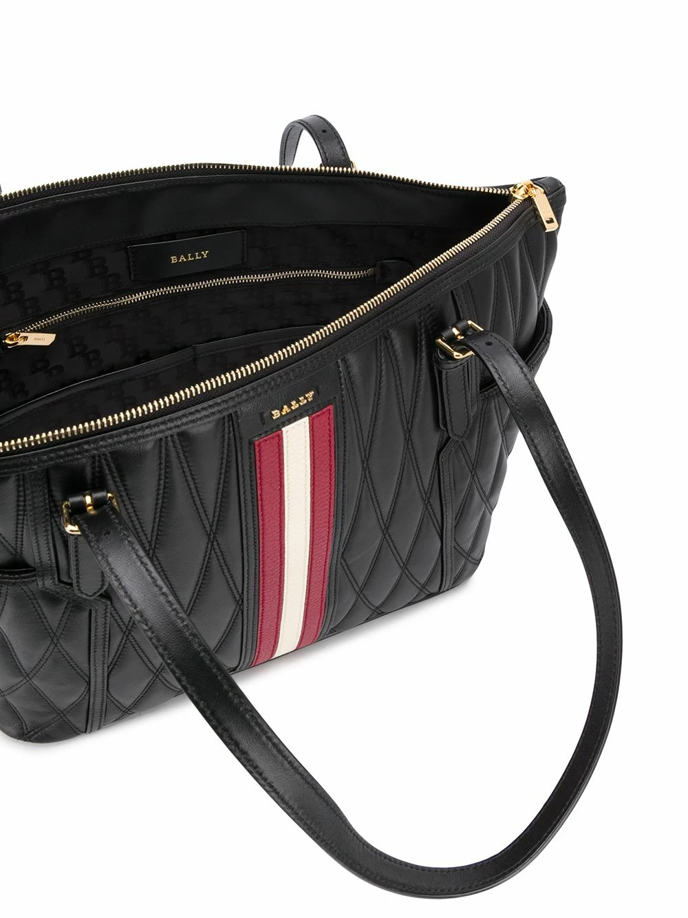 Plaque logo, détails rayés, finitions en métal doré, fermeture zippée sur le dessus, longues anses sur le dessus, poches latérales kangourou. Couleur : noir. Matière : cuir.