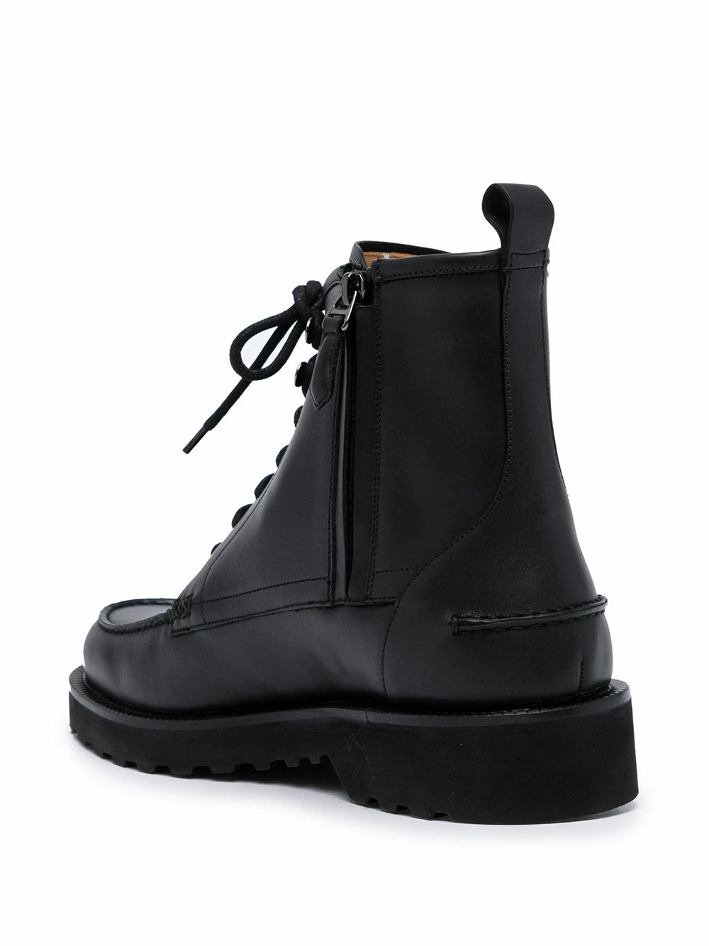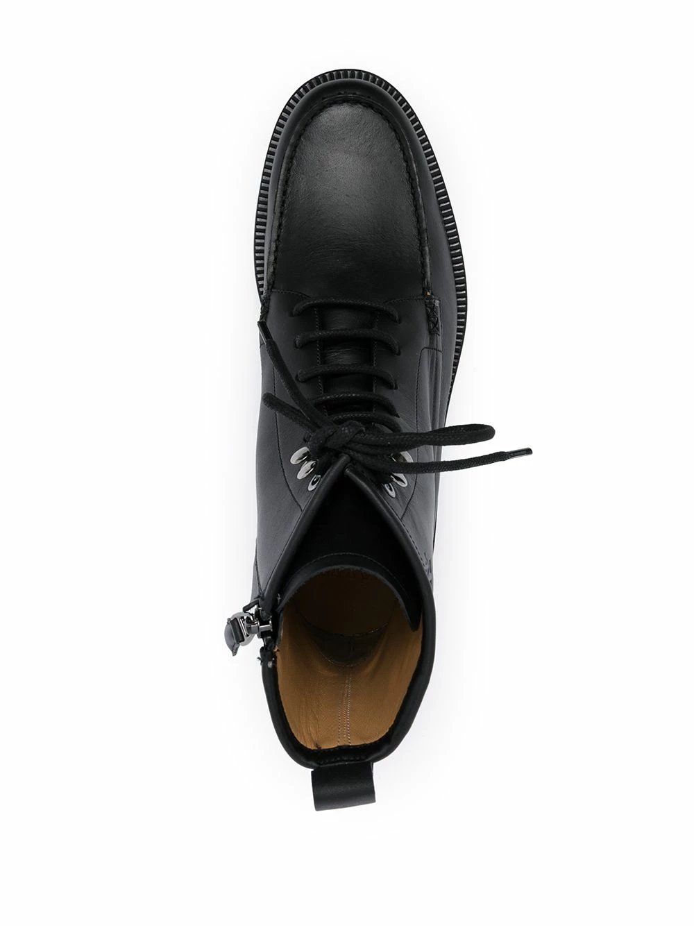 Fermeture à lacer sur le devant, bout rond, semelle plate, hauteur cheville, fermeture zippée sur le côté. Couleur : noir. Matière : cuir.
