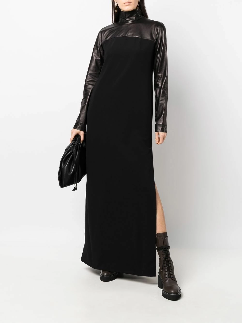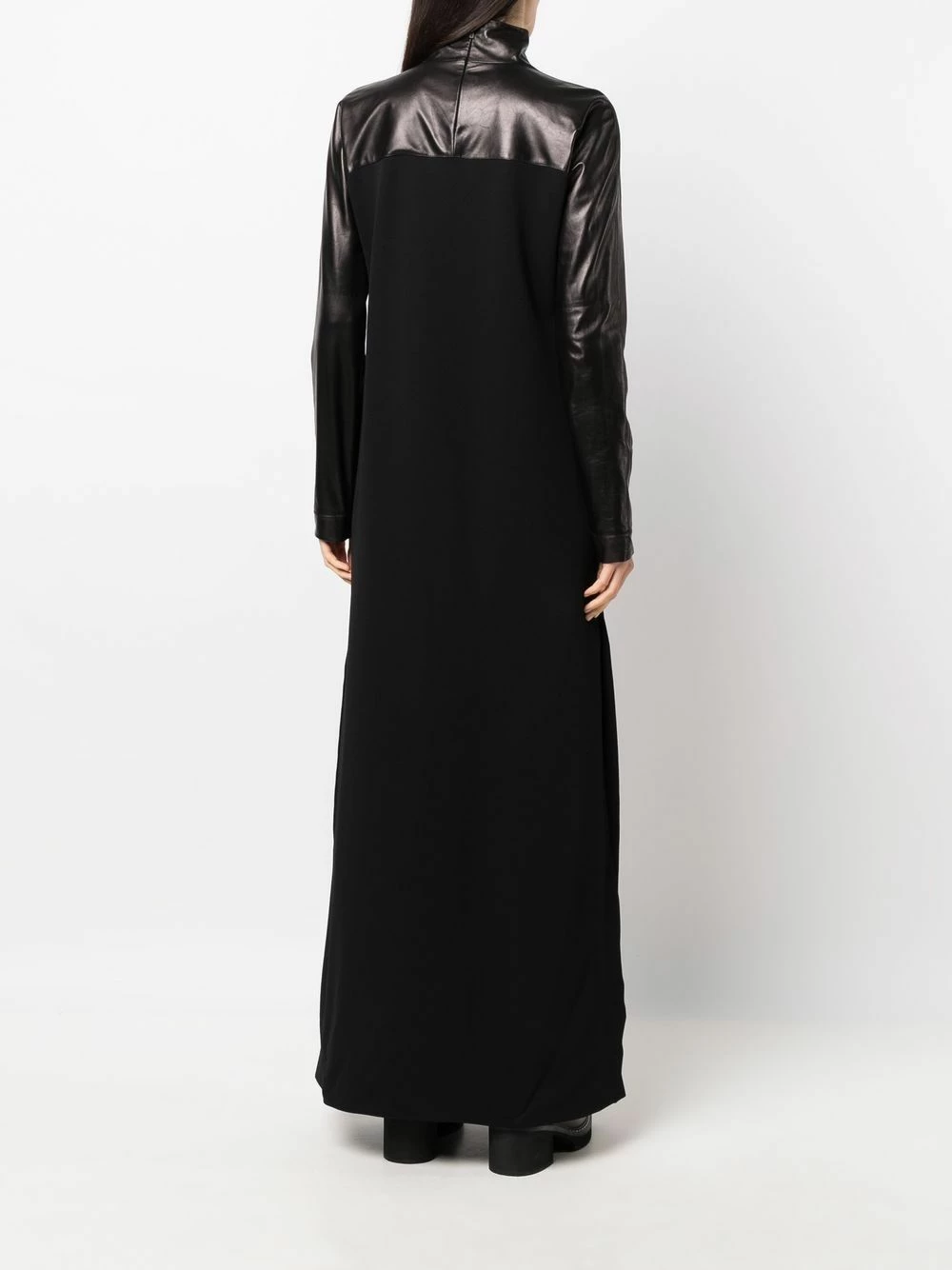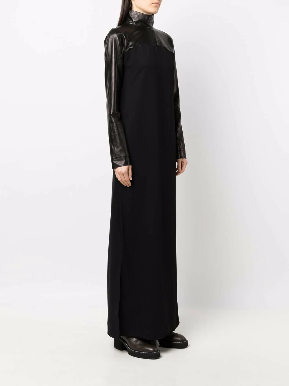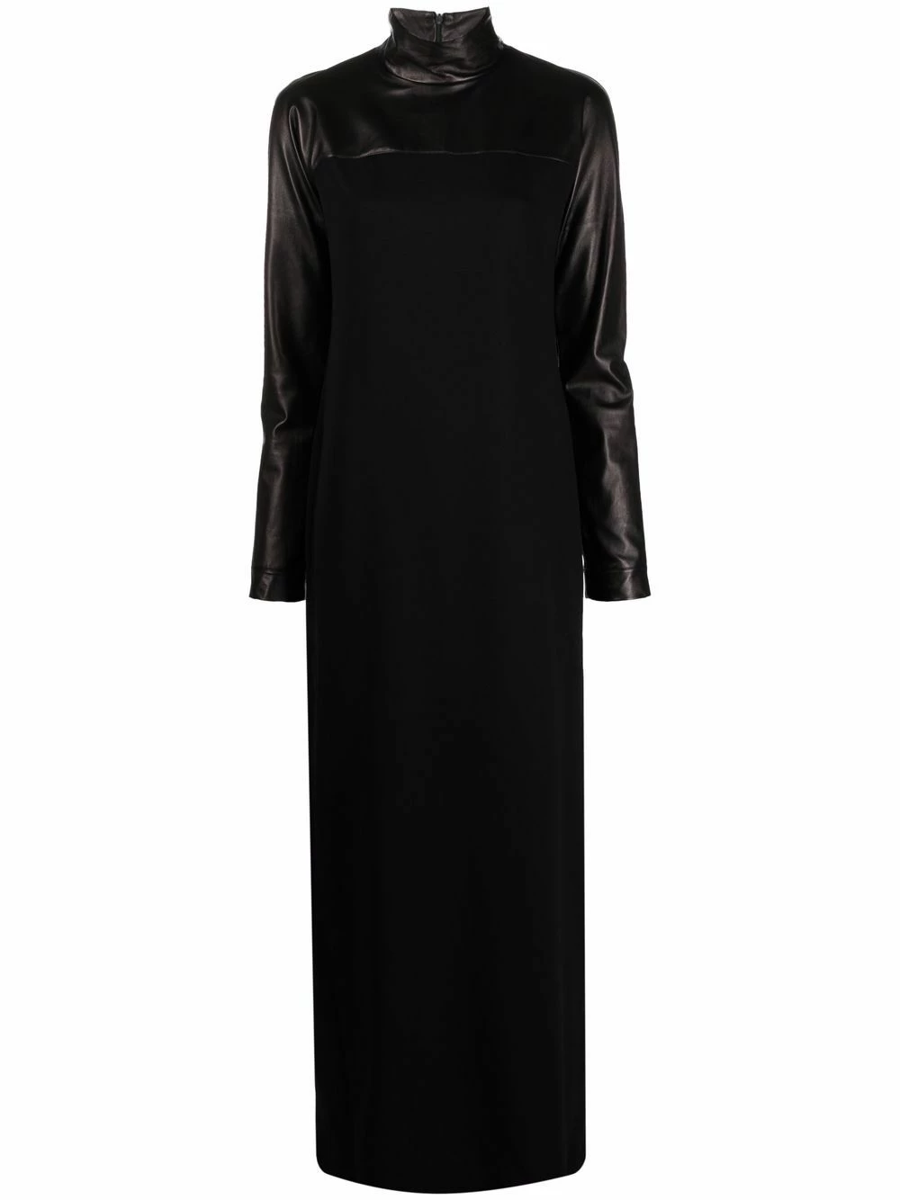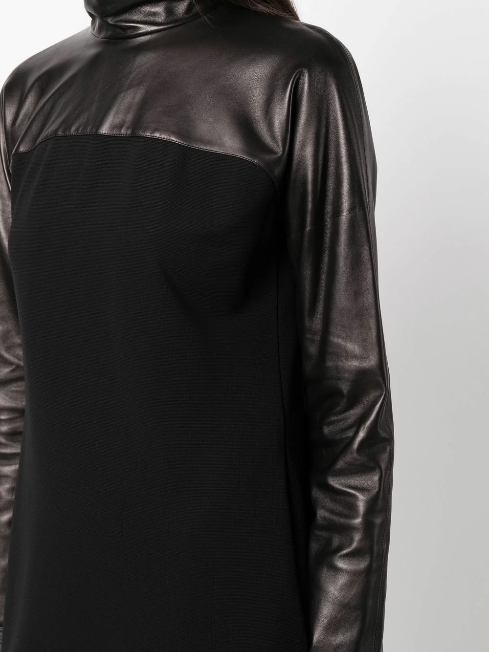 Col montant, design à empiècements, manches longues, coupe longue, fentes latérales. Couleur : noir. Matière : peau d’agneau.
