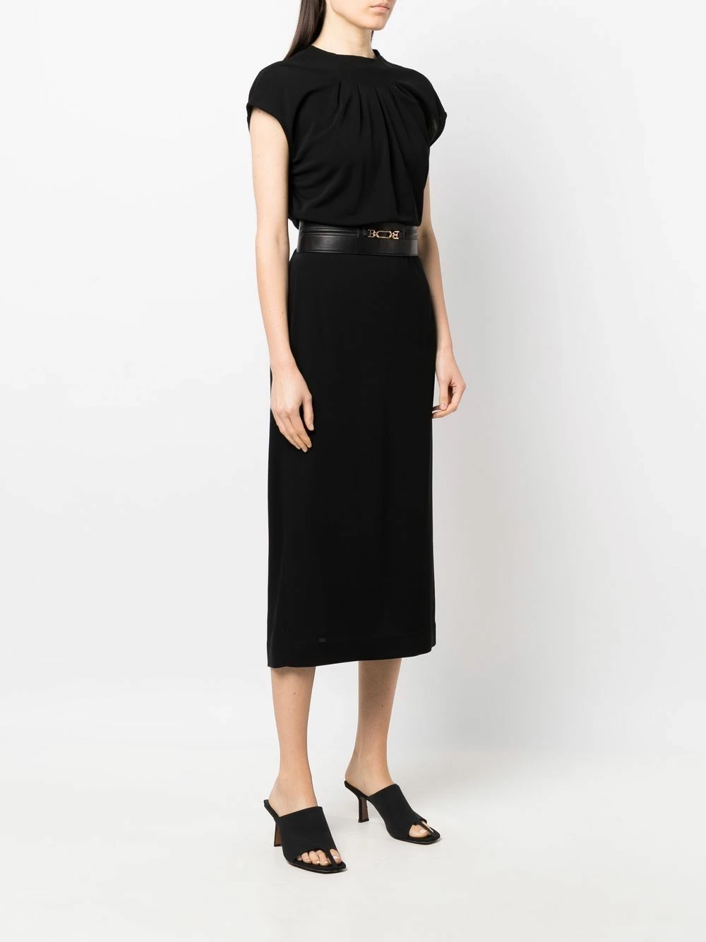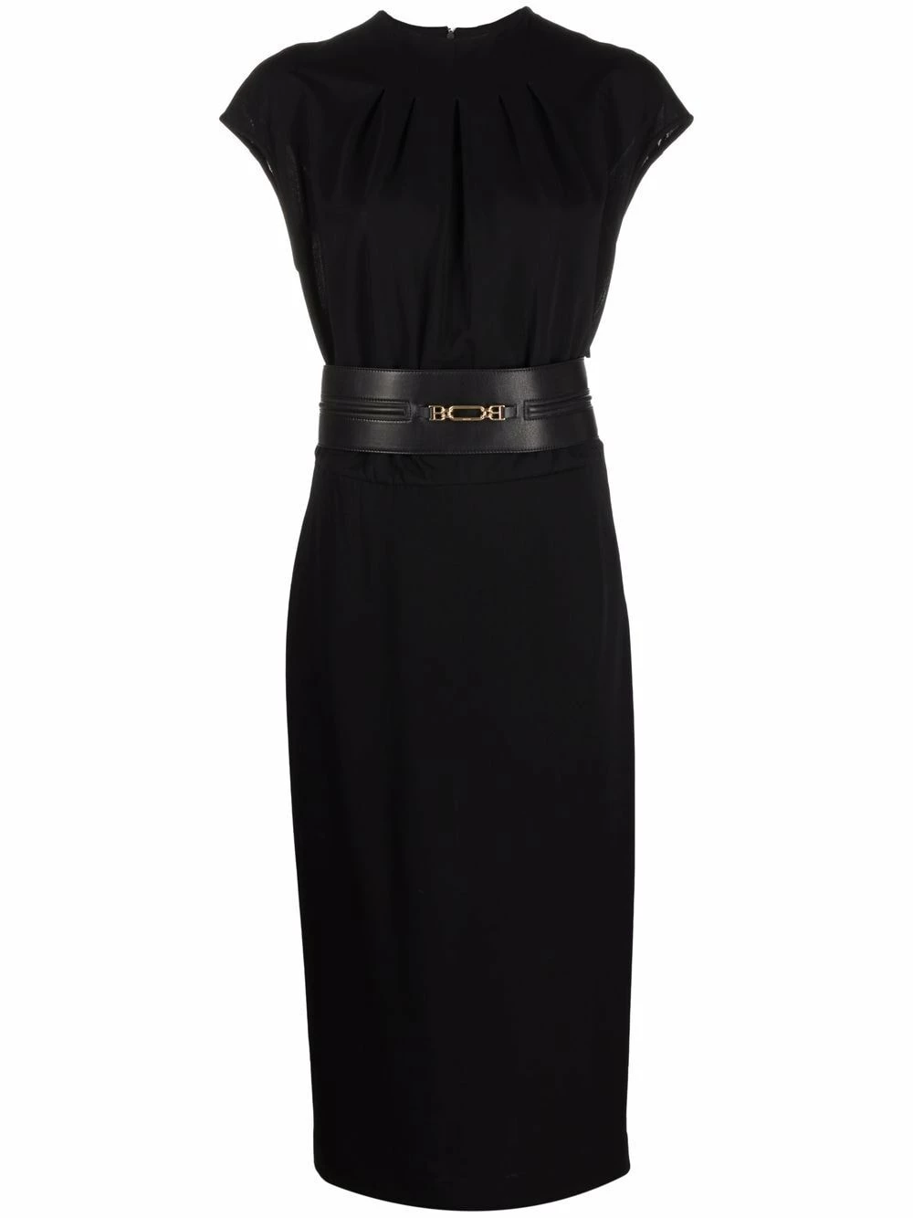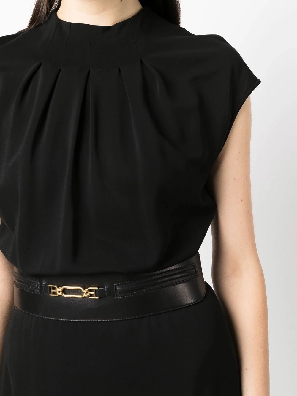 Taille ceinturée, plaque logo dorée, détails de fronces, encolure ras du cou, fermeture zippée à l’arrière, manches courtes, coupe mi-longue. Couleur : noir.